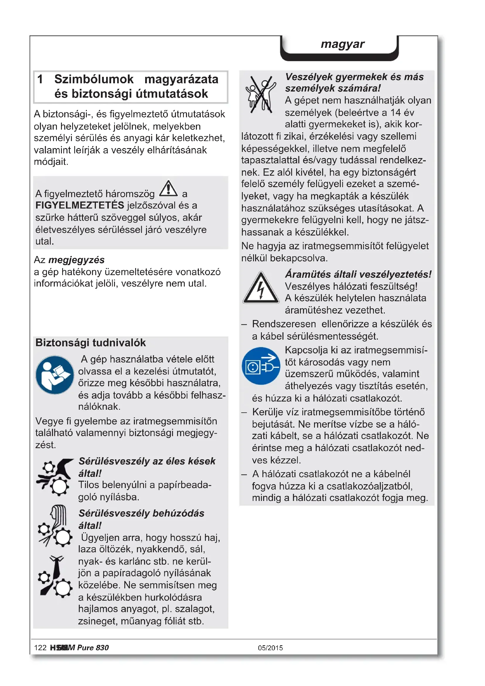 magyar 1 Szimbólumok magyarázata és biztonsági útmutatások A biztonsági-, és fi gyelmeztető útmutatások olyan helyzeteket jelölnek, melyekben személyi sérülés és anyagi kár keletkezhet, valamint leírják a veszély elhárításának módjait. Az megjegyzés a gép hatékony üzemeltetésére vonatkozó információkat jelöli, veszélyre nem utal. A fi gyelmeztető háromszög a FIGYELMEZTETÉS jelzőszóval és a szürke hátterű szöveggel súlyos, akár életveszélyes sérüléssel járó veszélyre utal. Biztonsági tudnivalók A gép használatba vétele előtt olvassa el a kezelési útmutatót, őrizze meg későbbi használatra, és adja tovább a későbbi felhasz- nálóknak. Vegye fi gyelembe az iratmegsemmisítőn található valamennyi biztonsági megjegy- zést. Sérülésveszély az éles kések által! Tilos belenyúlni a papírbeada- goló nyílásba. Sérülésveszély behúzódás által! Ügyeljen arra, hogy hosszú haj, laza öltözék, nyakkendő, sál, nyak- és karlánc stb. ne kerül- jön a papíradagoló nyílásának közelébe. Ne semmisítsen meg a készülékben hurkolódásra hajlamos anyagot, pl. szalagot, zsineget, műanyag fóliát stb. Veszélyek gyermekek és más személyek számára! A gépet nem használhatják olyan személyek (beleértve a 14 év alatti gyermekeket is), akik kor- látozott fi zikai, érzékelési vagy szellemi képességekkel, illetve nem megfelelő tapasztalattal és/vagy tudással rendelkez- nek. Ez alól kivétel, ha egy biztonságért felelő személy felügyeli ezeket a szemé- lyeket, vagy ha megkapták a készülék használatához szükséges utasításokat. A gyermekekre felügyelni kell, hogy ne játsz- hassanak a készülékkel. Ne hagyja az iratmegsemmisítőt felügyelet nélkül bekapcsolva. Áramütés általi veszélyeztetés! Veszélyes hálózati feszültség! A készülék helytelen használata áramütéshez vezethet. – Rendszeresen ellenőrizze a készülék és a kábel sérülésmentességét. Kapcsolja ki az iratmegsemmisí- tőt károsodás vagy nem üzemszerű működés, valamint áthelyezés vagy tisztítás esetén, és húzza ki a hálózati csatlakozót. – Kerülje víz iratmegsemmisítőbe történő bejutását. Ne merítse vízbe se a háló- zati kábelt, se a hálózati csatlakozót. Ne érintse meg a hálózati csatlakozót ned- ves kézzel. – A hálózati csatlakozót ne a kábelnél fogva húzza ki a csatlakozóaljzatból, mindig a hálózati csatlakozót fogja meg.05/2015 HSM Pure 830 123 magyar 2 Rendeltetésszerű használat, garancia Az iratmegsemmisítőre vonatkozó jótállás 2 év. Az iratmegsemmisítő HSM acél vágó- tengelyeire a szavatosságtól független, a készülék teljes élettartamára vonat- kozó garancia vonatkozik (HSM Lifetime Warranty). A kopásra ill. a szakszerűtlen kezelésből valamint harmadik személyek általi beavatkozásokból eredő károsodá- sokra sem a jótállás, sem a garancia nem vonatkozik. A HSM pótalkatrészek szállítását jelen modell gyártásának megszüntetésétől szá- mított legfeljebb 10 évig biztosítja. Az iratmegsemmisítő papír, valamint kisebb mennyiségű CD/DVD és hitel-/ügyfélkártya felaprítására való. A robusztus aprítókészülék tűzőgép- és gémkapcsokra érzéketlen. 3 Áttekintés Kezelő- és kijelzőelemek Kijelzések Hulladékgyűjtő megtelt Kijelzések nyitva Üzemkész Vissza-gomb Kijelzések Vágószerkezet reteszelődött Ajtó nyitva / Biztonsági elem megnyomva Kezelőgomb 1 Ajtó 2 Biztonsági tudnivalók 3 Fénysorompó 4 Kezelő- és kijelzőegység 5 Biztonsági elem 6 Adattábla 7 Hálózati kapcsoló 1 2 3 4 5 6 7124 HSM Pure 830 05/2015 magyar 4 Üzembe helyezés FIGYELMEZTETÉS Veszélyes hálózati feszültség! A készülék helytelen használata áramütés- hez vezethet. – Csak száraz, beltéri helyiségekben használja a készüléket. Soha ne hasz- nálja nedves helyiségekben vagy esőben. – Tartsa távol a készüléket, a hálózati csatlakozót és a hálózati kábelt nyílt lángoktól és forró felületektől. A szellő- zőnyílásoknak szabadon kell maradniuk, és az iratmegsemmisítőnek legalább 5 cm távolságra kell lennie a faltól vagy a bútoroktól. – Ügyeljen arra, hogy a hálózati csatla- kozó könnyen elérhető legyen. – A hálózati csatlakozódugó csatla- koztatása előtt ellenőrizze, hogy az elektromos hálózat feszültsége és frek- venciája megegyezik-e az adattábla adataival. 5 Kezelés