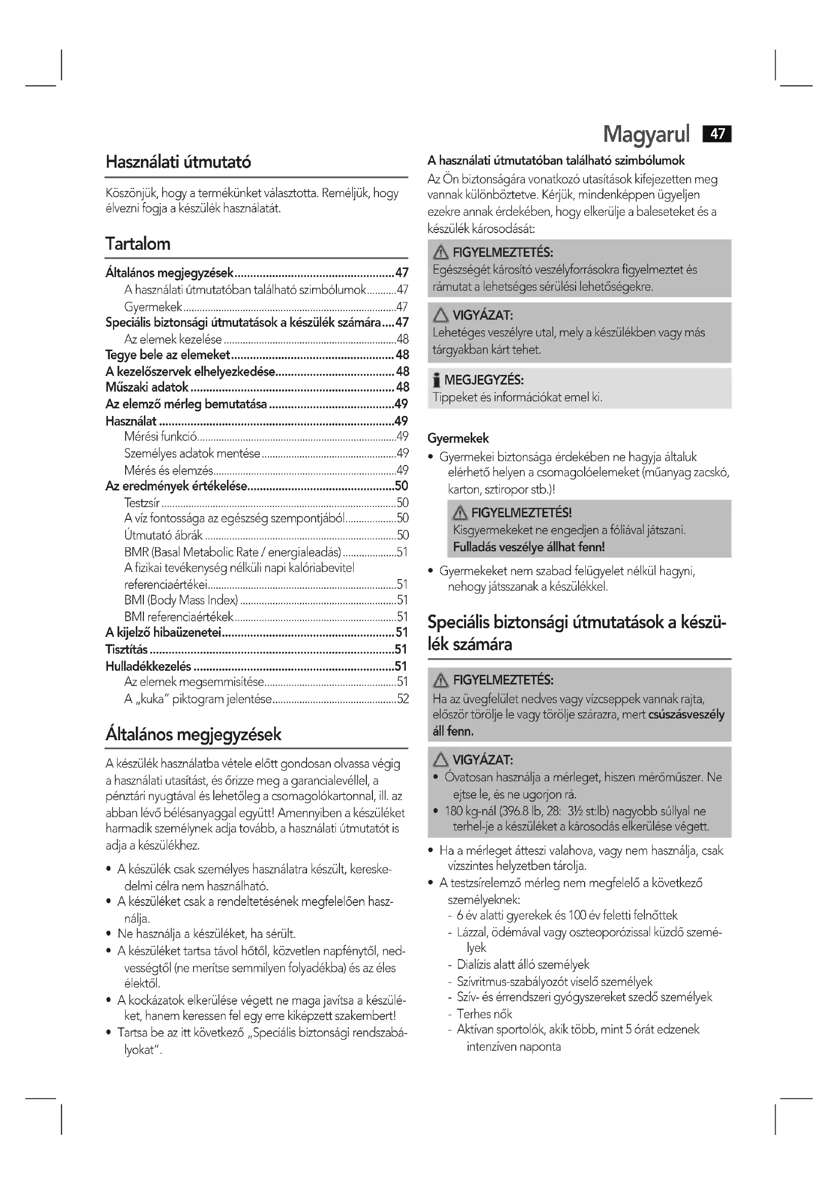 - Speciális biztonsági útmutatások a készülék számára p. 47