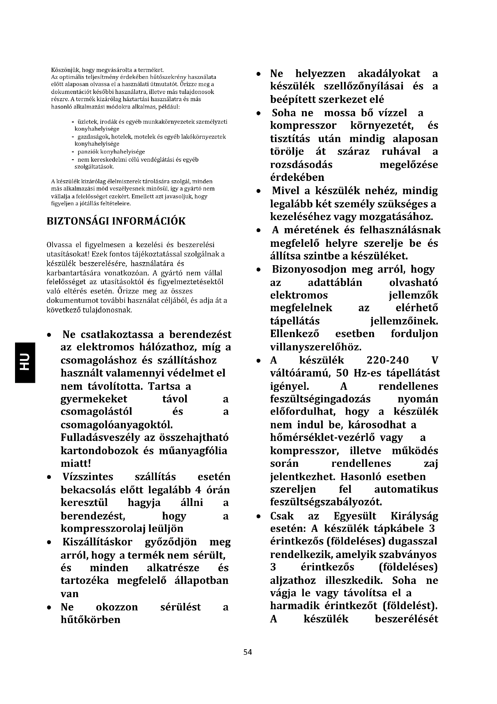 Olvassa el figyelmesen a kezelési és beszerelési utasításokat! Ezek fontos tájékoztatással szolgálnak a készülék beszerelésére, használatára és karbantartására vonatkozóan. A gyártó nem vállal felelősséget az utasításoktól és figyelmeztetésektől való eltérés esetén. Őrizze meg az összes dokumentumot további használat céljából, és adja át a következő tulajdonosnak. Ne csatlakoztassa a berendezést az elektromos hálózathoz, míg a csomagoláshoz és szállításhoz használt valamennyi védelmet el nem távolította. Tartsa a gyermekeket távol a csomagolástól és a csomagolóanyagoktól. Fulladásveszély az összehajtható kartondobozok és műanyagfólia miatt! Vízszintes szállítás esetén bekacsolás előtt legalább 4 órán keresztül hagyja állni a berendezést, hogy a kompresszorolaj leüljön Kiszállításkor győződjön meg arról, hogy a termék nem sérült, és minden alkatrésze és tartozéka megfelelő állapotban van Ne okozzon sérülést a hűtőkörben Ne helyezzen akadályokat a készülék szellőzőnyílásai és a beépített szerkezet elé Soha ne mossa bő vízzel a kompresszor környezetét, és tisztítás után mindig alaposan törölje át száraz ruhával a rozsdásodás megelőzése érdekében Mivel a készülék nehéz, mindig legalább két személy szükséges a kezeléséhez vagy mozgatásához. A méretének és felhasználásnak megfelelő helyre szerelje be és állítsa szintbe a készüléket. Bizonyosodjon meg arról, hogy az adattáblán olvasható elektromos jellemzők megfelelnek az elérhető tápellátás jellemzőinek. Ellenkező esetben forduljon villanyszerelőhöz. A készülék 220-240 V váltóáramú, 50 Hz-es tápellátást igényel. A rendellenes feszültségingadozás nyomán előfordulhat, hogy a készülék nem indul be, károsodhat a hőmérséklet-vezérlő vagy a kompresszor, illetve működés során rendellenes zaj jelentkezhet. Hasonló esetben szereljen fel automatikus feszültségszabályozót. Csak az Egyesült Királyság esetén: A készülék tápkábele 3 érintkezős (földeléses) dugasszal rendelkezik, amelyik szabványos 3 érintkezős (földeléses) aljzathoz illeszkedik. Soha ne vágja le vagy távolítsa el a harmadik érintkezőt (földelést). A készülék beszerélését