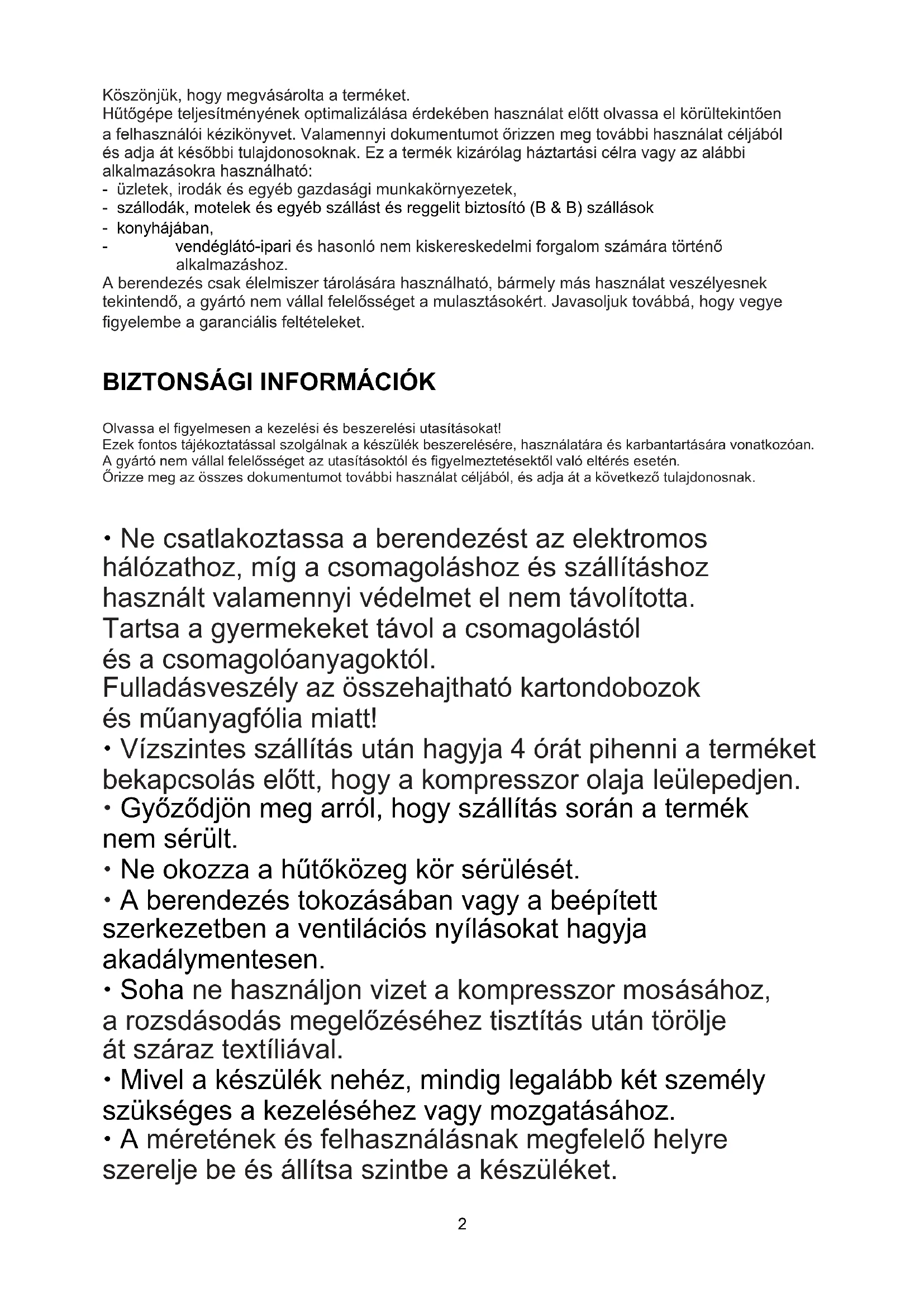Olvassa el figyelmesen a kezelési és beszerelési utasításokat! Ezek fontos tájékoztatással szolgálnak a készülék beszerelésére, használatára és karbantartására vonatkozóan. A gyártó nem vállal felelősséget az utasításoktól és figyelmeztetésektől való eltérés esetén. Őrizze meg az összes dokumentumot további használat céljából, és adja át a következő tulajdonosnak. Ne csatlakoztassa a berendezést az elektromos hálózathoz, míg a csomagoláshoz és szállításhoz használt valamennyi védelmet el nem távolította. Tartsa a gyermekeket távol a csomagolástól és a csomagolóanyagoktól. Fulladásveszély az összehajtható kartondobozok és műanyagfólia miatt! Vízszintes szállítás után hagyja 4 órát pihenni a terméket bekapcsolás előtt, hogy a kompresszor olaja leülepedjen. Győződjön meg arról, hogy szállítás során a termék nem sérült. Ne okozza a hűtőközeg kör sérülését. A berendezés tokozásában vagy a beépített szerkezetben a ventilációs nyílásokat hagyja akadálymentesen. Soha ne használjon vizet a kompresszor mosásához, a rozsdásodás megelőzéséhez tisztítás után törölje át száraz textíliával. Mivel a készülék nehéz, mindig legalább két személy szükséges a kezeléséhez vagy mozgatásához. A méretének és felhasználásnak megfelelő helyre szerelje be és állítsa szintbe a készüléket.3 Csak az Egyesült Királyság esetén: A készülék tápkábele 3 érintkezős (földeléses) dugasszal rendelkezik, amelyik szabványos 3 érintkezős (földeléses) aljzathoz illeszkedik. Soha ne vágja le vagy távolítsa el a harmadik érintkezőt (földelést). A készülék beszerelését követően a dugasznak hozzáférhetőnek kell maradnia. A főkábelek törése és sérülése érdekében ellenőrizze, hogy a főkábelek nem szorultak-e a berendezés alá a szállítás/mozgatás alatt és után. Ha a tápkábel megsérül, a veszély elkerülése érdekében cseréltesse ki a gyártóval, a gyártó szervizközpontjával vagy hasonlóan képzett szakemberrel. Ne telepítse a berendezést nedves, olajos vagy poros helyre, ne tegye ki közvetlen napfénynek és víznek. Ne telepítse a berendezést fűtő egységek vagy gyúlékony anyagok közelébe. A fagyasztó rekesszel rendelkező készülékek ESETÉN: áramkimaradás esetén ne nyissa ki az ajtót. A fagyasztott élelmiszer állaga várhatóan nem változik, ha az áramkimaradás az adattáblán található időtartamnál rövidebb időre terjed ki (Hőemelkedési idő). Ha a hiba ennél tovább tart, ellenőrizni kell az élelmiszert, azonnal el kell fogyasztani, vagy meg kell főzni, majd újból le kell fagyasztani. Ha azt észleli, hogy a készülék ajtója nehezen nyílik lezárást követően, ne aggódjon. Ez a nyomáskülönbség miatt van, mely kiegyenlítődik és néhány másodperc eltelte után lehetővé teszi az ajtó kinyitását. A készülékben ne tároljon gyógyszereket, baktériumokat vagy vegyszereket. A készülék háztartási felhasználásra készült, nem megfelelő szigorú tárolási hőmérséklet- tartományt igénylő anyagok tárolására. Bizonyosodjon meg arról, hogy az adattáblán olvasható elektromos jellemzők megfelelnek az elérhető tápellátás jellemzőinek. Ellenkező esetben forduljon villanyszerelőhöz.4 Ne húzza meg túlságosan a tápkábelt, ne érintse a csatlakozót nedves kézzel. A készülékben ne tároljon a gyúlékony hajtógázat tartalmazó termékeket (pl. spray palackok), illetve robbanékony összetevőket tartalmazó termékeket. Robbanásveszély! Ne helyezzen instabil cikkeket (nehéz tárgyakat, vízzel teli edényeket) a hűtőberendezés tetejére, elkerülve így a személyi sérüléseket, amiket ezen tárgyak leesése vagy a vízzel való érintkezés nyomán bekövetkező áramütés okozhat. Ne használjon elektromos berendezéseket az élelmiszer tároló rekeszben, kivéve a gyártó által jóváhagyott típust. Ne érintse meg a belső hűtőelemeket, különösen nedves kezekkel, így elkerülve a repedések kialakulását, illetve a sérüléseket. A kockázatnak leginkább a gyerekek, a korlátozott fizikai, mentális és érzékszervi képességekkel rendelkező személyek vannak kitéve, illetve a készülék biztonságos üzemeltetése ügyében elégtelen ismeretekkel rendelkezők. Bizonyosodjon meg arról, hogy a gyerekek és a veszélyeztetett személyek megértették a kockázatokat. A készüléket használó gyermekek és veszélyeztetett személyek biztonságáért felelős személynek útmutatást vagy felügyeletet kell biztosítania ezen felhasználóknak. A készüléket kizárólag 8 éves vagy annál idősebb gyermekek használhatják. Gyermekek nem játszhatnak a berendezéssel. A készülékből és készülékbe való be- és kirakodás 3 és 8 év közötti gyermekek számára engedélyezett. A fagyasztó rekesszel rendelkező készülékek ESETÉN: ne tároljon palackozott vagy egyéb edényekbe zárt folyadékokat (különösen szénsavas italokat) a fagyasztó rekeszben. A flakonok és palackok szétrepedhetnek! A fagyasztó rekesszel rendelkező készülékek ESETÉN: soha ne tegyen élelmiszert a fagyasztó rekeszből közvetlenül a szájába. Fagysérülések veszélye!5 A műanyag elemeket és az ajtótömítést tartsa olajtól és zsiradéktól mentesen. Ellenkező esetben a műanyag elemek és az ajtótömítés porózussá válnak. Bármilyen művelet előtt válassza le a berendezést az elektromos hálózatról. A kiolvasztási folyamat felgyorsításához csak a gyártó által javasolt mechanikai berendezéseket vagy egyéb eszközöket használja. Ne használjon hegyes vagy éles tárgyakat, kést vagy villát a jég eltávolításához. Ne használjon hajszárítót, elektromos fűtő egységeket vagy egyéb hasonló elektromos berendezést a kiolvasztáshoz. Javasoljuk, hogy tartsa a c