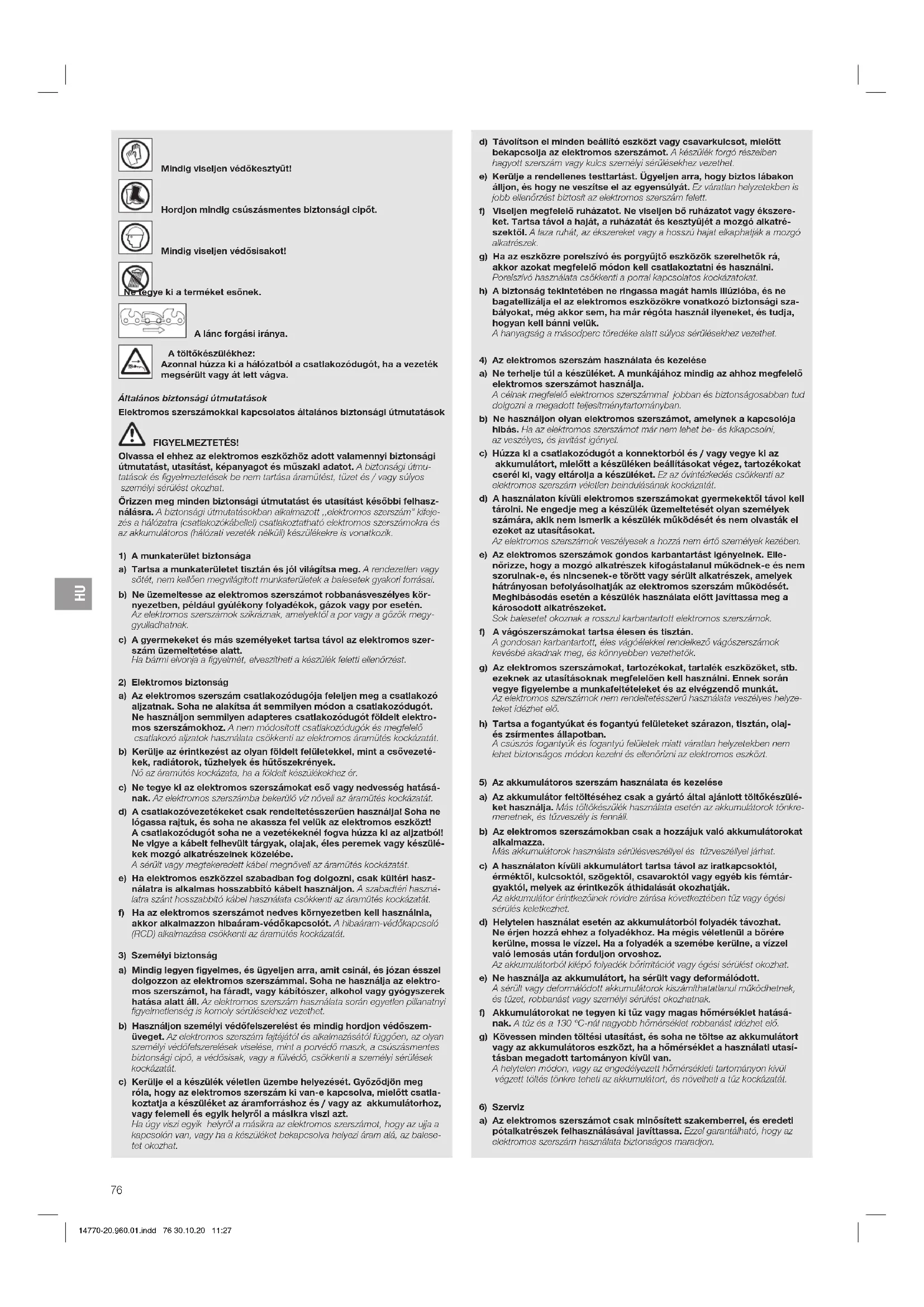 A lánc forgási iránya. A töltőkészülékhez: Azonnal húzza ki a hálózatból a csatlakozódugót, ha a vezeték megsérült vagy át lett vágva. Általános biztonsági útmutatások Elektromos szerszámokkal kapcsolatos általános biztonsági útmutatások FIGYELMEZTETÉS! Olvassa el ehhez az elektromos eszközhöz adott valamennyi biztonsági útmutatást, utasítást, képanyagot és műszaki adatot. A biztonsági útmu- tatások és figyelmeztetések be nem tartása áramütést, tüzet és / vagy súlyos személyi sérülést okozhat. Őrizzen meg minden biztonsági útmutatást és utasítást későbbi felhasz- nálásra. A biztonsági útmutatásokban alkalmazott ,,elektromos szerszám” kifeje- zés a hálózatra (csatlakozókábellel) csatlakoztatható elektromos szerszámokra és az akkumulátoros (hálózati vezeték nélküli) készülékekre is vonatkozik.
