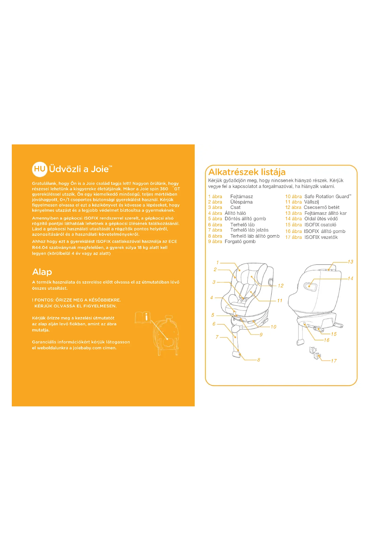 gyereküléssel utazik, Ön egy kiemelkedő minőségű, teljes mértékben jóváhagyott, 0+/1 csoportos biztonsági gyerekülést használ. Kérjük figyelmesen olvassa el ezt a kézikönyvet és kövesse a lépéseket, hogy kényelmes utazást és a legjobb védelmet biztosítsa a gyermekének.Amennyiben a gépkocsi ISOFIX rendszerrel szerelt, a gépkocsi alsó rögzítő pontjai láthatóak lehetnek a gépkocsi ülésének találkozásánál. Lásd a gépkocsi használati utasítását a rögzítők pontos helyéről, azonosításáról és a használati követelményekről.Ahhoz hogy ezt a gyerekülést ISOFIX csatlakozóval használja az ECE R44.04 szabványnak megfelelően, a gyerek súlya 18 kg alatt kell legyen (körülbelül 4 év vagy az alatt) Alap A termék használata és szerelése előtt olvassa el az útmutatóban lévő összes utasítást.! FONTOS: ŐRIZZE MEG A KÉSŐBBIEKRE. KÉRJÜK OLVASSA EL FIGYELMESEN.Kérjük őrizze meg a kezelési útmutatót az alap alján levő fiókban, amint az ábra mutatja.Garanciális információkért kérjük látogasson el weboldalunkra a joiebaby.com címen. Alkatrészek listája 1 ábra Fejtámasz2 ábra Üléspárna3 ábra Csat4 ábra Állító háló5 ábra Döntés állító gomb6 ábra Terhelő láb7 ábra Terhelő láb jelzés 8 ábra Terhelő láb állító gomb 9 ábra Forgató gomb10 ábra Safe Rotation Guard 11 ábra Vállszíj 12 ábra Csecsemő betét 13 ábra Fejtámasz állító kar14 ábra Oldal ütés védő15 ábra ISOFIX csatoló16 ábra ISOFIX állító gomb17 ábra ISOFIX vezetők Kérjük győződjön meg, hogy nincsenek hiányzó részek. Kérjük vegye fel a kapcsolatot a forgalmazóval, ha hiányzik valami.