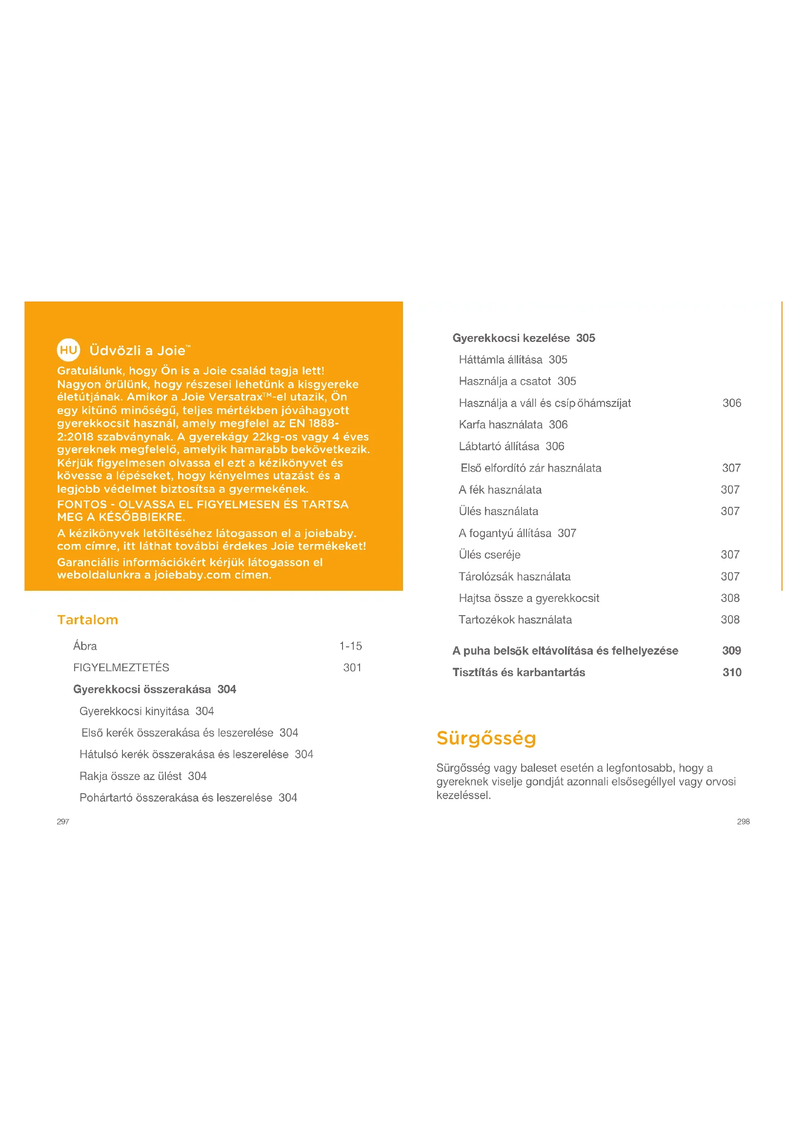 -el utazik, Ön egy kitűnő minőségű, teljes mértékben jóváhagyott gyerekkocsit használ, amely megfelel az EN 1888- 2:2018 szabványnak. A gyerekágy 22kg-os vagy 4 éves gyereknek megfelelő, amelyik hamarabb bekövetkezik. Kérjük figyelmesen olvassa el ezt a kézikönyvet és kövesse a lépéseket, hogy kényelmes utazást és a legjobb védelmet biztosítsa a gyermekének. FONTOS - OLVASSA EL FIGYELMESEN ÉS TARTSA MEG A KÉSŐBBIEKRE. A kézikönyvek letöltéséhez látogasson el a joiebaby. com címre, itt láthat további érdekes Joie termékeket! Garanciális információkért kérjük látogasson el weboldalunkra a joiebaby.com címen. Tartalom Ábra 1-15 FIGYELMEZTETÉS 301 Gyerekkocsi összerakása 304 Gyerekkocsi kinyitása 304 Els