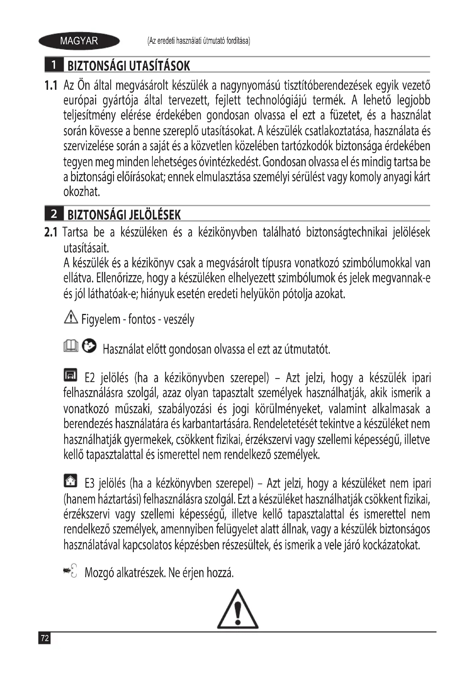 utasításait. A készülék és a kézikönyv csak a megvásárolt típusra vonatkozó szimbólumokkal van ellátva. Ellenőrizze, hogy a készüléken elhelyezett szimbólumok és jelek megvannak-e és jól láthatóak-e; hiányuk esetén eredeti helyükön pótolja azokat. Figyelem - fontos - veszély Használat előtt gondosan olvassa el ezt az útmutatót. E2 jelölés (ha a kézikönyvben szerepel) – Azt jelzi, hogy a készülék ipari felhasználásra szolgál, azaz olyan tapasztalt személyek használhatják, akik ismerik a vonatkozó műszaki, szabályozási és jogi körülményeket, valamint alkalmasak a berendezés használatára és karbantartására. Rendeletetését tekintve a készüléket nem használhatják gyermekek, csökkent fizikai, érzékszervi vagy szellemi képességű, illetve kellő tapasztalattal és ismerettel nem rendelkező személyek. E3 jelölés (ha a kézkönyvben szerepel) – Azt jelzi, hogy a készüléket nem ipari (hanem háztartási) felhasználásra szolgál. Ezt a készüléket használhatják csökkent fizikai, érzékszervi vagy szellemi képességű, illetve kellő tapasztalattal és ismerettel nem rendelkező személyek, amennyiben felügyelet alatt állnak, vagy a készülék biztonságos használatával kapcsolatos képzésben részesültek, és ismerik a vele járó kockázatokat. Mozgó alkatrészek. Ne érjen hozzá.73 MAGYAR (Az eredeti használati útmutató fordítása) 0 Kapcsoló „KI” állása I Kapcsoló „BE” állása Garantált hangteljesítményszint Tiltó jelzés, amely szerint bizonyos helyi szabályok tilthatják a termék ivóvízellátó hálózathoz történő csatlakoztatását. Veszélyre utaló jelzés, amely szerint nem szabad a vízsugarat emberekre, állatokra, elektromos berendezésekre vagy magára a termékre irányítani. A termék a II. érintésvédelmi osztályba tartozik. Ez azt jelenti, hogy megerősített vagy kettős szigeteléssel rendelkezik (csak ha a szimbólum a készüléken szerepel). A termék az I. érintésvédelmi osztályba tartozik. Ez azt jelenti, hogy földelő védővezetékkel rendelkezik (csak ha a szimbólum a készüléken szerepel). A termék megfelel a vonatkozó európai előírásoknak. E1 jelölés – Azt jelzi, hogy a berendezést tilos háztartási hulladékként kezelni; ehelyett új készülék vásárlása esetén a kereskedőnél leadható. A berendezés villamos és elektronikai alkatrészeit tilos nem megfelelő célra újból felhasználni, mert egészségre ártalmas anyagokat tartalmaznak. Viseljen hallásvédő eszközt. Viseljen védőmaszkot. Viseljen légzésvédő eszközt. Viseljen védőkesztyűt. Viseljen munkavédelmi lábbelit. Viseljen munkavédelmi ruházatot.74 MAGYAR (Az eredeti használati útmutató fordítása)