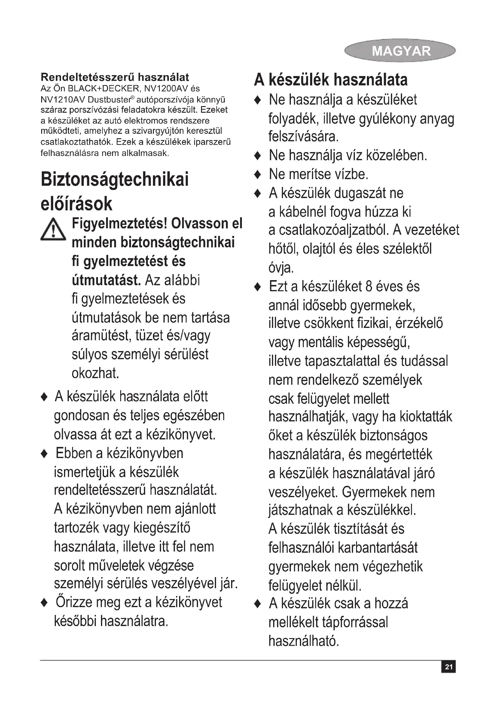 HASZNÁLATI ÚTMUTATÓ Dustbuster Auto NV1210AV BLACK & DECKER