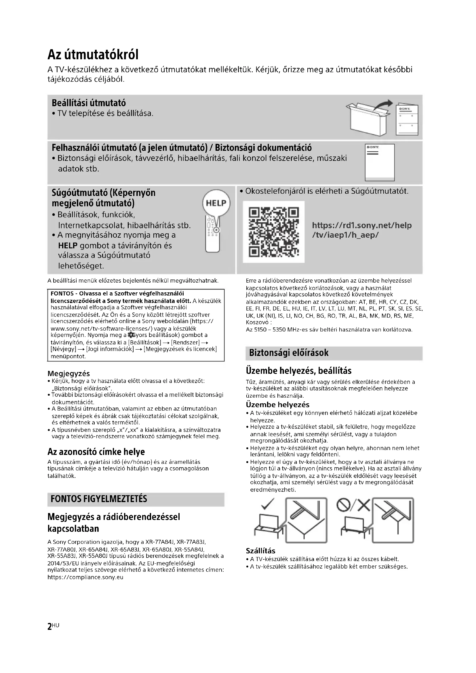 Megjegyzés a rádióberendezéssel kapcsolatban A Sony Corporation igazolja, hogy a XR-77A84J, XR-77A83J, XR-77A80J, XR-65A84J, XR-65A83J, XR-65A80J, XR-55A84J, XR-55A83J, XR-55A80J típusú rádiós berendezések megfelelnek a 2014/53/EU irányelv előírásainak. Az EU-megfelelőségi nyilatkozat teljes szövege elérhető a következő internetes címen: https://compliance.sony.euErre a rádióberendezésre vonatkozóan az üzembe helyezéssel kapcsolatos következő korlátozások, vagy a használat jóváhagyásával kapcsolatos következő követelmények alkalmazandók ezekben az országokban: AT, BE, HR, CY, CZ, DK, EE, FI, FR, DE, EL, HU, IE, IT, LV, LT, LU, MT, NL, PL, PT, SK, SI, ES, SE, UK, UK (NI), IS, LI, NO, CH, BG, RO, TR, AL, BA, MK, MD, RS, ME, Koszovó :Az 5150 – 5350 MHz-es sáv beltéri használatra van korlátozva. Biztonsági előírások Üzembe helyezés, beállítás Tűz, áramütés, anyagi kár vagy sérülés elkerülése érdekében a tv-készüléket az alábbi utasításoknak megfelelően helyezze üzembe és használja. Üzembe helyezés