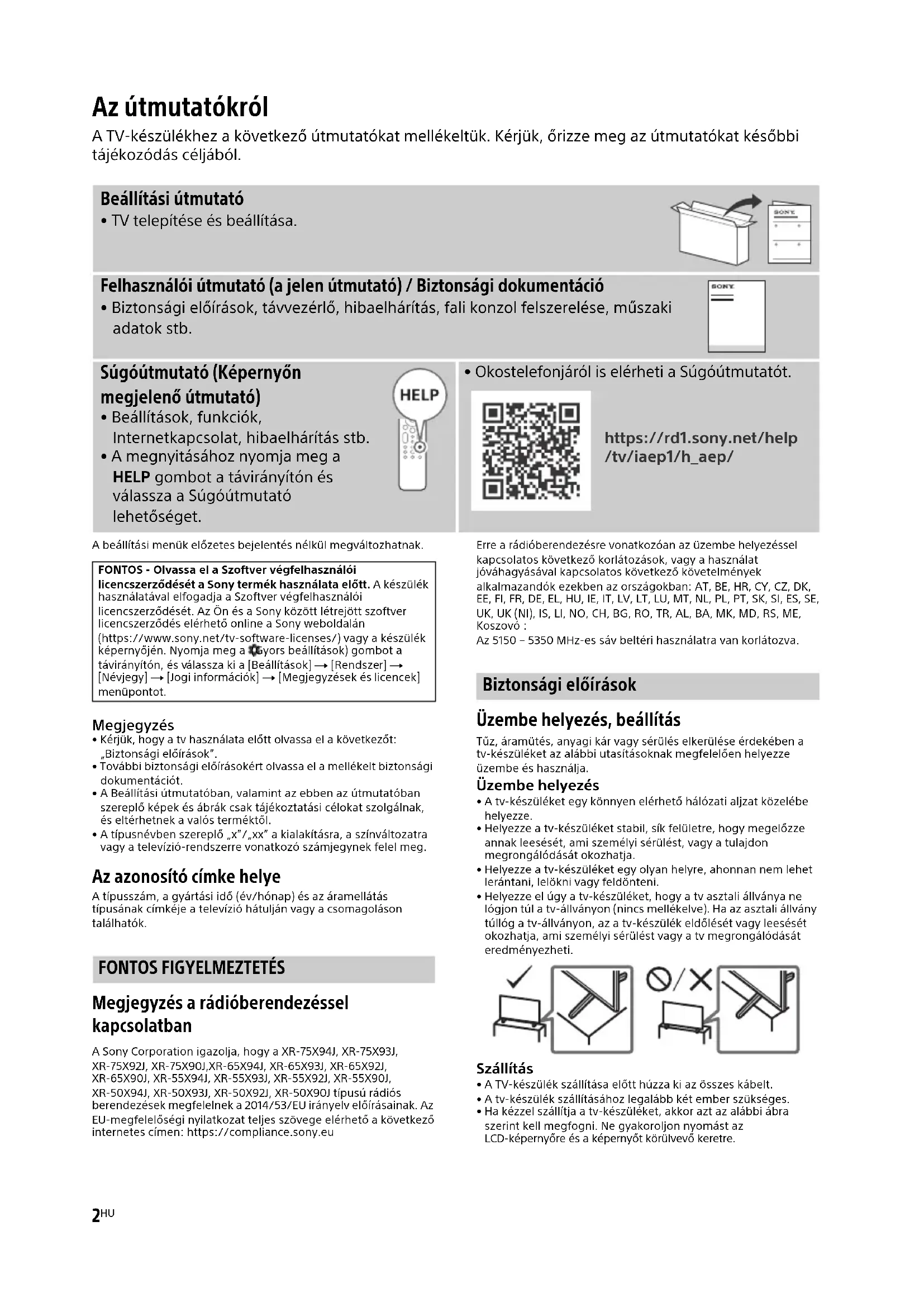 Megjegyzés a rádióberendezéssel kapcsolatban A Sony Corporation igazolja, hogy a XR-75X94J, XR-75X93J, XR-75X92J, XR-75X90J,XR-65X94J, XR-65X93J, XR-65X92J, XR-65X90J, XR-55X94J, XR-55X93J, XR-55X92J, XR-55X90J, XR-50X94J, XR-50X93J, XR-50X92J, XR-50X90J típusú rádiós berendezések megfelelnek a 2014/53/EU irányelv előírásainak. Az EU-megfelelőségi nyilatkozat teljes szövege elérhető a következő internetes címen: https://compliance.sony.euErre a rádióberendezésre vonatkozóan az üzembe helyezéssel kapcsolatos következő korlátozások, vagy a használat jóváhagyásával kapcsolatos következő követelmények alkalmazandók ezekben az országokban: AT, BE, HR, CY, CZ, DK, EE, FI, FR, DE, EL, HU, IE, IT, LV, LT, LU, MT, NL, PL, PT, SK, SI, ES, SE, UK, UK (NI), IS, LI, NO, CH, BG, RO, TR, AL, BA, MK, MD, RS, ME, Koszovó :Az 5150 – 5350 MHz-es sáv beltéri használatra van korlátozva. Biztonsági előírások Üzembe helyezés, beállítás Tűz, áramütés, anyagi kár vagy sérülés elkerülése érdekében a tv-készüléket az alábbi utasításoknak megfelelően helyezze üzembe és használja. Üzembe helyezés