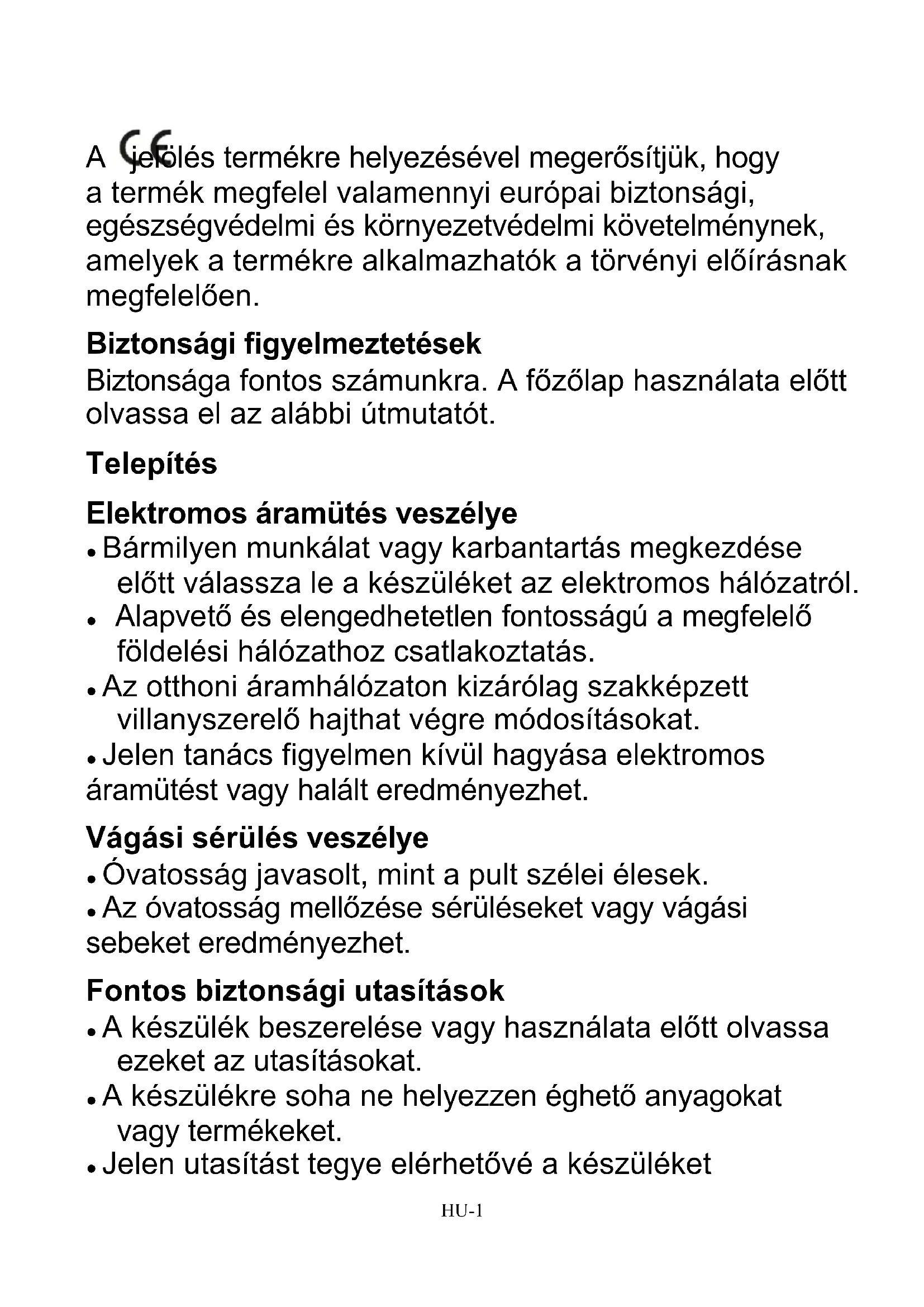 Uporabite posodo, katere dno je enakega premera kot oznaka na izbranem kuhališču.HU-1 A jelölés termékre helyezésével megerősítjük, hogy a termék megfelel valamennyi európai biztonsági, egészségvédelmi és környezetvédelmi követelménynek, amelyek a termékre alkalmazhatók a törvényi előírásnak megfelelően. Biztonsági figyelmeztetések Biztonsága fontos számunkra. A főzőlap használata előtt olvassa el az alábbi útmutatót. Telepítés Elektromos áramütés veszélye ● Bármilyen munkálat vagy karbantartás megkezdése előtt válassza le a készüléket az elektromos hálózatról. ● Alapvető és elengedhetetlen fontosságú a megfelelő földelési hálózathoz csatlakoztatás. ● Az otthoni áramhálózaton kizárólag szakképzett villanyszerelő hajthat végre módosításokat. ● Jelen tanács figyelmen kívül hagyása elektromos áramütést vagy halált eredményezhet. Vágási sérülés veszélye ● Óvatosság javasolt, mint a pult szélei élesek. ● Az óvatosság mellőzése sérüléseket vagy vágási sebeket eredményezhet. Fontos biztonsági utasítások ● A készülék beszerelése vagy használata előtt olvassa ezeket az utasításokat. ● A készülékre soha ne helyezzen éghető anyagokat vagy termékeket. ● Jelen utasítást tegye elérhetővé a készüléketHU-2 beszerelő szakember számára, mivel így előfordulhat, hogy csökkenthető a beszerelés költsége. ● A veszélyek elkerülése érdekében a készüléket kötelezően jelen beszerelési utasításoknak megfelelően szerelje be. ● A készülék megfelelő beszerelését és földelését kizárólag szakképzett szakember végezze. ● A készüléket kizárólag olyan hálózatra csatlakoztassa, amelyiknek részét képezi egy olyan szakaszoló, amelyik teljesen leválasztja a készüléket a tápellátásról. ● A készülék nem megfelelő beszerelése érvénytelenítheti az összes jótállási vagy felelősségvállalási igényt. Tisztítás és karbantartás Elektromos áramütés veszélye ● Ne főzzön törött vagy megrepedt főzőlapon. Ha a főzőlap felülete eltörött vagy megrepedt, azonnal kapcsolja ki a készüléket a hálózati tápellátásnál (fali kapcsolónál), és vegye fel a kapcsolatot egy szakképzett szakemberrel. ● Bármilyen tisztítás vagy karbantartás előtt kapcsolja le a főzőlapot fali kapcsolónál. ● Jelen tanács figyelmen kívül hagyása elektromos áramütést vagy halált eredményezhet. Egészségügyi veszélyek ● A készülék megfelel az elektromágneses biztonsági szabványoknak. Forró felület által jelentett veszélyHU-3