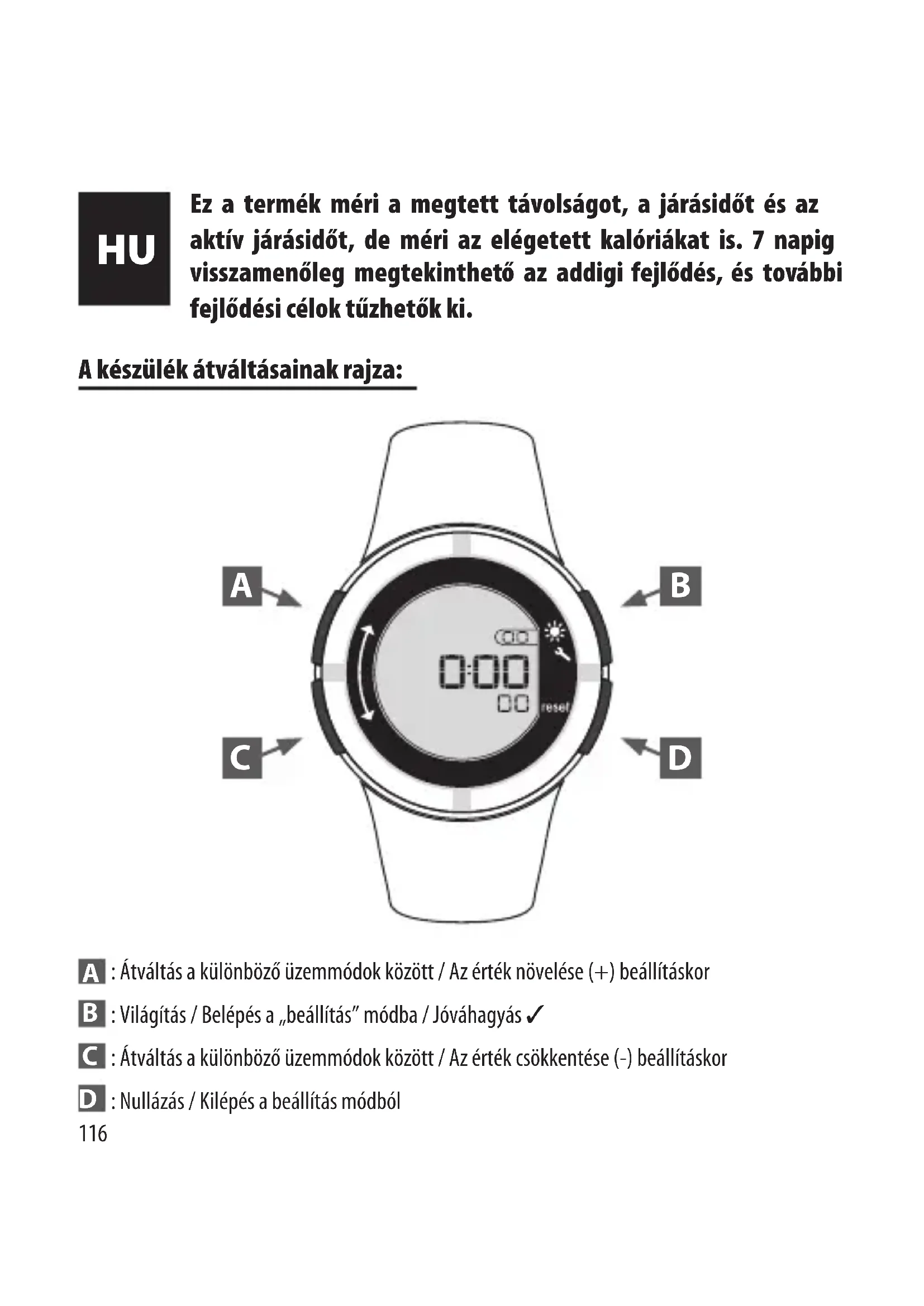 HASZNÁLAT Ez a lépésszámláló karóra arra alkalmas, hogy sík terepen járásának különböző paramétereit mérje. Műszakilag ezek a mérések úgy valósulnak meg, hogy a készülék érzékeli a láb talajjal törénő érzékelésekor keltett hullámokat. A lehető legpontosabb mérés érdekében azt javasoljuk, hogy a lépésszámláló karórát viselje a bal csuklón. Ez a termék nem futáshoz, dombvidéken vagy egyenetlen területeken való túrázásra szolgál, mert a mérés nagyon pontatlan lesz (a szintkülönbségeket nem veszi gyelembe). Laza vagy sáros terület egyébként körülbelül 5%-os pontatlanságot eredményez.