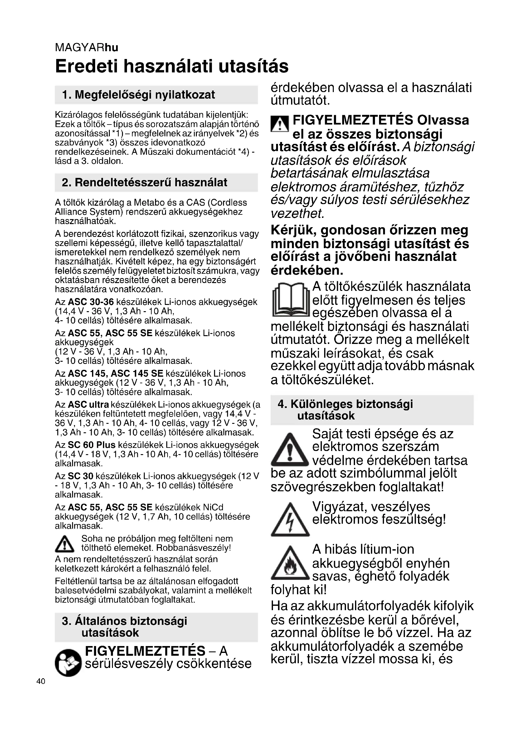Eredeti használati utasítás Kizárólagos felelősségünk tudatában kijelentjük: Ezek a töltők – típus és sorozatszám alapján történő azonosítással *1) – megfelelnek az irányelvek *2) és szabványok *3) összes idevonatkozó rendelkezéseinek. A Műszaki dokumentációt *4) - lásd a 3. oldalon. A töltők kizárólag a Metabo és a CAS (Cordless Alliance System) rendszerű akkuegységekhez használhatóak. A berendezést korlátozott fizikai, szenzorikus vagy szellemi képességű, illetve kellő tapasztalattal/ ismeretekkel nem rendelkező személyek nem használhatják. Kivételt képez, ha egy biztonságért felelős személy felügyeletet biztosít számukra, vagy oktatásban részesítette őket a berendezés használatára vonatkozóan. Az ASC 30-36 készülékek Li-ionos akkuegységek (14,4 V - 36 V, 1,3 Ah - 10 Ah,
