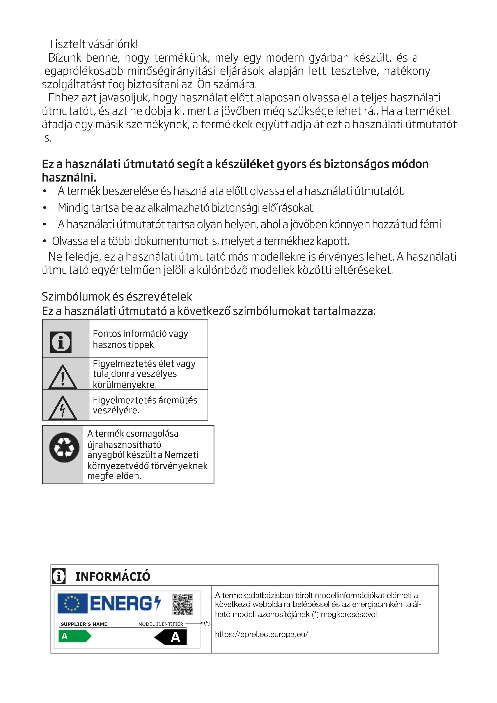 Fontos információ vagy hasznos tippek Figyelmeztetés élet vagy tulajdonra veszélyes körülményekre. Figyelmeztetés áremütés veszélyére.A termék csomagolása újrahasznosítható anyagból készült a Nemzeti környezetvédő törvényeknek megfelelően. INFORMÁCIÓ