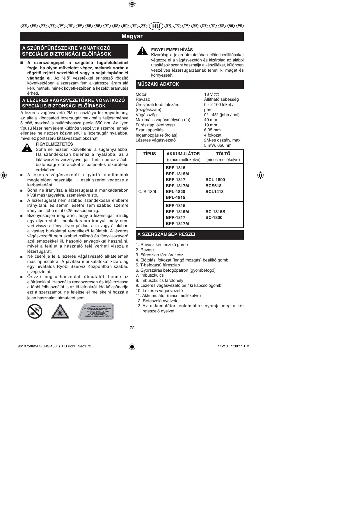 Kizárólag a jelen útmutatóban elírt beállításokat végezze el a vágásvezetn és kizárólag az alábbi utasítások szerint használja a készüléket, különben veszélyes lézersugárzásnak teheti ki magát és környezetét. A szerszámgépet a szigetel fogófelületeinél fogja, ha olyan mveletet végez, melynek során a rögzít rejtett vezetékkel vagy a saját tápkábelét vághatja el. Az “él” vezetékkel érintkez rögzít következtében a szerszám fém alkatrészei áram alá kerülhetnek, minek következtében a kezelt áramütés érheti. MSZAKI ADATOK Motor Ravasz Üresjárati fordulatszám (rezgésszám) Vágásszög Maximális vágásmélység (fa) F@részlap lökethossz Szár kapacitás Ingamozgás (eltolás) Lézeres vágásvezet A LÉZERES VÁGÁSVEZETKRE VONATKOZÓ SPECIÁLIS BIZTONSÁGI ELÍRÁSOK A lézeres vágásvezet 2M-es osztályú lézergyártmány, az általa kibocsátott lézersugár maximális teljesítménye 5 mW, maximális hullámhossza pedig 650 nm. Az ilyen típusú lézer nem jelent különös veszélyt a szemre, ennek ellenére ne nézzen közvetlenül a lézersugár nyalábba, mivel ez pontszer@ látásvesztést okozhat. FIGYELMEZTETÉS Soha ne nézzen közvetlenül a sugárnyalábba! Ha szándékosan belenéz a nyalábba, az a látásvesztés veszélyével jár. Tartsa be az alábbi biztonsági elírásokat a balesetek elkerülése érdekében. A lézeres vágásvezett a gyártó utasításinak megfelelen használja ill. ezek szerint végezze a karbantartást. Soha ne irányítsa a lézersugarat a munkadarabon kívül más tárgyakra, személyekre stb. A lézersugarat nem szabad szándékosan emberre irányítani, és semmi esetre sem szabad szemre irányítani több mint 0,25 másodpercig. Bizonyosodjon meg arról, hogy a lézersugár mindig egy olyan stabil munkadarabra irányul, mely nem veri vissza a fényt, ilyen például a fa vagy általában a vastag burkolattal rendelkez felületek. A lézeres vágásvezett nem szabad csillogó és fényvisszaver acéllemezekkel ill. hasonló anyagokkal használni, mivel a felület a használó felé verheti vissza a lézersugarat. Ne cserélje le a lézeres vágásvezet alkatelemeit más típusúakra. A javítási munkálatokat kizárólag egy hivatalos Ryobi Szerviz Központban szabad elvégeztetni. rizze meg a használati útmutatót, benne az elírásokkal. Használja rendszeresen és tájékoztassa a többi felhasználót is az itt leírtakról. Ha kölcsönadja ezt a szerszámot, ne felejtse el mellékelni hozzá a jelen használati útmutatót sem. TÍPUS CJS-180L AKKUMULÁTOR (nincs mellékelve) BPP-1815 BPP-1815M BPP-1817 BPP-1817M BPL-1820 BPL-1815 BPP-1815 BPP-1815M BPP-1817 BPP-1817M 18 V Állítható sebesség