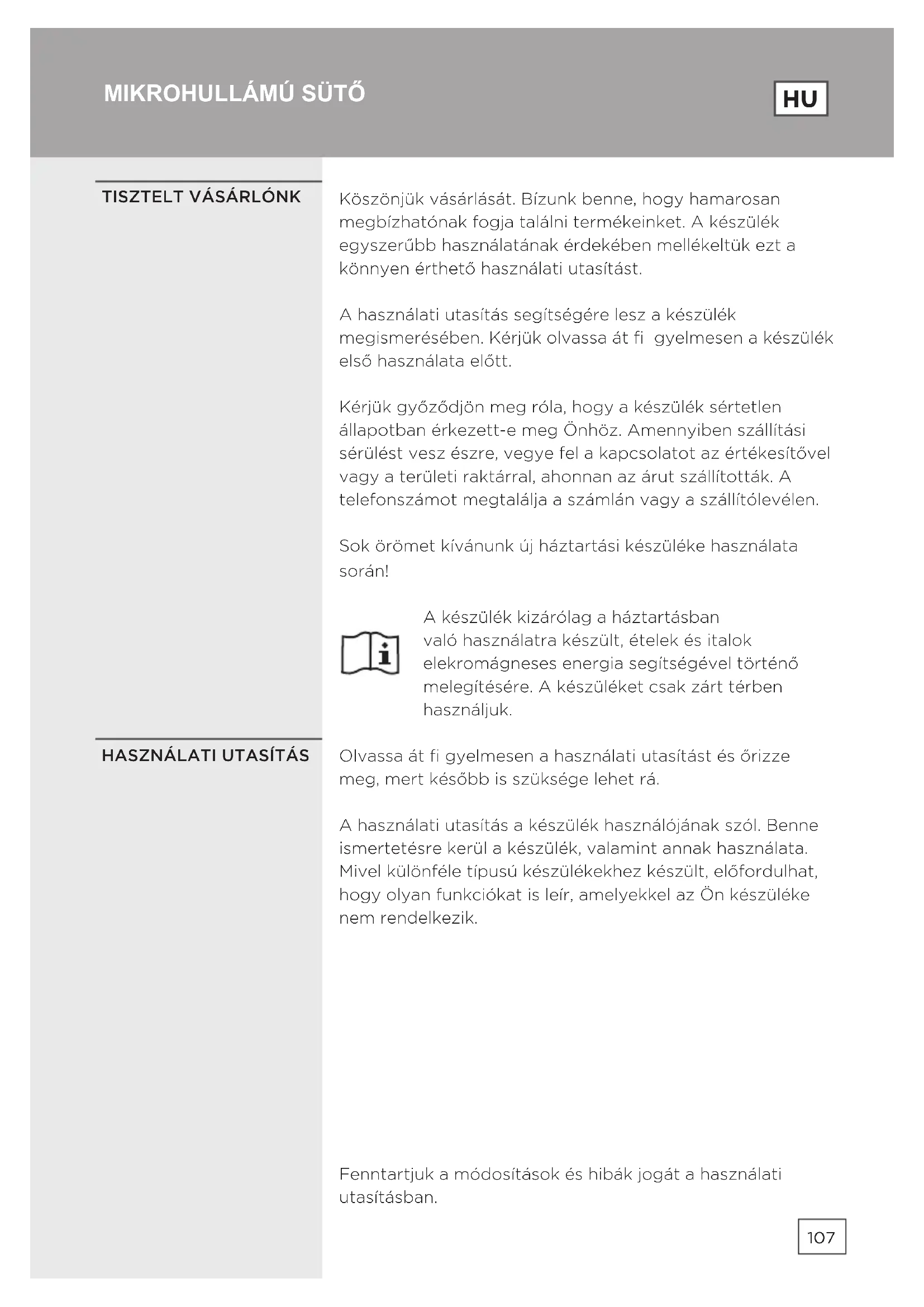 Köszönjük vásárlását. Bízunk benne, hogy hamarosan megbízhatónak fogja találni termékeinket. A készülék egyszerűbb használatának érdekében mellékeltük ezt a könnyen érthető használati utasítást. A használati utasítás segítségére lesz a készülék megismerésében. Kérjük olvassa át fi gyelmesen a készülék első használata előtt. Kérjük győződjön meg róla, hogy a készülék sértetlen állapotban érkezett-e meg Önhöz. Amennyiben szállítási sérülést vesz észre, vegye fel a kapcsolatot az értékesítővel vagy a területi raktárral, ahonnan az árut szállították. A telefonszámot megtalálja a számlán vagy a szállítólevélen. Sok örömet kívánunk új háztartási készüléke használata során! A készülék kizárólag a háztartásban való használatra készült, ételek és italok elekromágneses energia segítségével történő melegítésére. A készüléket csak zárt térben használjuk. Olvassa át fi gyelmesen a használati utasítást és őrizze meg, mert később is szüksége lehet rá. A használati utasítás a készülék használójának szól. Benne ismertetésre kerül a készülék, valamint annak használata. Mivel különféle típusú készülékekhez készült, előfordulhat, hogy olyan funkciókat is leír, amelyekkel az Ön készüléke nem rendelkezik. Fenntartjuk a módosítások és hibák jogát a használati utasításban.