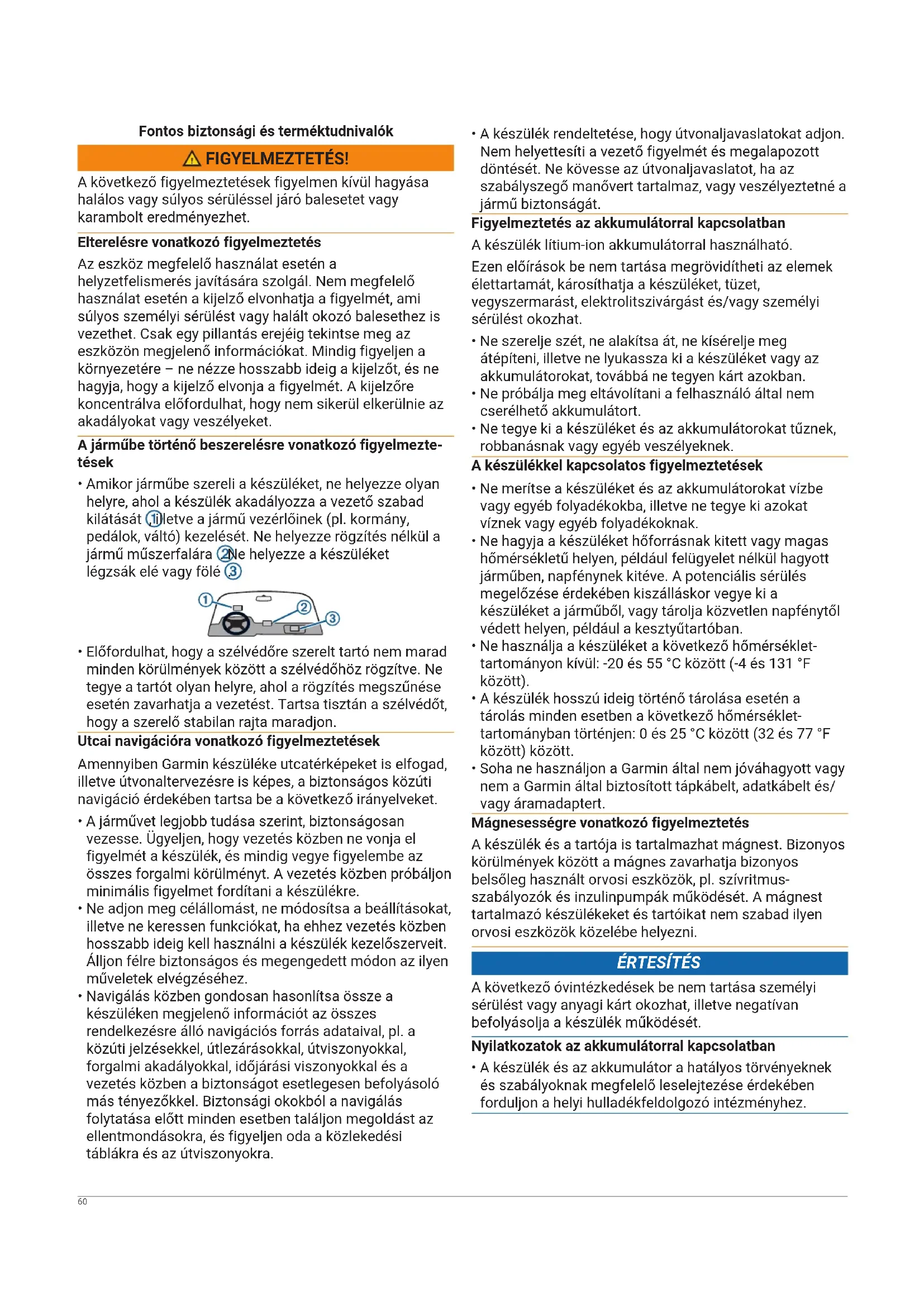 - A készülék és az akkumulátor a hatályos törvényeknek és szabályoknak megfelelő leselejtezése érdekében forduljon a helyi hulladékfeldolgozó intézményhez. 60Sebességkorlát-értesítés A sebességkorlátozási funkció csak tájékoztatási célt szolgál, és nem helyettesíti a vezető azzal kapcsolatos felelősségét, hogy betartson minden táblán jelzett sebességkorlátozást, illetve mindenkor józan ítélőképességét használva vezessen. Garmin nem tartozik felelősséggel semmilyen közlekedési bírságért vagy idézésért, amelyet Ön esetlegesen a kötelező közlekedési előírások és jelzések betartásának elmulasztása miatt kap. Mágnes-értesítés A készülék és a tartója is tartalmazhat mágnest. Bizonyos körülmények között a mágnes károsodást okozhat bizonyos elektromos eszközökben, pl. hordozható számítógépek merevlemezén. Legyen óvatos, amikor mágnest tartalmazó készülékek és a tartóik elektromos eszközök közelében vannak. GPS megjegyzés A navigációs eszköz gyengébb teljesítményt mutathat, ha a közelben más, bármely globális navigációs műholdas rendszer (GNSS) által használt frekvenciához közeli frekvenciát használó földfelszíni sugárzású hálózatot használó eszközök találhatók (pl. GPS). Az ilyen eszközök használata gyengítheti a GNSS-jelek vételi minőségét. A termék környezeti programjai A Garmin termékek újrahasznosítási programját a WEEE, RoHS, REACH, és más megfelelőségi programokkal együtt a www.garmin.com/aboutGarmin/environment webcímen találja. Megfelelőségi nyilatkozat A Garmin ezennel kijelenti, hogy a termék megfelel a 2014/53/EU irányelv előírásainak. Az EU megfelelőségi nyilatkozat teljes szövege a következő webhelyen tekinthető meg: www.garmin.com/compliance. Térképadatok Garmin kormányzati és magán adatforrásokat egyaránt használ. Gyakorlatilag minden adatforrás tartalmaz pontatlan vagy nem teljes adatot. Egyes országokban a teljes és pontos térképi információ vagy nem áll rendelkezésre, vagy csak riasztóan magas áron. Korlátozott garancia A JELEN KORLÁTOZOTT GARANCIA MEGHATÁROZOTT JOGOKKAL RUHÁZZA FEL ÖNT, MELYEK MELLETT EGYÉB, ÁLLAMONKÉNT (ILLETVE ORSZÁGONKÉNT VAGY MEGYÉNKÉNT) ELTÉRŐ JOGOKKAL IS RENDELKEZHET. A GARMIN NEM ZÁRJA KI, KORLÁTOZZA VAGY FÜGGESZTI FEL AZ ÖN ÁLLAMÁNAK (ORSZÁGÁNAK VAGY MEGYÉJÉNEK) TÖRVÉNYEI ÉRTELMÉBEN ÖNT MEGILLETŐ EGYÉB JOGOKAT. JOGAINAK TELJES KÖRŰ MEGÉRTÉSÉHEZ TÁJÉKOZÓDJON AZ ÁLLAMÁBAN, ORSZÁGÁBAN VAGY MEGYÉJÉBEN ÉRVÉNYES JOGSZABÁLYOKRÓL. A nem repüléssel kapcsolatos termékek minden anyag- vagy gyártási hiba tekintetében a beszerzés dátumától számított egyéves garanciával rendelkeznek. Ezen időszakon belül a Garmin saját döntése alapján gondoskodik a normál használat során meghibásodott alkatrészek javításáról vagy cseréjéről. Ilyen esetben a vásárlót alkatrész- és munkaköltség nem, kizárólag az esetleges szállítási költségek terhelik. Ez a korlátozott garancia nem vonatkozik a következőkre: (i) esztétikai sérülés, azaz karcolások, bevágások és horpadások; (ii) fogyóeszközök, azaz akkumulátorok és elemek, kivéve ha a termék meghibásodása anyag- vagy kidolgozási hiba következménye; (iii) baleset, rongálás, nem megfelelő használat, vízkár, árvíz, tűzvész vagy egyéb természeti vagy külső ok következtében fellépő károk; (iv) ha a kár oka szervizelés, amelyet nem a Garmin hivatalos szervize végzett; (v) ha a Garmin írásos engedélye nélkül módosított termékben keletkezett kár, vagy (vi) ha a károsodott termék csatlakoztatva volt áramforráshoz és/ vagy ha a felhasznált adatkábeleket nem a Garmin biztosította. Ezen felül a Garmin fenntartja a jogot a garanciakövetelés visszautasítására bármely ország törvényeit megsértve beszerzett, illetve használt termékek vagy szolgáltatások esetén.A Garmin termékek kizárólag segédeszközként alkalmazhatók, és nem használhatók irány, távolság, helyek vagy topográfia pontos meghatározására. A navigációs termékek esetében a Garmin nem vállal garanciát a térképadatok pontosságáért és teljességéért. A korlátozott garancia nem vonatkozik továbbá bármely Garmin navigációs termék teljesítményének gyengülésére, amennyiben az amiatt következett be, hogy a terméket olyan mobil készülék vagy más eszköz közelében használták, amely a globális navigációs műholdas rendszer (GNSS) által használt frekvenciához közeli frekvencián működő (pl. GPS) földfelszíni sugárzású hálózatot használ; ennek megfelelően a Garmin nem vállal felelősséget az ilyen esetekért. Az ilyen eszközök használata gyengítheti a GNSS-jelek vételi minőségét. A HATÁLYOS TÖRVÉNYEK ÁLTAL MAXIMÁLISAN MEGENGEDETT MÉRTÉKIG A JELEN KORLÁTOZOTT GARANCIA ÁLTAL MAGÁBAN FOGLALT VÁLLALÁSOK KIZÁRÓLAGOSAK ÉS FELÜLÍRNAK MINDEN EGYÉB VÁLLALÁST, ÉS A GARMIN KIFEJEZETTEN KIZÁR MINDEN EGYÉB VÁLLALÁST, LEGYEN SZÓ KIFEJEZETTRŐL, HALLGATÓLAGOSRÓL, A TÖRVÉNY ÁLTAL SZABÁLYOZOTTRÓL VAGY EGYÉBRŐL, IDEÉRTVE, DE NEM KIZÁRÓLAG BÁRMELY, ÉRTÉKESÍTÉSRE VAGY AZ ADOTT FELHASZNÁLÁSI CÉLRA VALÓ ALKALMASSÁGOT, VÁLLALÁST VAGY EGYÉB GARANCIÁT. A JELEN KORLÁTOZOTT GARANCIA MEGHATÁROZOTT JOGOKKAL RUHÁZZA FEL ÖNT, MELYEK MELLETT EGYÉB, ÁLLAMONKÉNT ÉS ORSZÁGONKÉNT ELTÉRŐ JOGOKKAL IS