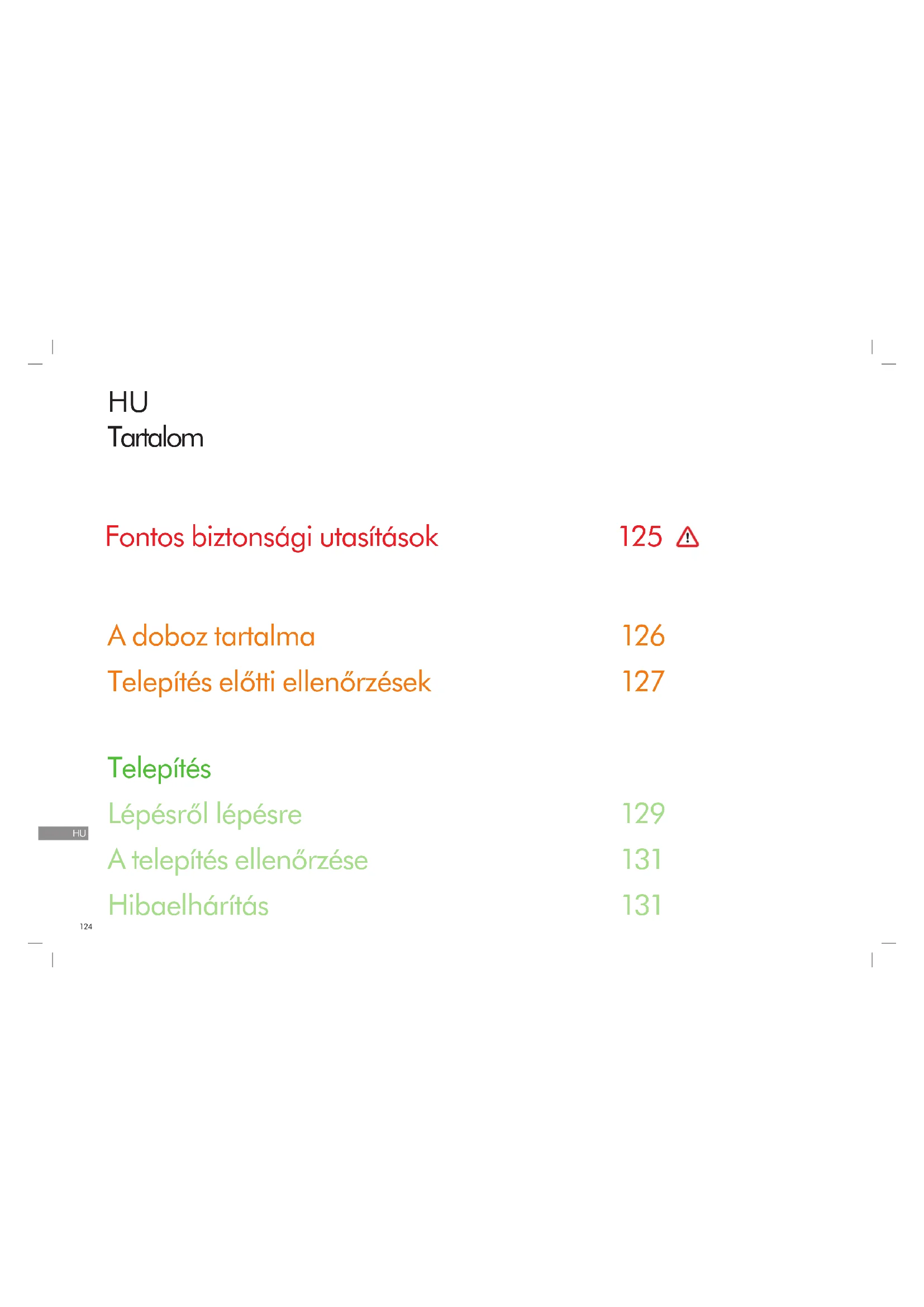 Fontos biztonsági utasítások A doboz tartalma Telepítés előtti ellenőrzések Telepítés Lépésről lépésre A telepítés ellenőrzése Hibaelhárítás