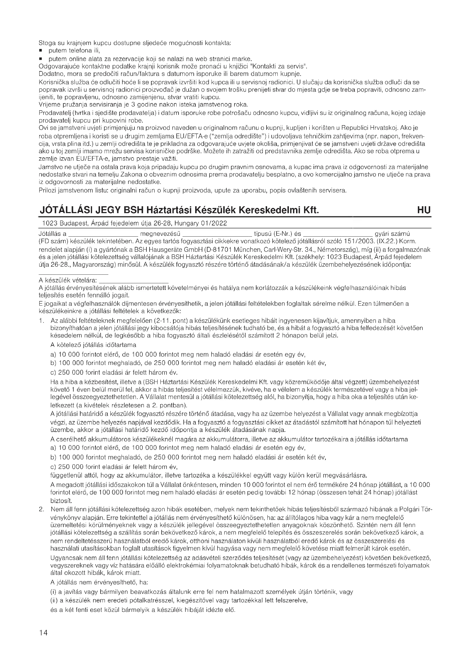 1023 Budapest, Árpád fejedelem útja 26-28, Hungary 01/2022 Jótállás a ____________________ megnevezésű ____________________ típusú (E-Nr.) és ____________________ gyári számú (FD szám) készülék tekintetében. Az egyes tartós fogyasztási cikkekre vonatkozó kötelező jótállásról szóló 151/2003. (IX.22.) Korm. rendelet alapján (i) a gyártónak a BSH Hausgeräte GmbH (D-81701 München, Carl-Wery-Str. 34., Németország), míg (ii) a forgalmazónak és a jelen jótállási kötelezettség vállalójának a BSH Háztartási Készülék Kereskedelmi Kft. (székhely: 1023 Budapest, Árpád fejedelem útja 26-28., Magyarország) minősül. A készülék fogyasztó részére történő átadásának/a készülék üzembehelyezésének időpontja: