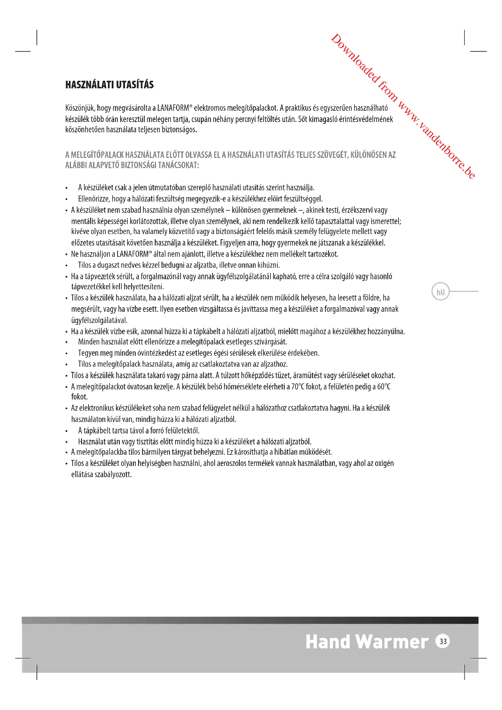 Köszönjük, hogy megvásárolta a LANAFORM® elektromos melegítőpalackot. A praktikus és egyszerűen használható készülék több órán keresztül melegen tartja, csupán néhány percnyi feltöltés után. Sőt kimagasló érintésvédelmének köszönhetően használata teljesen biztonságos. A MELEGÍTŐPALACK HASZNÁLATA ELŐTT OLVASSA EL A HASZNÁLATI UTASÍTÁS TELJES SZÖVEGÉT, KÜLÖNÖSEN AZ ALÁBBI ALAPVETŐ BIZTONSÁGI TANÁCSOKAT: