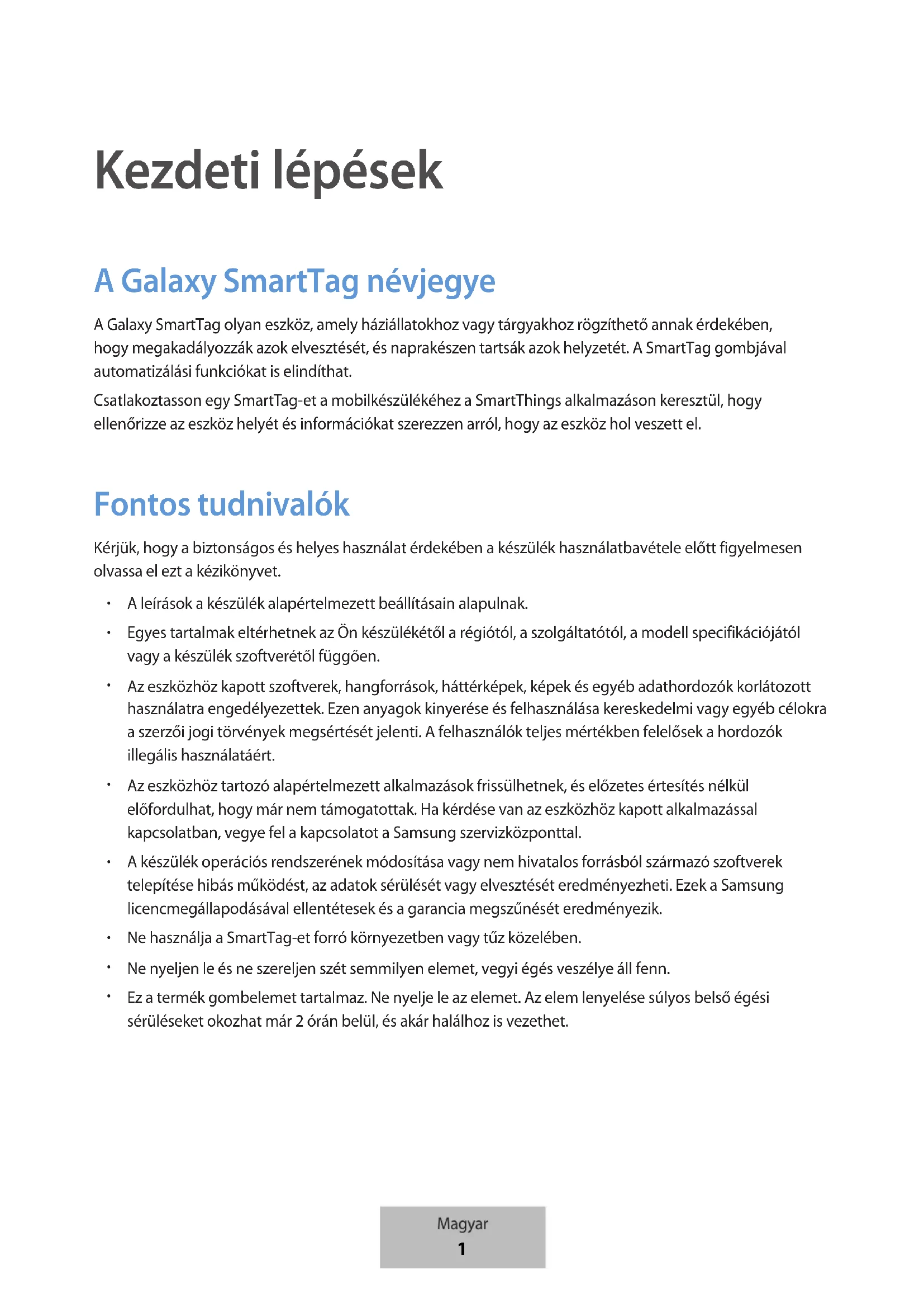Kezdeti lépések A Galaxy SmartTag névjegye A Galaxy SmartTag olyan eszköz, amely háziállatokhoz vagy tárgyakhoz rögzíthető annak érdekében, hogy megakadályozzák azok elvesztését, és naprakészen tartsák azok helyzetét. A SmartTag gombjával automatizálási funkciókat is elindíthat. Csatlakoztasson egy SmartTag-et a mobilkészülékéhez a SmartThings alkalmazáson keresztül, hogy ellenőrizze az eszköz helyét és információkat szerezzen arról, hogy az eszköz hol veszett el. Fontos tudnivalók Kérjük, hogy a biztonságos és helyes használat érdekében a készülék használatbavétele előtt figyelmesen olvassa el ezt a kézikönyvet.