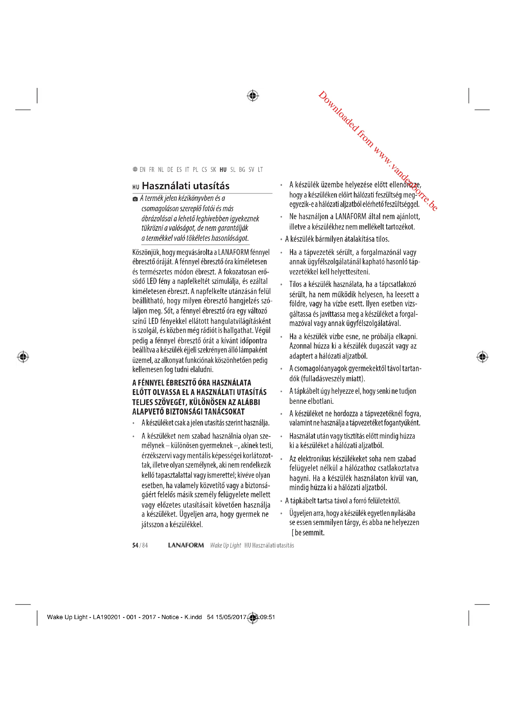 Spoločnosť LANAFORM sa zaručuje, že tento výrobok je bez akejkoľvek chyby materiálu či spracovania, a to od dátumu predaja po dobu dvoch rokov, s výnimkou nižšie uvedených prípadov. Záruka spoločnosti LANAFORM sa nevzťahuje na škody spôsobené bežným používaním tohto výrobku. Okrem iného sa záruka v rámci tohto výroku spoloč- nosti LANAFORM nevzťahuje na škody spôsobené chybným nebo nevhodným používaním či akým- koľvek chybným užívaním, nehodou, pripojením nedovolených doplnkov, zmenou realizovanou na výrobku či iným zásahom akejkoľvek povahy, na ktorý nemá spoločnosť LANAFORM vplyv. Spoločnosť LANAFORM nebude zodpovedná za žiadny druh poškodenia príslušenstva (následný alebo špeciálny). Všetky záruky týkajúce sa spôsobilosti výrobku sú obmedzené na obdobie dvoch rokov od prvej kúpi pod podmienkou, že pri reklamácii je treba predložiť doklad o kúpe tohto tovaru. Po prijatí prístroja ho spoločnosť LANAFORM opraví alebo vymení v závislosti od prípadu a následne vám ho vráti. Záručný servis poskytuje iba servisné stredisko spoločnosti LANAFORM. V prípade, že akú- koľvek údržbu tohto prístroja zveríte inej osobe ako servisnému stredisku spoločnosti LANAFORM, táto záruka stráca platnosť. Wake Up Light - LA190201 - 001 - 2017 - Notice - K.indd 53 15/05/2017 15:09:51 Downloaded from www.vandenborre.be54 / 84 Wake Up Light HU Használati utasítás EN FR NL DE ES IT PL CS SK HU SL BG SV LT HU Használati utasítás A termék jelen kézikönyvben és a csomagoláson szereplő fotói és más ábrázolásai a lehető leghívebben igyekeznek tükrözni a valóságot, de nem garantálják a termékkel való tökéletes hasonlóságot. Köszönjük, hogy megvásárolta a LANAFORM fénnyel ébresztő óráját. A fénnyel ébresztő óra kíméletesen és természetes módon ébreszt. A fokozatosan erő- södő LED fény a napfelkeltét szimulálja, és ezáltal kíméletesen ébreszt. A napfelkelte utánzásán felül beállítható, hogy milyen ébresztő hangjelzés szó- laljon meg. Sőt, a fénnyel ébresztő óra egy változó színű LED fényekkel ellátott hangulatvilágításként is szolgál, és közben még rádiót is hallgathat. Végül pedig a fénnyel ébresztő órát a kívánt időpontra beállítva a készülék éjjeli szekrényen álló lámpaként üzemel, az alkonyat funkciónak köszönhetően pedig kellemesen fog tudni elaludni. A FÉNNYEL ÉBRESZTŐ ÓRA HASZNÁLATA ELŐTT OLVASSA EL A HASZNÁLATI UTASÍTÁS TELJES SZÖVEGÉT, KÜLÖNÖSEN AZ ALÁBBI