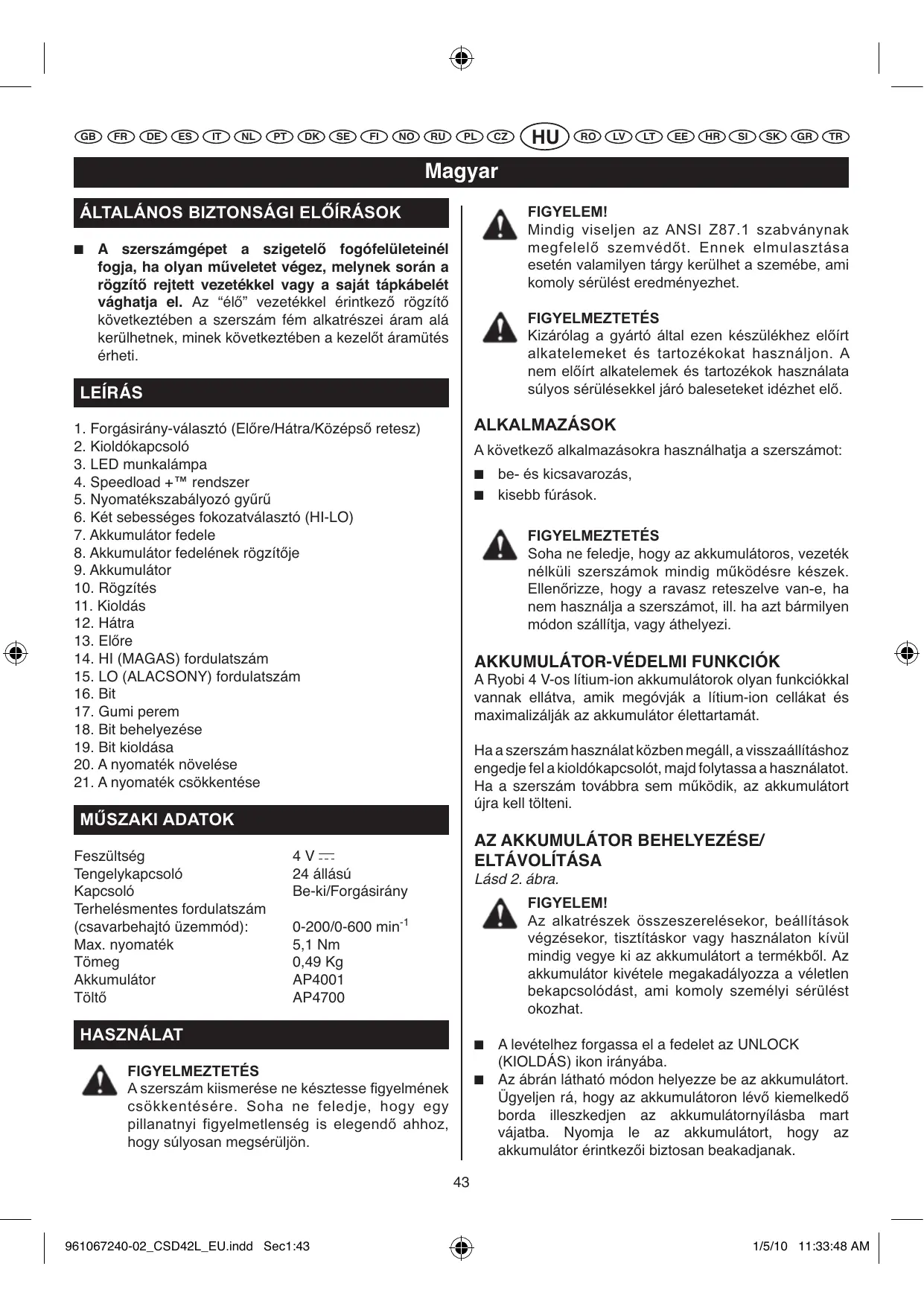 HASZNÁLATI ÚTMUTATÓ CSD 40 LI, CSD42L RYOBI