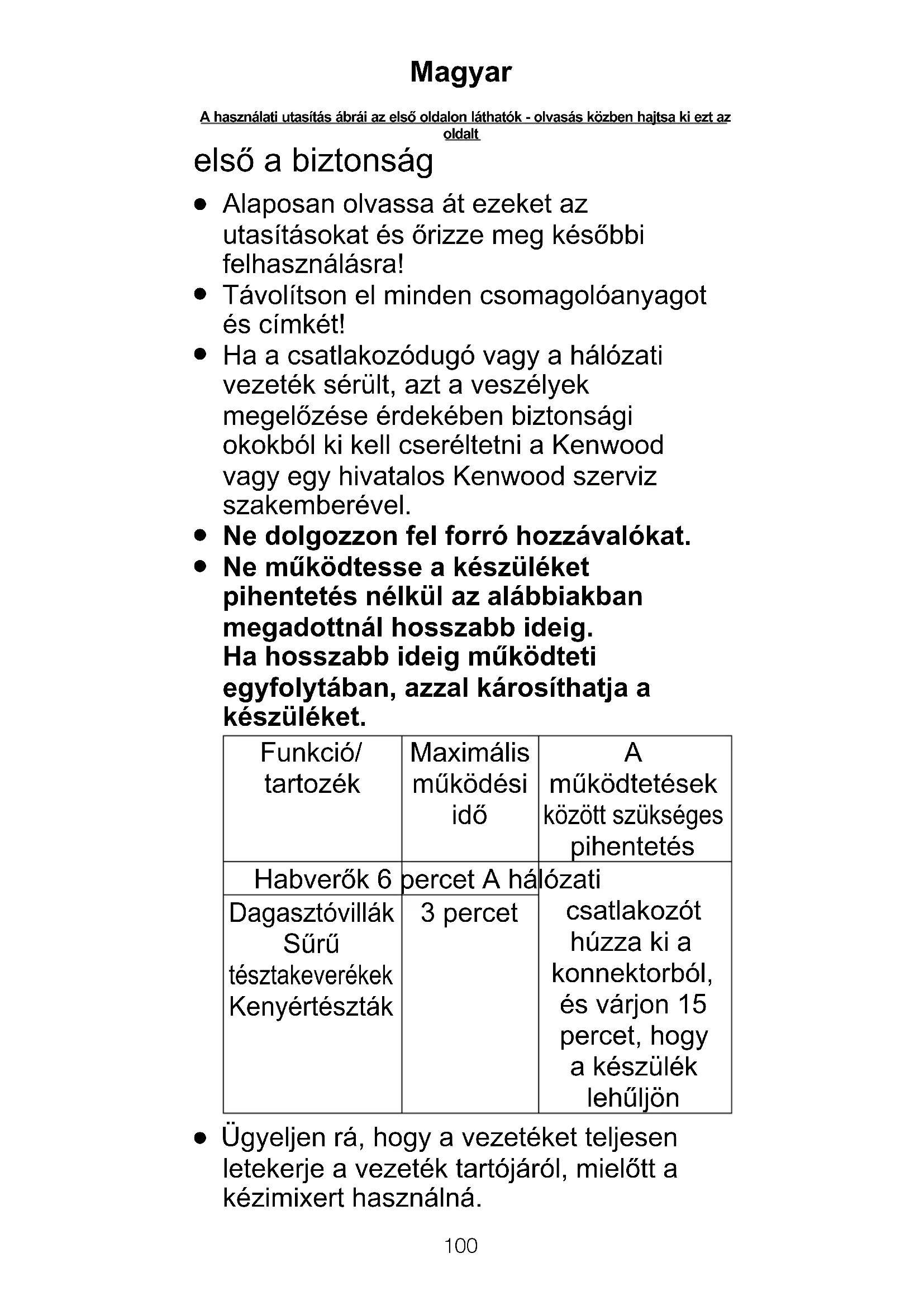 működtetések között szükséges pihentetés Habverők 6 percet A hálózati csatlakozót húzza ki a konnektorból, és várjon 15 percet, hogy a készülék lehűljön Dagasztóvillák Sűrű tésztakeverékek Kenyértészták 3 percet