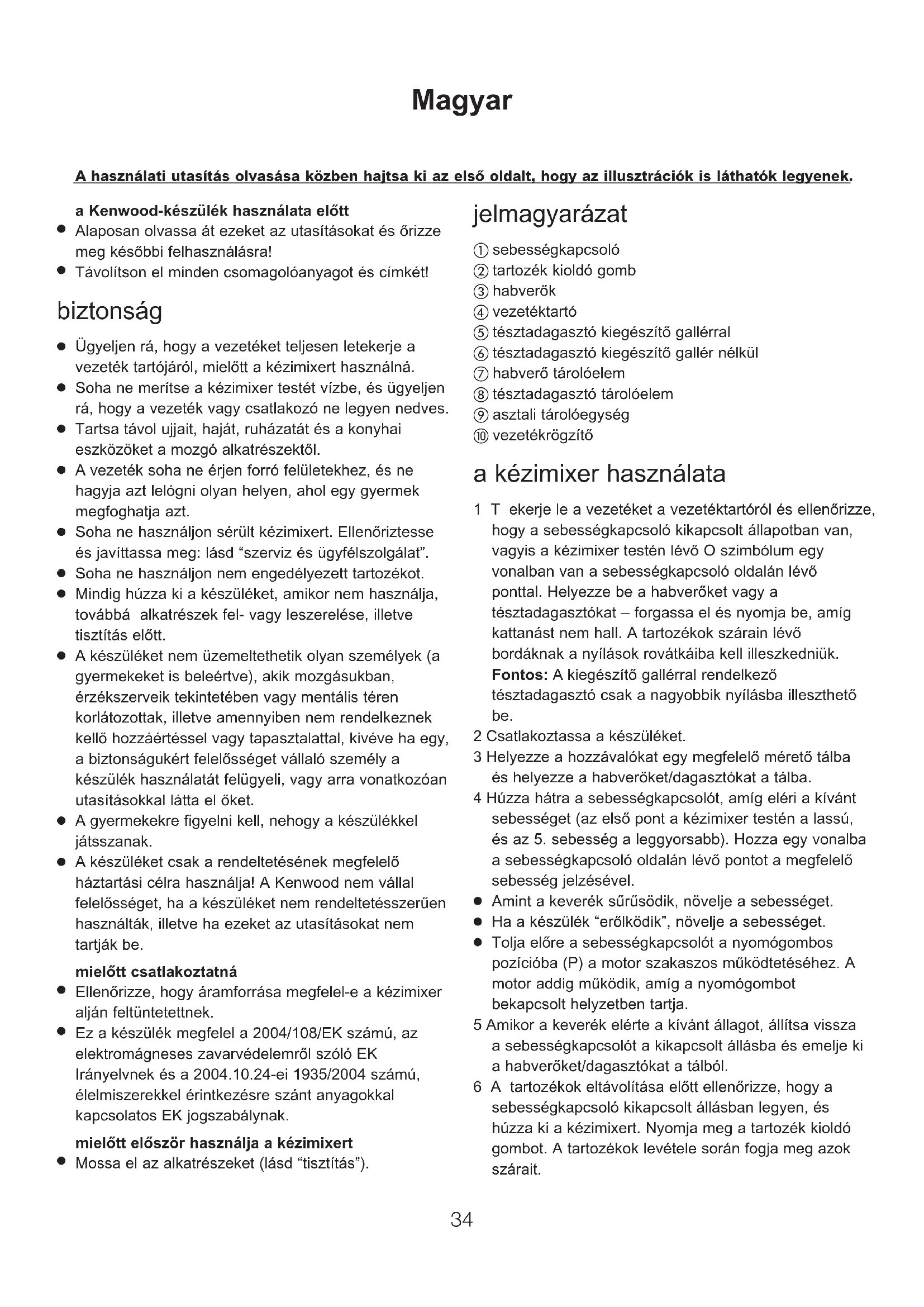 Ez a készülék megfelel a 2004/108/EK számú, az elektromágneses zavarvédelemről szóló EK Irányelvnek és a 2004.10.24-ei 1935/2004 számú, élelmiszerekkel érintkezésre szánt anyagokkal kapcsolatos EK jogszabálynak. mielőtt először használja a kézimixert