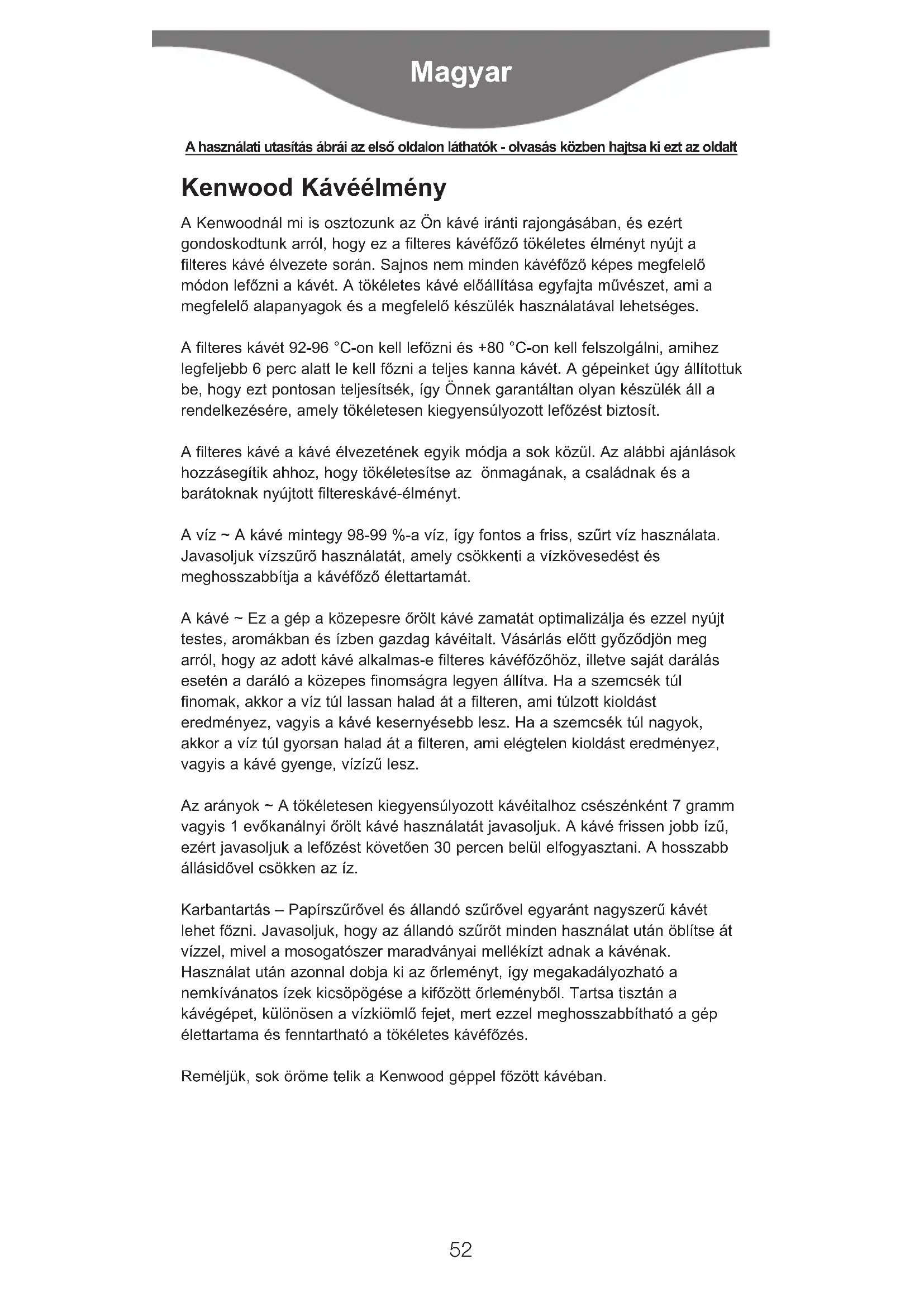 2002/96 Po ukončení doby své životnosti nesmí být výrobek odklizen společně s domácím odpadem. Je třeba zabezpečit jeho odevzdání na specializovaná místa sběru tříděného odpadu, zřizovaná městskou správou anebo prodejcem, který zabezpečuje tuto službu. Oddělené sešrotování elektrospotřebičů je zárukou prevence negativních vlivů na životní prostředí a na zdraví, které způsobuje nevhodné nakládání, umožňuje recyklaci jednotlivých materiálů, a tím i významnou úsporu energií a surovin. Pro účely zdůraznění povinnosti tříděného sběru odpadu elektrospotřebičů je na výrobku zaškrtnutý příslušný symbol pro sběr tříděného odpadu. 51Kenwood Kávéélmény A Kenwoodnál mi is osztozunk az Ön kávé iránti rajongásában, és ezért gondoskodtunk arról, hogy ez a filteres kávéfőző tökéletes élményt nyújt a filteres kávé élvezete során. Sajnos nem minden kávéfőző képes megfelelő módon lefőzni a kávét. A tökéletes kávé előállítása egyfajta művészet, ami a megfelelő alapanyagok és a megfelelő készülék használatával lehetséges. A filteres kávét 92-96 °C-on kell lefőzni és +80 °C-on kell felszolgálni, amihez legfeljebb 6 perc alatt le kell főzni a teljes kanna kávét. A gépeinket úgy állítottuk be, hogy ezt pontosan teljesítsék, így Önnek garantáltan olyan készülék áll a rendelkezésére, amely tökéletesen kiegyensúlyozott lefőzést biztosít. A filteres kávé a kávé élvezetének egyik módja a sok közül. Az alábbi ajánlások hozzásegítik ahhoz, hogy tökéletesítse az önmagának, a családnak és a barátoknak nyújtott filtereskávé-élményt. A víz ~ A kávé mintegy 98-99 %-a víz, így fontos a friss, szűrt víz használata. Javasoljuk vízszűrő használatát, amely csökkenti a vízkövesedést és meghosszabbítja a kávéfőző élettartamát. A kávé ~ Ez a gép a közepesre őrölt kávé zamatát optimalizálja és ezzel nyújt testes, aromákban és ízben gazdag kávéitalt. Vásárlás előtt győződjön meg arról, hogy az adott kávé alkalmas-e filteres kávéfőzőhöz, illetve saját darálás esetén a daráló a közepes finomságra legyen állítva. Ha a szemcsék túl finomak, akkor a víz túl lassan halad át a filteren, ami túlzott kioldást eredményez, vagyis a kávé kesernyésebb lesz. Ha a szemcsék túl nagyok, akkor a víz túl gyorsan halad át a filteren, ami elégtelen kioldást eredményez, vagyis a kávé gyenge, vízízű lesz. Az arányok ~ A tökéletesen kiegyensúlyozott kávéitalhoz csészénként 7 gramm vagyis 1 evőkanálnyi őrölt kávé használatát javasoljuk. A kávé frissen jobb ízű, ezért javasoljuk a lefőzést követően 30 percen belül elfogyasztani. A hosszabb állásidővel csökken az íz. Karbantartás – Papírszűrővel és állandó szűrővel egyaránt nagyszerű kávét lehet főzni. Javasoljuk, hogy az állandó szűrőt minden használat után öblítse át vízzel, mivel a mosogatószer maradványai mellékízt adnak a kávénak. Használat után azonnal dobja ki az őrleményt, így megakadályozható a nemkívánatos ízek kicsöpögése a kifőzött őrleményből. Tartsa tisztán a kávégépet, különösen a vízkiömlő fejet, mert ezzel meghosszabbítható a gép élettartama és fenntartható a tökéletes kávéfőzés. Reméljük, sok öröme telik a Kenwood géppel főzött kávéban. Magyar