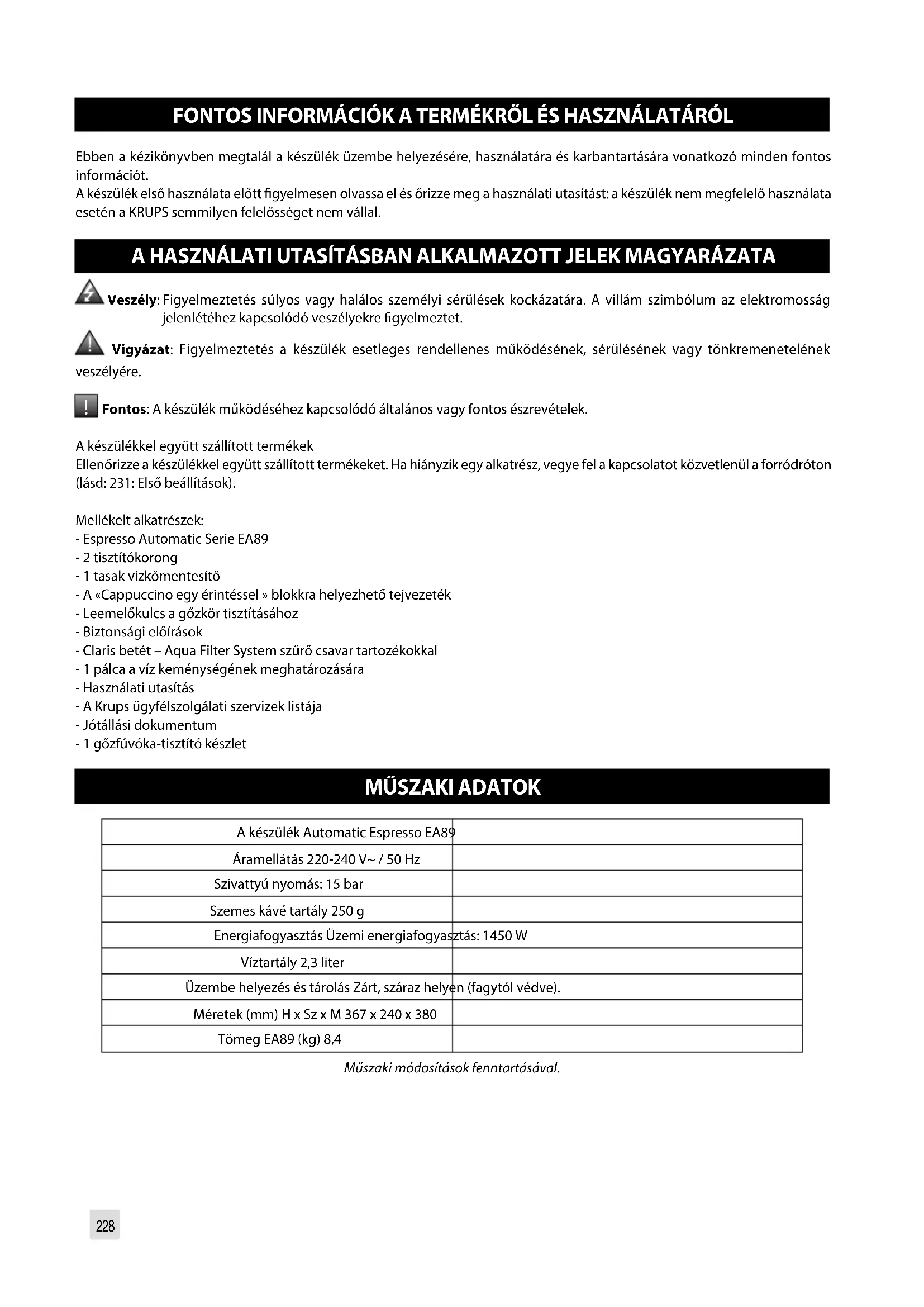 A KÉSZÜLÉK ELHELYEZÉSE ................................................................................................p. 231 ITALOK KÉSZÍTÉSE ELŐTT FONTOS TUDNIVALÓK ......................................................................................................p. 232 KÁVÉITALOK KÉSZÍTÉSE KÖZVETLEN HOZZÁFÉRÉSSEL ........................................................p. 233 TEJITALOK KÉSZÍTÉSE KÖZVETLEN HOZZÁFÉRÉSSEL ...........................................................p. 233 TEAKÉSZÍTÉS ....................................................................................................................p. 234 TOVÁBBI ITALOK KÉSZÍTÉSE: RISZTRETTÓ, DOPPIÓ, AMERIKAI KÁVÉ VAGY HABOS TEJ ......................................................................................p. 234 EGYÉB FUNKCIÓK .............................................................................................................p. 235 ÁLTALÁNOS KARBANTARTÁS ............................................................................................p. 236 PROBLÉMÁK ÉS HOIBAELHÁRÍTÁS. . . . . . . . . . . . . . . . . . . . . . . . . . . . . . . . . . . . . . . . . . . . . . . . . . . . . . . . . . . . . . . . . . . . . . . . . . . . . . . . . . . . . . p. 238228 FONTOS INFORMÁCIÓK A TERMÉKRŐL ÉS HASZNÁLATÁRÓL Ebben a kézikönyvben megtalál a készülék üzembe helyezésére, használatára és karbantartására vonatkozó minden fontos információt. A készülék első használata előtt gyelmesen olvassa el és őrizze meg a használati utasítást: a készülék nem megfelelő használata esetén a KRUPS semmilyen felelősséget nem vállal. A HASZNÁLATI UTASÍTÁSBAN ALKALMAZOTT JELEK MAGYARÁZATA Veszély: Figyelmeztetés súlyos vagy halálos személyi sérülések kockázatára. A villám szimbólum az elektromosság jelenlétéhez kapcsolódó veszélyekre gyelmeztet. Vigyázat: Figyelmeztetés a készülék esetleges rendellenes működésének, sérülésének vagy tönkremenetelének veszélyére.