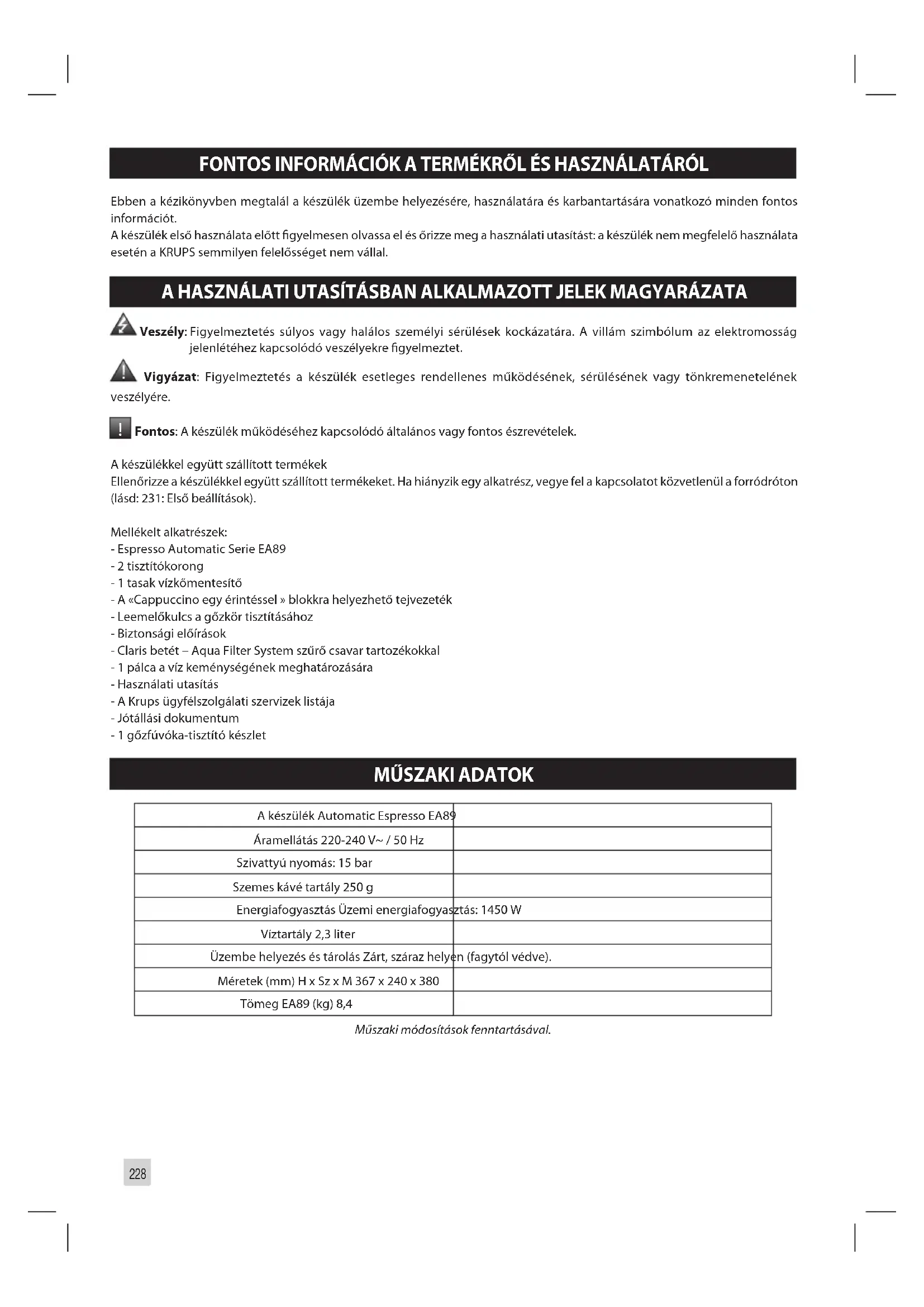 A KÉSZÜLÉK ELHELYEZÉSE ................................................................................................p. 230 ITALOK KÉSZÍTÉSE ELŐTT FONTOS TUDNIVALÓK ......................................................................................................p. 231 KÁVÉITALOK KÉSZÍTÉSE KÖZVETLEN HOZZÁFÉRÉSSEL ........................................................p. 232 TEJITALOK KÉSZÍTÉSE KÖZVETLEN HOZZÁFÉRÉSSEL ...........................................................p. 232 TEAKÉSZÍTÉS ....................................................................................................................p. 233 TOVÁBBI ITALOK KÉSZÍTÉSE: RISZTRETTÓ, DOPPIÓ, AMERIKAI KÁVÉ VAGY HABOS TEJ ......................................................................................p. 233 EGYÉB FUNKCIÓK .............................................................................................................p. 234 ÁLTALÁNOS KARBANTARTÁS ............................................................................................p. 235 PROBLÉMÁK ÉS HOIBAELHÁRÍTÁS. . . . . . . . . . . . . . . . . . . . . . . . . . . . . . . . . . . . . . . . . . . . . . . . . . . . . . . . . . . . . . . . . . . . . . . . . . . . . . . . . . . . . . p. 237228 FONTOS INFORMÁCIÓK A TERMÉKRŐL ÉS HASZNÁLATÁRÓL Ebben a kézikönyvben megtalál a készülék üzembe helyezésére, használatára és karbantartására vonatkozó minden fontos információt. A készülék első használata előtt gyelmesen olvassa el és őrizze meg a használati utasítást: a készülék nem megfelelő használata esetén a KRUPS semmilyen felelősséget nem vállal. A HASZNÁLATI UTASÍTÁSBAN ALKALMAZOTT JELEK MAGYARÁZATA Veszély: Figyelmeztetés súlyos vagy halálos személyi sérülések kockázatára. A villám szimbólum az elektromosság jelenlétéhez kapcsolódó veszélyekre gyelmeztet. Vigyázat: Figyelmeztetés a készülék esetleges rendellenes működésének, sérülésének vagy tönkremenetelének veszélyére.