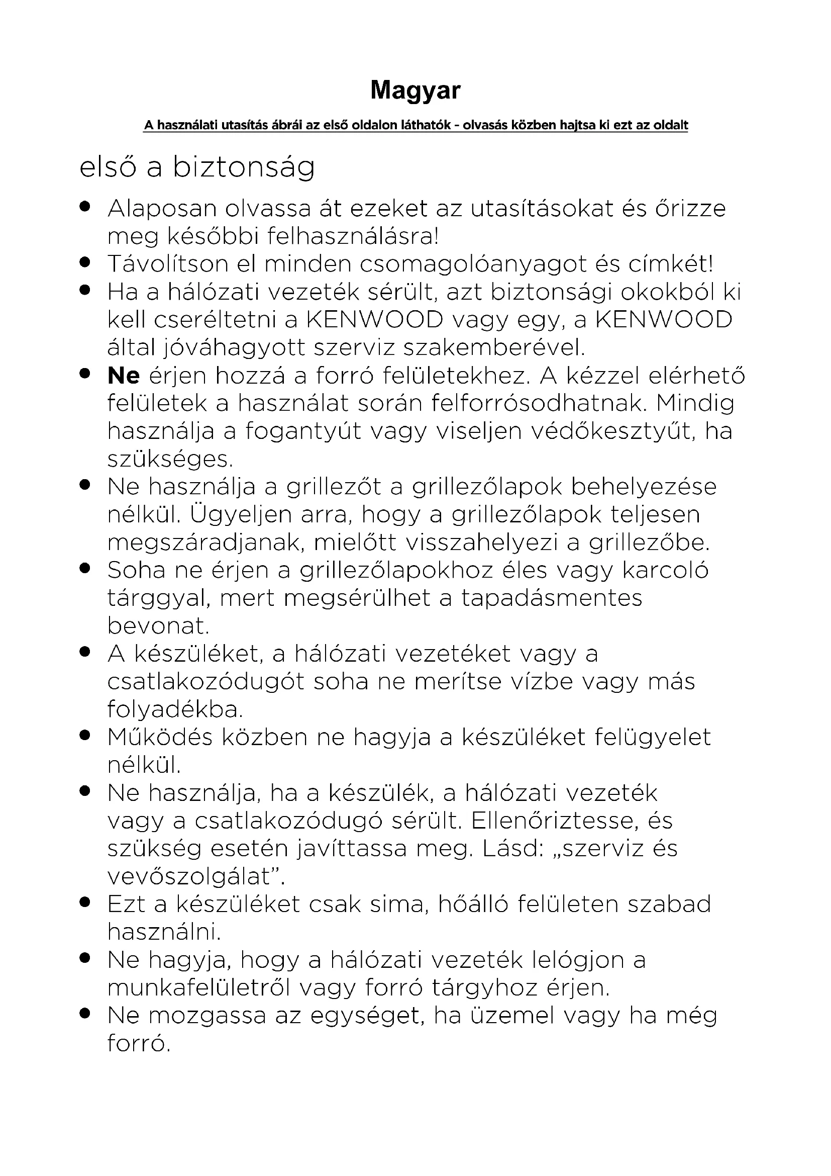Ha a hálózati vezeték sérült, azt biztonsági okokból ki kell cseréltetni a KENWOOD vagy egy, a KENWOOD által jóváhagyott szerviz szakemberével.