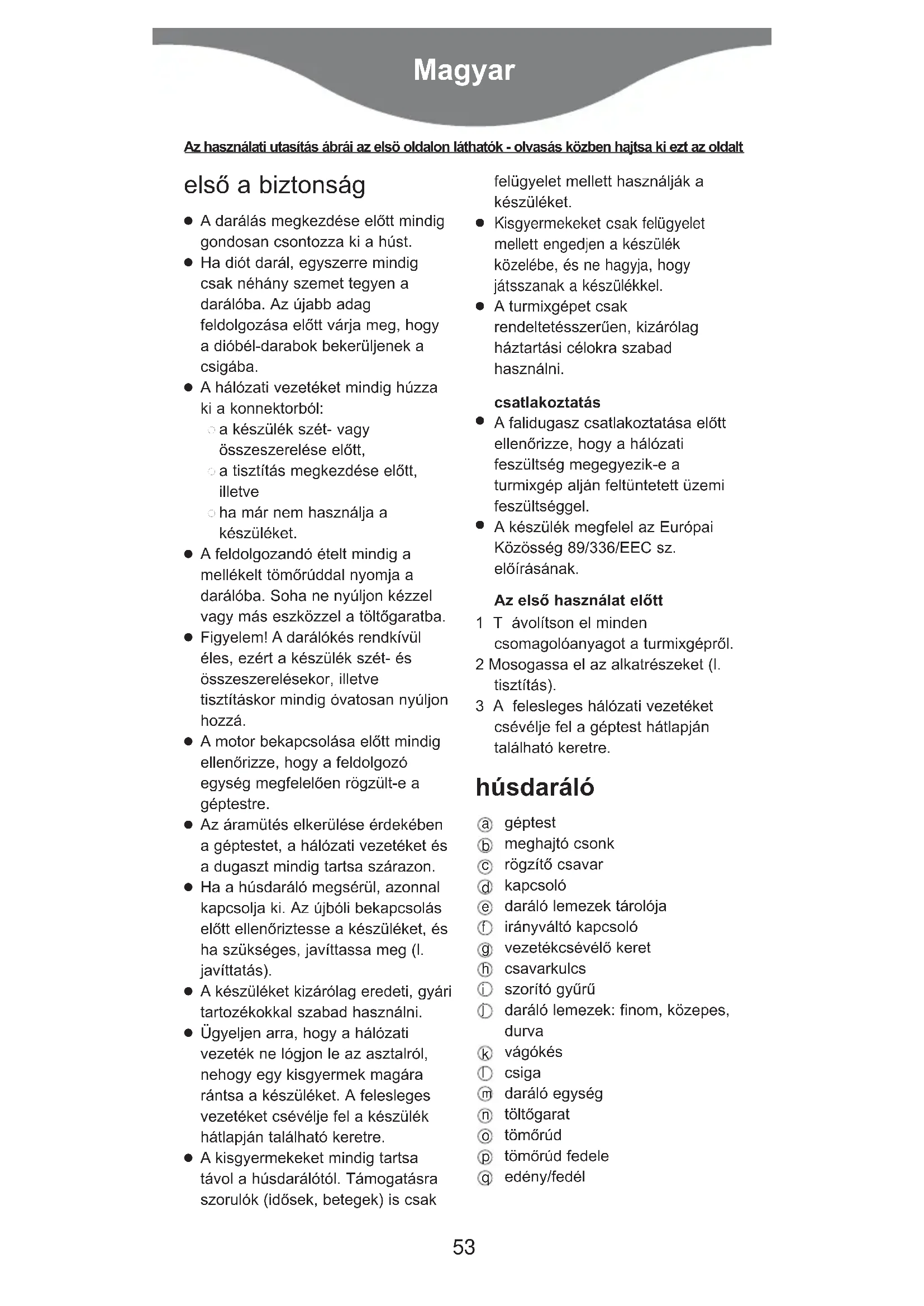 A kisgyermekeket mindig tartsa távol a húsdarálótól. Támogatásra szorulók (idòsek, betegek) is csak felügyelet mellett használják a készüléket.