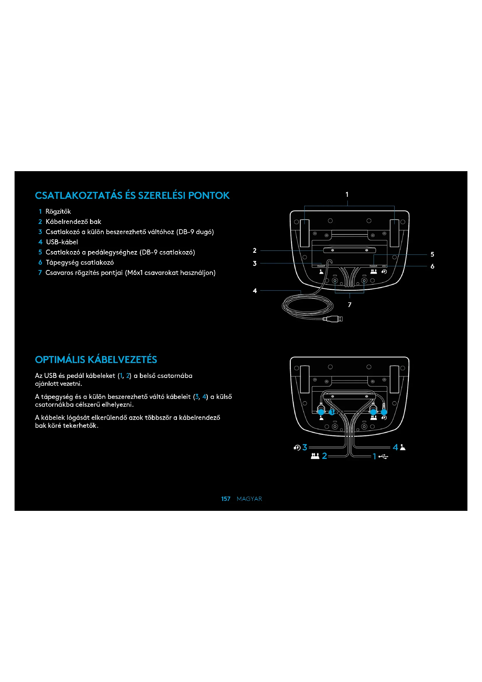 1 Rögzítők 2 Kábelrendező bak 3 Csatlakozó a külön beszerezhető váltóhoz (DB-9 dugó) 4 USB-kábel 5 Csatlakozó a pedálegységhez (DB-9 csatlakozó) 6 Tápegység csatlakozó 7 Csavaros rögzítés pontjai (M6x1 csavarokat használjon)