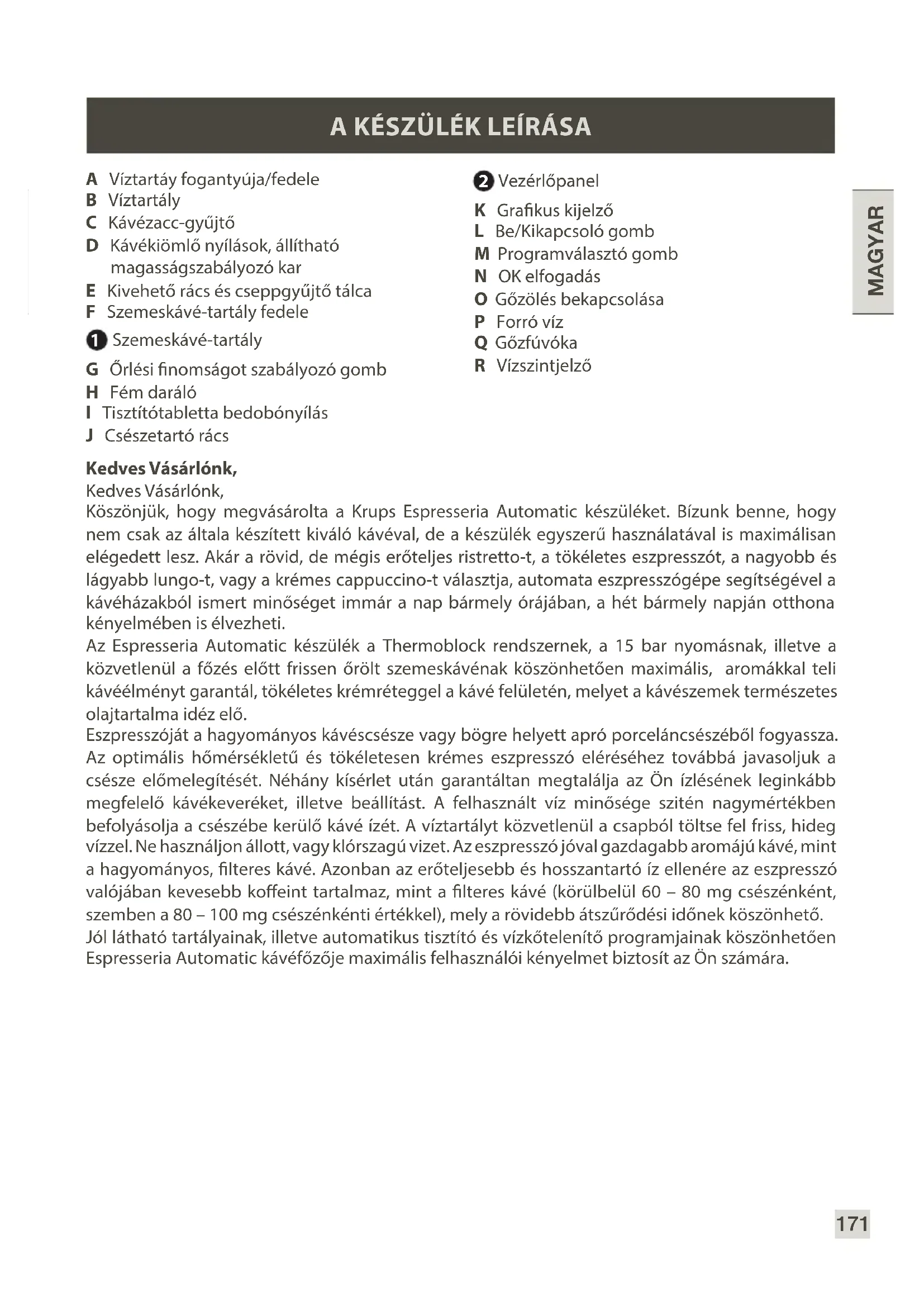 - Előbb a KARBANtARtÁS => SZŰRŐ => BEHELyEZéS program segítségével sikeresen be kell helyeznie egy szűrőt ahhoz, hogy a szűrő információk almenü első két parancsát használhassa.180 KIKAPCSOLÓ GOMB Bármely pillanatban kikapcsolhatja a készülékét. A kikapcsoláskor a készülék kétszer sípol, és a lehető leggyorsabban leáll. PROBLÉMÁK ÉS HIBAELHÁRÍTÁS PROBLÉMÁK HIBAELHÁRÍTÁS Az„On/O“ gomb megnyomásakor, a készülék nem kapcsol be. Ellenőrizze, hogy a tápkábel megfelelően be van-e dugva a csatlakozóaljzatba. A gőzfúvókából rendellenes módon víz vagy gőz folyik ki. Többszöri működtetés esetén, előfordulhat, hogy csepeg a gőzfúvóka. A kávé túl világos vagy nem elég erős. Változtassa meg a kávé hőmérsékletének beállítását. Meleg vízzel öblítve melegítse fel a csészéket. A kávé túl világos vagy nem elég erős. Ellenőrizze, hogy a szemes kávé tárolóban van-e kávé, és hogy az megfelelően kifolyik-e. Kerülje az olajos, karamellizált vagy ízesített kávék használatát. A központi gomb segítségével csökkentse a kávé mennyiségét. Forgassa balra az őrlési nomságot beállító gombot, hogy nomabb őrölt kávét állítson elő. Kávéját készítse el két ciklusban, a 2 csésze funkció használatával. A kávé túl lassan folyik ki. Forgassa jobbra az őrlési nomságot beállító gombot, hogy durvább őrölt kávét állítson elő (a használt kávé típusától függően). Végezzen el egy vagy több öblítési ciklust. A kávé kevésbé krémes. Forgassa balra az őrlési nomságot beállító gombot, hogy nomabb őrölt kávét állítson elő (a használt kávé típusától függően). Cserélje ki a Claris Aqua Filter System betétet (kövesse a 73. oldalon található beszerelési eljárást). Végezzen el egy vagy több öblítési ciklust. A készülékből nem folyik ki kávé. A kávékészítés közben hibaészlelés történt. A készülék automatikusan újrainicializálódik. Ez után készen áll egy újabb ciklusra. Szemes kávé helyett őrölt kávét használt. A szemes kávé tárolóban lévő őrölt kávét szívja ki egy porszívó segítségével. A daráló rendellenes hangot ad ki. A darálóban idegen test található. Vegye fel a kapcsolatot a KRUPS Ügyfélszolgálattal. Az őrlési nomságot beállító gombot nehéz elforgatni. Az őrlési nomságot kizárólag működés közben változtassa meg.181 MAGYAR PROBLÉMÁK HIBAELHÁRÍTÁS Nem távozik gőz a fúvókából. Készüléke kikapcsolása és lehűlése után: Ellenőrizze, hogy a gőzfúvóka megfelelően illeszkedik végződésére. Ellenőrizze, hogy a gőzfúvóka nincs-e eldugulva (szükség esetén tisztítsa meg a gőzfúvókát és távolítsa el a dugulás okát a mellékelt tűvel). Ürítse ki a tartályt és távolítsa el a Claris szűrőt. Töltse meg a tartályt kalciumban gazdag (> 100 mg/l) ásványvízzel, és végezzen egymás után gőzciklusokat (5 - 10) egy edénybe, amíg folyamatos gőzsugár nem távozik a készülékből. Miért nem tudom elindítani a vízkőmentesítést / miért nem kér a készülék vízkőmentesítést? A készülék csak bizonyos számú gőzzel végzett művelet után kér vízkőmentesítést. Nem elegendő a tejhab mennyisége. Szükség esetén tisztítsa ki a fúvóka felső részén található légbeömlő nyílást a mellékelt tűvel. Használjon hideg edényt és nemrégiben kinyitott tejet. Esetleg váltson más típusú tejre (tartós vagy pasztőrözött). A tejhab túlságosan sűrű. Ellenőrizze, hogy a rozsdamentes acélból készült kis cső mindkét vége megfelelően illeszkedik a gőzfúvóka hajlékony részébe. Az Auto-Cappuccino tartozék nem szívja fel a tejet (külön kapható tartozék). Ellenőrizze, hogy a tejbe merülő cső nincs-e eldugulva. Ellenőrizze, hogy a hajlítható cső nem ferdült-e el és hogy pontosan illeszkedik-e a tartozékba, megelőzve ezzel a levegő beszívását. Készüléke kikapcsolása és lehűlése után, tisztítsa ki az Auto- Cappuccino tartozék kimeneti nyílását. A kávézacc gyűjtő tartály kiürítése után a gyelmeztető üzenet még mindig látható a kijelzőn. Helyezze vissza megfelelően a kávézacc gyűjtő tartályt, és kövesse a kijelzőn megjelenő utasításokat. A visszahelyezés előtt várjon legalább 6 másodpercet. Egy ciklus során megszakadt az áramellátás. Az újbóli feszültség alá helyezéskor a készülék automatikusan újrainicializálódik. Ez után kész egy újabb ciklusra. Víz vagy kávé található a készülék alatt. A kávézacc gyűjtő tartály kiömlött: ürítse ki és tisztítsa meg a kávézacc gyűjtő tartályt. Ellenőrizze a csepptálca megfelelő elhelyezkedését. Soha ne vegye ki a víztartályt a ciklus vége előtt. Egy üzenet jelenik meg. Áramtalanítsa a készüléket 20 másodpercre, adott esetben távolítsa el a Claris Aqua Filter System betétet, majd kapcsolja vissza a készüléket. Amennyiben a hiba továbbra is fennáll, jegyezze fel a hiba számát és lépjen kap- csolatba a KRUPS Ügyfélszolgálattal. Ha a kávékiömlők mögött kifolyik a kávé. Öntsön a tartályba hideg vagy szobahőmérsékletű vizet. Csökkentse a hőmérséklet szintjét. A készülék működik, de nem folyik belőle folyadék. Ellenőrizze, hogy a víztartály a helyén van-e, és hogy a vezeték nem akadt-e be a készüléktest és a víztartály közé. A cseppgyűjtő tálcában őrlemény található. Ez abban az esetben fordulhat elő, ha őrlemény kerül a kávéfőző tartályába; ez tartja fenn a készülék tisztaságát.182 Az alábbiakban bemutatunk néhány receptet, amelyeket az Espresseria Automatic készülék segítségével készíthet el: Cappuccino A valódi cappuccino hozzávalóinak ideális aránya: 1/3 meleg tej, 1/3 kávé, 1/3 tejhab. Cae Latte A gyakran Latte Macchiato-na