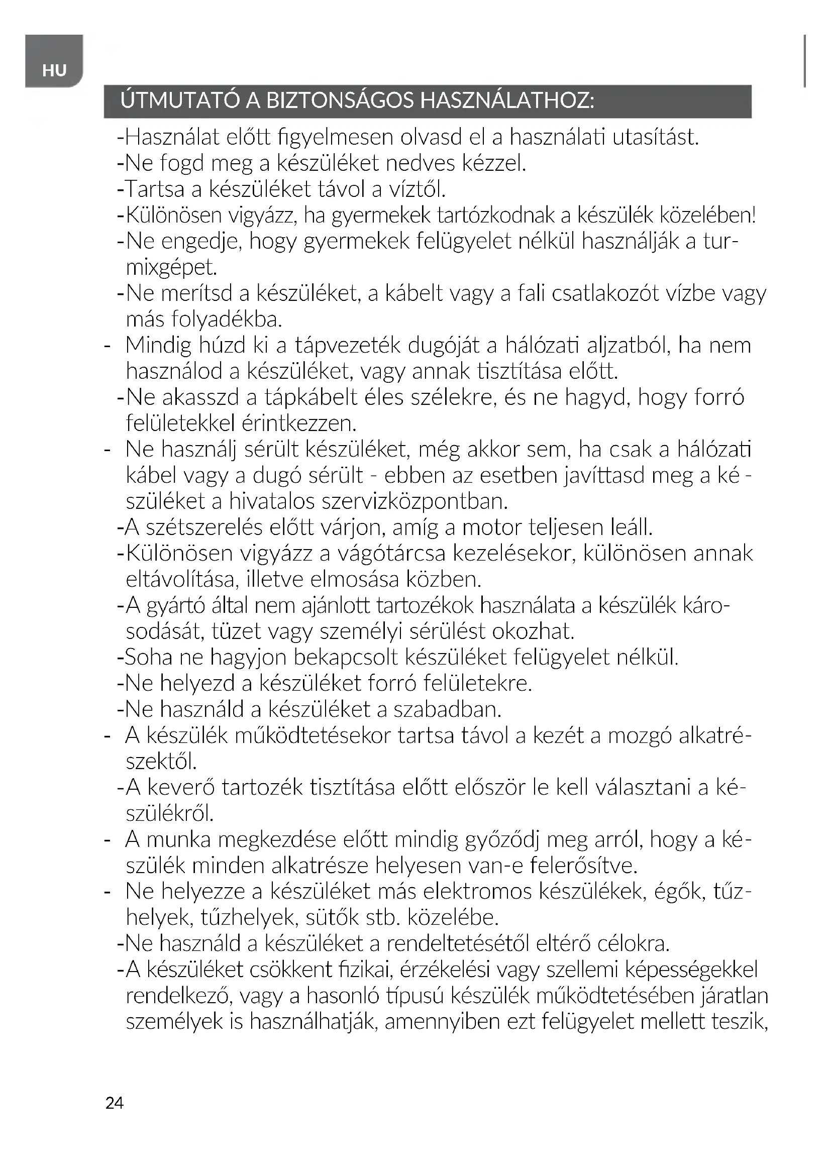A TURMIXGÉP ÖSSZESZERELÉSE ÉS HASZNÁLATA FIGYELEM! Az első használat elő mossa el a turmixgép minden részét, kivéve a házát ❶ meleg vízben. A turmixgép háza ne legyen nedves ❶. Győződjön meg róla, hogy a hálóza csatlakozó kihúzva van a konnektorból, mielő felszerelést csatlakoztatna vagy eltávolítana. Az MBL-27 botmixer (28) egy kompakt készülék, amely megkönnyí a mindennapi ételkészí- tést. Különösen alkalmas nyers és fő zöldségek, puha gyümölcsök (magok nélkül) aprítására, szószok, krémek, levesek, folyadékok turmixolására stb. készítésére. A termékek nagyméretű összetevőit vágja kisebb darabokra (1-2 cm), mielő turmixgéppel aprítja.