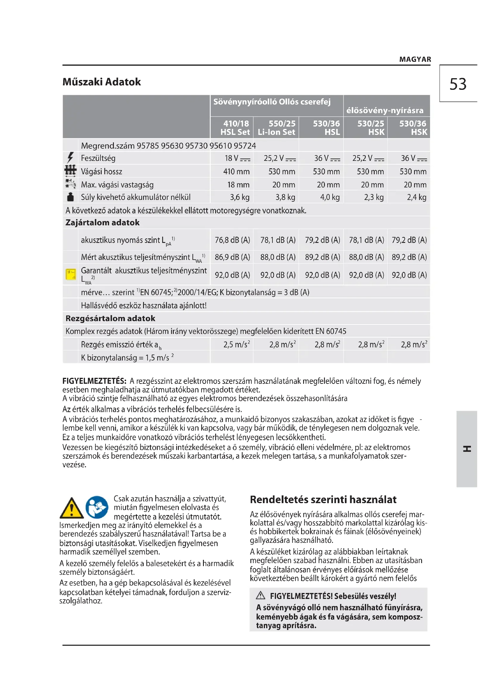 szolgálathoz. Rendeltetés szerinti használat Az élősövények nyírására alkalmas ollós cserefej mar- kolattal és/vagy hosszabbító markolattal kizárólag kis- és hobbikertek bokrainak és fáinak (élősövényeinek) gallyazására használható. A készüléket kizárólag az alábbiakban leírtaknak megfelelően szabad használni. Ebben az utasításban foglalt általánosan érvényes előírások mellőzése következtében beállt károkért a gyártó nem felelős FIGYELMEZTETÉS! Sebesülés veszély! A sövényvágó olló nem használható fűnyírásra, keményebb ágak és fa vágására, sem komposz- tanyag aprításra. Műszaki Adatok Sövénynyíróolló Ollós cserefej élősövény-nyírásra 410/18 HSL Set 550/25 Li-Ion Set 530/36 HSL 530/25 HSK 530/36 HSK Megrend.szám 95785 95630 95730 95610 95724 Feszültség 18 V 25,2 V 36 V 25,2 V 36 V Vágási hossz 410 mm 530 mm 530 mm 530 mm 530 mm Max. vágási vastagság 18 mm 20 mm 20 mm 20 mm 20 mm Súly kivehető akkumulátor nélkül 3,6 kg 3,8 kg 4,0 kg 2,3 kg 2,4 kg A következő adatok a készülékekkel ellátott motoregységre vonatkoznak. Zajártalom adatok akusztikus nyomás szint L