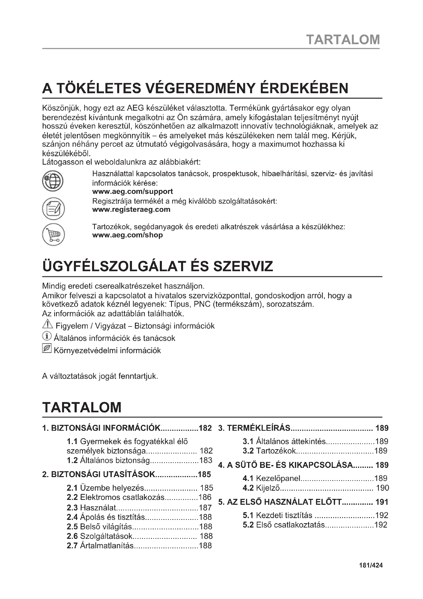 L'ENVIRONNEMENT Recyclez les matériaux portant le symbole . Déposez les emballages dans les conteneurs prévus à cet effet. Contribuez à la protection de l'environnement et à votre sécurité, recyclez vos produits électriques et électroniques. Ne jetez pas les appareils portant le symbole avec les ordures ménagères. Emmenez un tel produit dans votre centre local de recyclage ou contactez vos services municipaux. Concerne la France uniquement : 180/424 C'EST SIMPLE !A TÖKÉLETES VÉGEREDMÉNY ÉRDEKÉBEN Köszönjük, hogy ezt az AEG készüléket választotta. Termékünk gyártásakor egy olyan berendezést kívántunk megalkotni az Ön számára, amely kifogástalan teljesítményt nyújt hosszú éveken keresztül, köszönhetően az alkalmazott innovatív technológiáknak, amelyek az életét jelentősen megkönnyítik – és amelyeket más készülékeken nem talál meg. Kérjük, szánjon néhány percet az útmutató végigolvasására, hogy a maximumot hozhassa ki készülékéből. Látogasson el weboldalunkra az alábbiakért: Használattal kapcsolatos tanácsok, prospektusok, hibaelhárítási, szerviz- és javítási információk kérése: www.aeg.com/support Regisztrálja termékét a még kiválóbb szolgáltatásokért: www.registeraeg.com Tartozékok, segédanyagok és eredeti alkatrészek vásárlása a készülékhez: www.aeg.com/shop