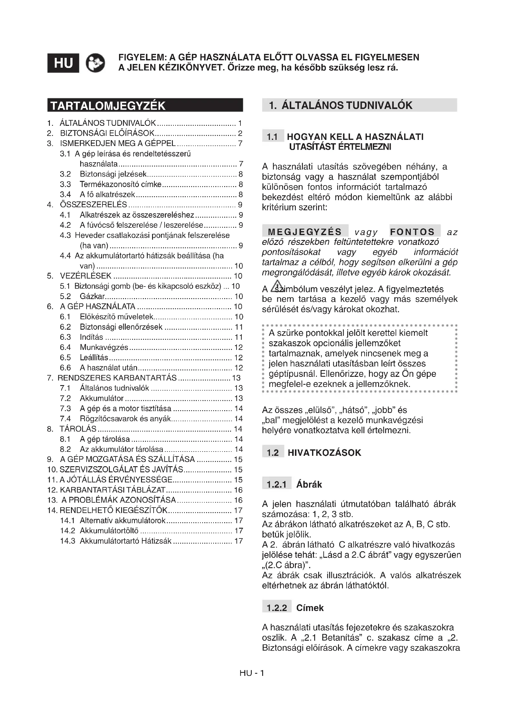 - olvassa el a vonatkozó útmutatót. Figyelem! Mozgásban lévő veszélyes alkatrészek miatt fennáll a sérülés veszélye! – A műveletek gyakoriságát és jellegét a „Karbantartási táblázat” tartalmazza (lásd 12. fejezet). A táblázat célja, hogy segítsen Önnek a gép hatékonyságának és üzembiztos állapotának megőrzésében. Tartalmazza a főbb elvégzendő műveleteket és azok elvégzésének gyakoriságát. A műveleteket az elsőként aktuálissá váló alkalommal végezze el. – A nem eredeti cserealkatrészek és tartozékok használata veszélyeztetheti a gép biztonságát és működését. Ezen termékek okozta károk és sérülések esetén a gyártó nem vállal semminemű felelősséget. – Az eredeti cserealkatrészek a márkaszervizektől és viszonteladóktól szerezhetők be. FONTOS A használati utasításban le nem írt összes beállítást, valamint karbantartási műveletet márkakereskedőjénél vagy egy szakszervizben kell elvégeztetni.HU - 13