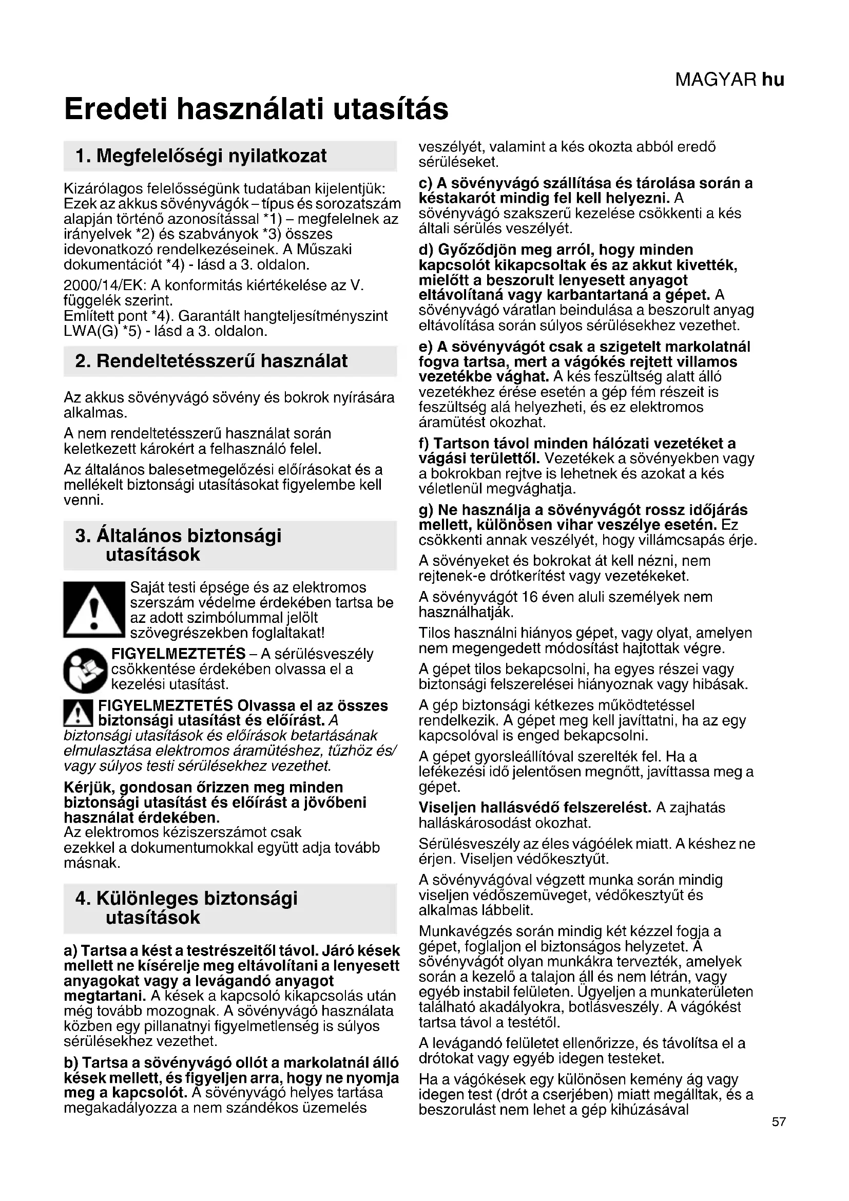 Eredeti használati utasítás Kizárólagos felelősségünk tudatában kijelentjük: Ezek az akkus sövényvágók – típus és sorozatszám alapján történő azonosítással *1) – megfelelnek az irányelvek *2) és szabványok *3) összes idevonatkozó rendelkezéseinek. A Műszaki dokumentációt *4) - lásd a 3. oldalon. 2000/14/EK: A konformitás kiértékelése az V. függelék szerint. Említett pont *4). Garantált hangteljesítményszint LWA(G) *5) - lásd a 3. oldalon. Az akkus sövényvágó sövény és bokrok nyírására alkalmas. A nem rendeltetésszerű használat során keletkezett károkért a felhasználó felel. Az általános balesetmegelőzési előírásokat és a mellékelt biztonsági utasításokat figyelembe kell venni. Saját testi épsége és az elektromos szerszám védelme érdekében tartsa be az adott szimbólummal jelölt szövegrészekben foglaltakat! FIGYELMEZTETÉS – A sérülésveszély csökkentése érdekében olvassa el a kezelési utasítást. FIGYELMEZTETÉS Olvassa el az összes biztonsági utasítást és előírást. A biztonsági utasítások és előírások betartásának elmulasztása elektromos áramütéshez, tűzhöz és/ vagy súlyos testi sérülésekhez vezethet. Kérjük, gondosan őrizzen meg minden biztonsági utasítást és előírást a jövőbeni használat érdekében. Az elektromos kéziszerszámot csak ezekkel a dokumentumokkal együtt adja tovább másnak. a) Tartsa a kést a testrészeitől távol. Járó kések mellett ne kísérelje meg eltávolítani a lenyesett anyagokat vagy a levágandó anyagot megtartani. A kések a kapcsoló kikapcsolás után még tovább mozognak. A sövényvágó használata közben egy pillanatnyi figyelmetlenség is súlyos sérülésekhez vezethet. b) Tartsa a sövényvágó ollót a markolatnál álló kések mellett, és figyeljen arra, hogy ne nyomja meg a kapcsolót. A sövényvágó helyes tartása megakadályozza a nem szándékos üzemelés veszélyét, valamint a kés okozta abból eredő sérüléseket. c) A sövényvágó szállítása és tárolása során a késtakarót mindig fel kell helyezni. A sövényvágó szakszerű kezelése csökkenti a kés általi sérülés veszélyét. d) Győződjön meg arról, hogy minden kapcsolót kikapcsoltak és az akkut kivették, mielőtt a beszorult lenyesett anyagot eltávolítaná vagy karbantartaná a gépet. A sövényvágó váratlan beindulása a beszorult anyag eltávolítása során súlyos sérülésekhez vezethet. e) A sövényvágót csak a szigetelt markolatnál fogva tartsa, mert a vágókés rejtett villamos vezetékbe vághat. A kés feszültség alatt álló vezetékhez érése esetén a gép fém részeit is feszültség alá helyezheti, és ez elektromos áramütést okozhat. f) Tartson távol minden hálózati vezetéket a vágási területtől. Vezetékek a sövényekben vagy a bokrokban rejtve is lehetnek és azokat a kés véletlenül megvághatja. g) Ne használja a sövényvágót rossz időjárás mellett, különösen vihar veszélye esetén. Ez csökkenti annak veszélyét, hogy villámcsapás érje. A sövényeket és bokrokat át kell nézni, nem rejtenek-e drótkerítést vagy vezetékeket. A sövényvágót 16 éven aluli személyek nem használhatják. Tilos használni hiányos gépet, vagy olyat, amelyen nem megengedett módosítást hajtottak végre. A gépet tilos bekapcsolni, ha egyes részei vagy biztonsági felszerelései hiányoznak vagy hibásak. A gép biztonsági kétkezes működtetéssel rendelkezik. A gépet meg kell javíttatni, ha az egy kapcsolóval is enged bekapcsolni. A gépet gyorsleállítóval szerelték fel. Ha a lefékezési idő jelentősen megnőtt, javíttassa meg a gépet. Viseljen hallásvédő felszerelést. A zajhatás halláskárosodást okozhat. Sérülésveszély az éles vágóélek miatt. A késhez ne érjen. Viseljen védőkesztyűt. A sövényvágóval végzett munka során mindig viseljen védőszemüveget, védőkesztyűt és alkalmas lábbelit. Munkavégzés során mindig két kézzel fogja a gépet, foglaljon el biztonságos helyzetet. A sövényvágót olyan munkákra tervezték, amelyek során a kezelő a talajon áll és nem létrán, vagy egyéb instabil felületen. Ügyeljen a munkaterületen található akadályokra, botlásveszély. A vágókést tartsa távol a testétől. A levágandó felületet ellenőrizze, és távolítsa el a drótokat vagy egyéb idegen testeket. Ha a vágókések egy különösen kemény ág vagy idegen test (drót a cserjében) miatt megálltak, és a beszorulást nem lehet a gép kihúzásával