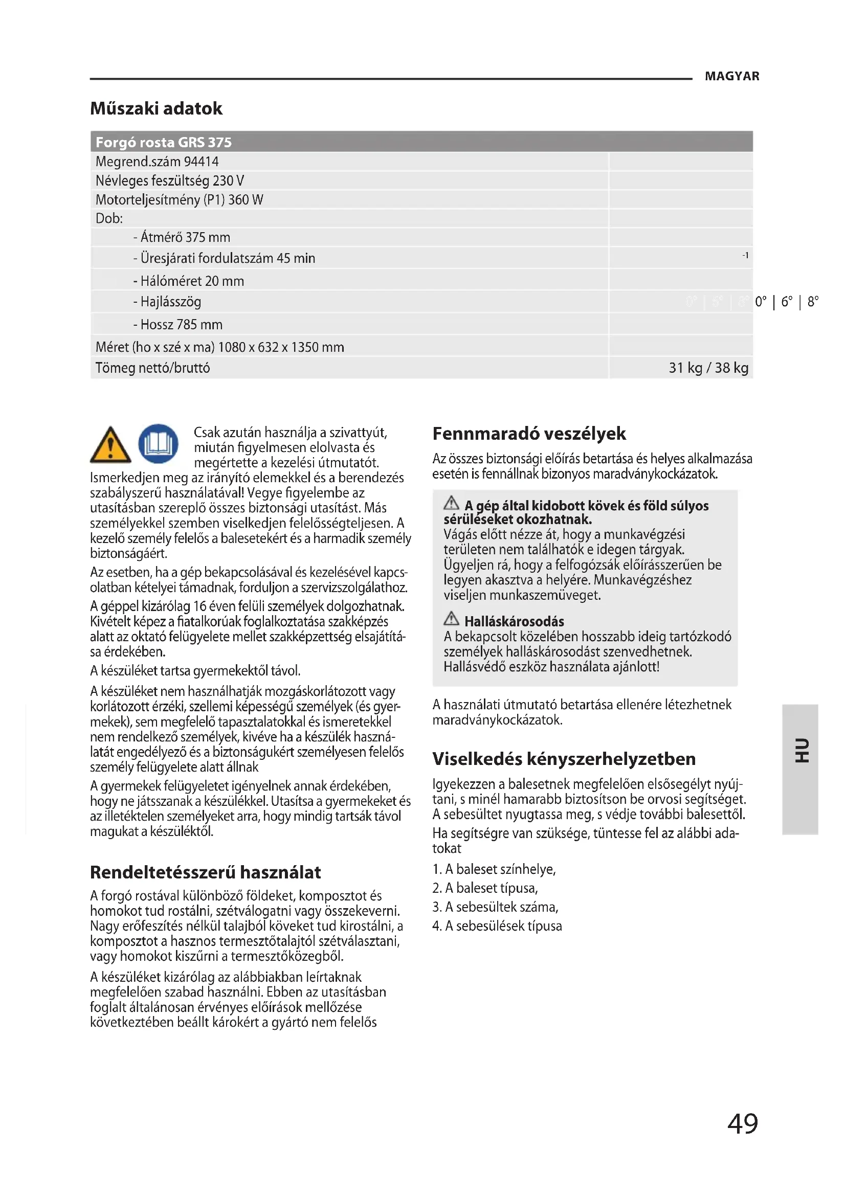 POLSKI49 MAGYAR Műszaki adatok Forgó rosta GRS 375 Megrend.szám 94414 Névleges feszültség 230 V Motorteljesítmény (P1) 360 W Dob: - Átmérő 375 mm - Üresjárati fordulatszám 45 min
