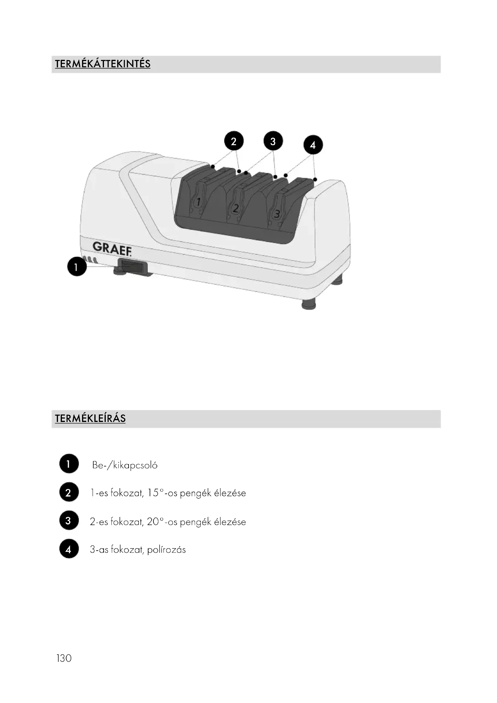 UKR ELŐSZÓ Tisztelt Vásárlónk! Gratulálunk, hogy ezt a késélezőt választotta. Elismert minőségi terméket vásárolt. Köszönjük a vásárlást, és kívánjuk, hogy használja sok örömmel az új késélezőt. INFORMÁCIÓK A JELEN HASZNÁLATI ÚTMUTATÓHOZ Ez a használati útmutató a késélező (a továbbiakban: gép) része, és fontos információkat tartalmaz a gép üzembe helyezéséről, biztonságáról, rendeltetésszerű használatáról és kar- bantartásáról. Az üzemeltetési útmutatónak mindig elérhetőnek kell lennie a gépnél. A használati útmutatót minden olyan személynek el kell olvasnia és alkalmaznia kell, aki a gép ● a gépet üzembe helyezi, ● a gépet kezeli, ● az üzemzavar elhárításáért és/vagy ● Tisztítás felelős. Őrizze meg ezt a használati útmutatót és adja tovább a géppel együtt a következő tulajdo- nosnak. Ez a használati útmutató nem vehet figyelembe minden lehetséges szempontot. További tud- nivalók vagy problémák esetén, amelyekről ez az útmutató nem, vagy nem elég részletesen beszél, forduljon a Graef ügyfélszolgálatához, vagy a szakszervizhez.