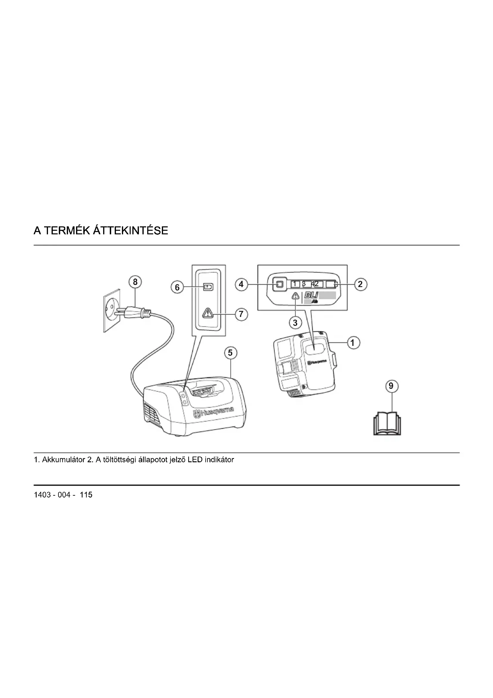 1. Akkumulátor 2. A töltöttségi állapotot jelző LED indikátor