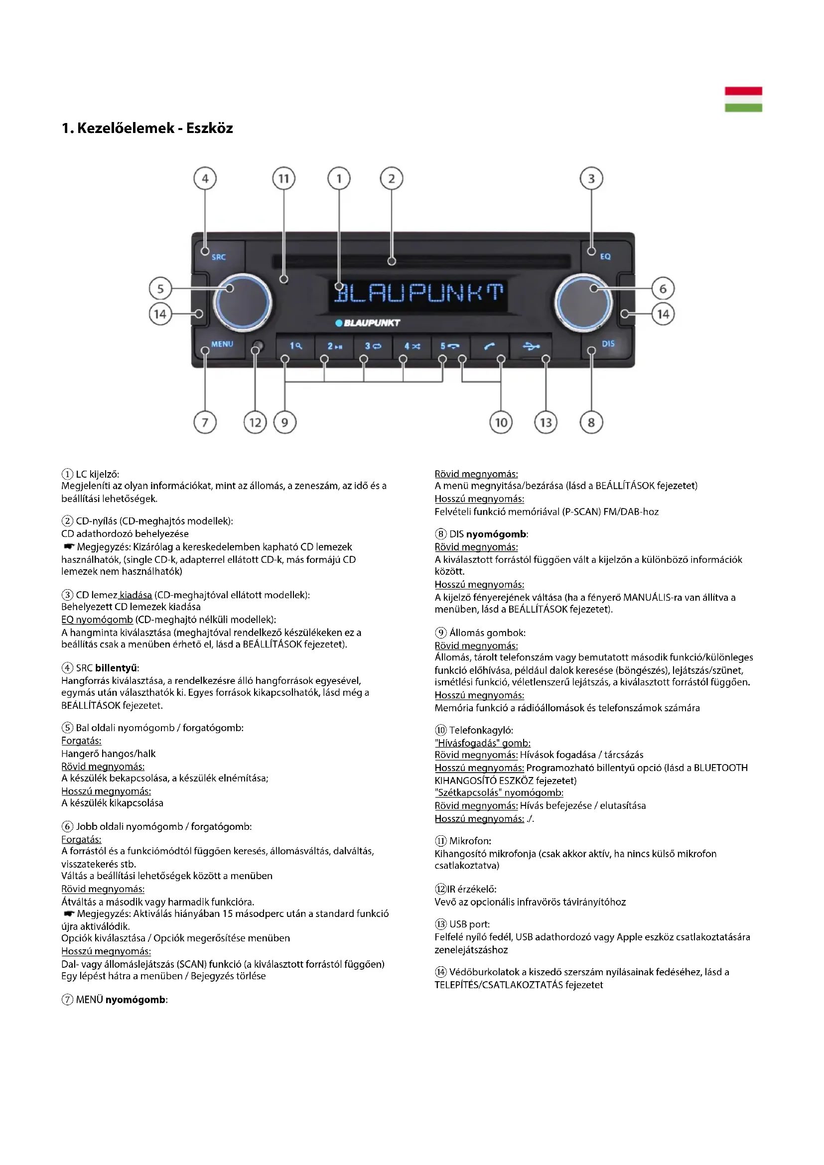 ① LC kijelző: Megjeleníti az olyan információkat, mint az állomás, a zeneszám, az idő és a beállítási lehetőségek. ② CD-nyílás (CD-meghajtós modellek): CD adathordozó behelyezése Megjegyzés: Kizárólag a kereskedelemben kapható CD lemezek használhatók, (single CD-k, adapterrel ellátott CD-k, más formájú CD lemezek nem használhatók) ③ CD lemez kiadása (CD-meghajtóval ellátott modellek): Behelyezett CD lemezek kiadása EQ nyomógomb (CD-meghajtó nélküli modellek): A hangminta kiválasztása (meghajtóval rendelkező készülékeken ez a beállítás csak a menüben érhető el, lásd a BEÁLLÍTÁSOK fejezetet). ④ SRC billentyű: Hangforrás kiválasztása, a rendelkezésre álló hangforrások egyesével, egymás után választhatók ki. Egyes források kikapcsolhatók, lásd még a BEÁLLÍTÁSOK fejezetet. ⑤ Bal oldali nyomógomb / forgatógomb: Forgatás: Hangerő hangos/halk Rövid megnyomás: A készülék bekapcsolása, a készülék elnémítása; Hosszú megnyomás: A készülék kikapcsolása ⑥ Jobb oldali nyomógomb / forgatógomb: Forgatás: A forrástól és a funkciómódtól függően keresés, állomásváltás, dalváltás, visszatekerés stb. Váltás a beállítási lehetőségek között a menüben Rövid megnyomás: Átváltás a második vagy harmadik funkcióra. Megjegyzés: Aktiválás hiányában 15 másodperc után a standard funkció újra aktiválódik. Opciók kiválasztása / Opciók megerősítése menüben Hosszú megnyomás: Dal- vagy állomáslejátszás (SCAN) funkció (a kiválasztott forrástól függően) Egy lépést hátra a menüben / Bejegyzés törlése ⑦ MENÜ nyomógomb: Rövid megnyomás: A menü megnyitása/bezárása (lásd a BEÁLLÍTÁSOK fejezetet) Hosszú megnyomás: Felvételi funkció memóriával (P-SCAN) FM/DAB-hoz ⑧ DIS nyomógomb: Rövid megnyomás: A kiválasztott forrástól függően vált a kijelzőn a különböző információk között. Hosszú megnyomás: A kijelző fényerejének váltása (ha a fényerő MANUÁLIS-ra van állítva a menüben, lásd a BEÁLLÍTÁSOK fejezetet). ⑨ Állomás gombok: Rövid megnyomás: Állomás, tárolt telefonszám vagy bemutatott második funkció/különleges funkció előhívása, például dalok keresése (böngészés), lejátszás/szünet, ismétlési funkció, véletlenszerű lejátszás, a kiválasztott forrástól függően. Hosszú megnyomás: Memória funkció a rádióállomások és telefonszámok számára ⑩ Telefonkagyló: "Hívásfogadás" gomb: Rövid megnyomás: Hívások fogadása / tárcsázás Hosszú megnyomás: Programozható billentyű opció (lásd a BLUETOOTH KIHANGOSÍTÓ ESZKÖZ fejezetet) "Szétkapcsolás" nyomógomb: Rövid megnyomás: Hívás befejezése / elutasítása Hosszú megnyomás: ./. ⑪ Mikrofon: Kihangosító mikrofonja (csak akkor aktív, ha nincs külső mikrofon csatlakoztatva) ⑫IR érzékelő: Vevő az opcionális infravörös távirányítóhoz ⑬ USB port: Felfelé nyíló fedél, USB adathordozó vagy Apple eszköz csatlakoztatására zenelejátszáshoz ⑭ Védőburkolatok a kiszedő szerszám nyílásainak fedéséhez, lásd a TELEPÍTÉS/CSATLAKOZTATÁS fejezetetHU