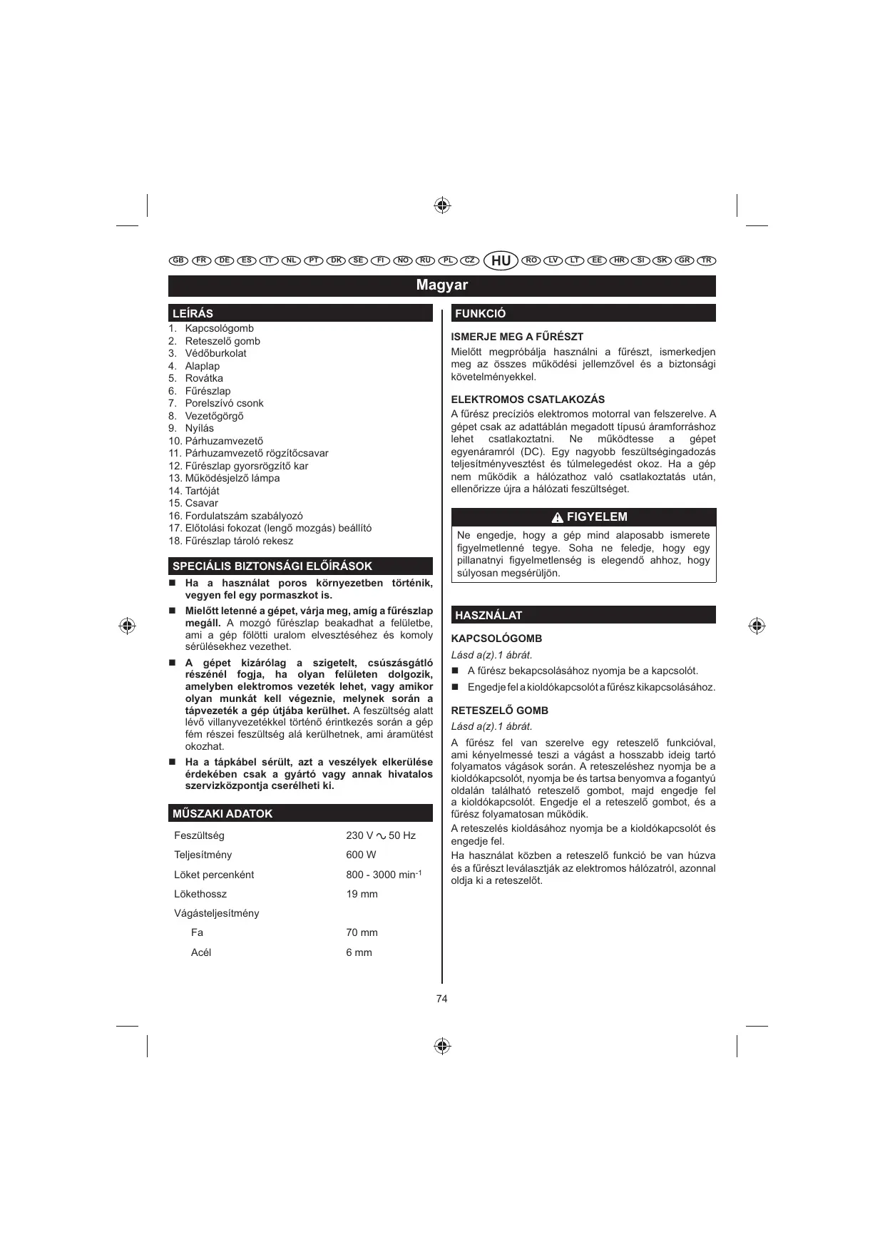 A f«rész precíziós elektromos motorral van felszerelve. A gépet csak az adattáblán megadott típusú áramforráshoz lehet csatlakoztatni. Ne m«ködtesse a gépet egyenáramról (DC). Egy nagyobb feszültségingadozás teljesítményvesztést és túlmelegedést okoz. Ha a gép nem m«ködik a hálózathoz való csatlakoztatás után, ellen}rizze újra a hálózati feszültséget. FIGYELEM Ne engedje, hogy a gép mind alaposabb ismerete "gyelmetlenné tegye. Soha ne feledje, hogy egy pillanatnyi "gyelmetlenség is elegend} ahhoz, hogy súlyosan megsérüljön. SPECIÁLIS BIZTONSÁGI ELPÍRÁSOK Ha a használat poros környezetben történik, vegyen fel egy pormaszkot is. MielQtt letenné a gépet, várja meg, amíg a fRrészlap megáll. A mozgó f«részlap beakadhat a felületbe, ami a gép fölötti uralom elvesztéséhez és komoly sérülésekhez vezethet. HASZNÁLAT KAPCSOLÓGOMB Lásd a(z).1 ábrát. A gépet kizárólag a szigetelt, csúszásgátló részénél fogja, ha olyan felületen dolgozik, amelyben elektromos vezeték lehet, vagy amikor olyan munkát kell végeznie, melynek során a tápvezeték a gép útjába kerülhet. A feszültség alatt lév} villanyvezetékkel történ} érintkezés során a gép fém részei feszültség alá kerülhetnek, ami áramütést okozhat. A f«rész bekapcsolásához nyomja be a kapcsolót. Engedje fel a kioldókapcsolót a f«rész kikapcsolásához. RETESZELP GOMB Lásd a(z).1 ábrát. A f«rész fel van szerelve egy reteszel} funkcióval, ami kényelmessé teszi a vágást a hosszabb ideig tartó folyamatos vágások során. A reteszeléshez nyomja be a kioldókapcsolót, nyomja be és tartsa benyomva a fogantyú oldalán található reteszel} gombot, majd engedje fel a kioldókapcsolót. Engedje el a reteszel} gombot, és a f«rész folyamatosan m«ködik. A reteszelés kioldásához nyomja be a kioldókapcsolót és engedje fel. Ha használat közben a reteszel} funkció be van húzva és a f«részt leválasztják az elektromos hálózatról, azonnal oldja ki a reteszel}t. Ha a tápkábel sérült, azt a veszélyek elkerülése érdekében csak a gyártó vagy annak hivatalos szervizközpontja cserélheti ki. MSSZAKI ADATOK Feszültség 230 V Teljesítmény 600 W 50 Hz Löket percenként
