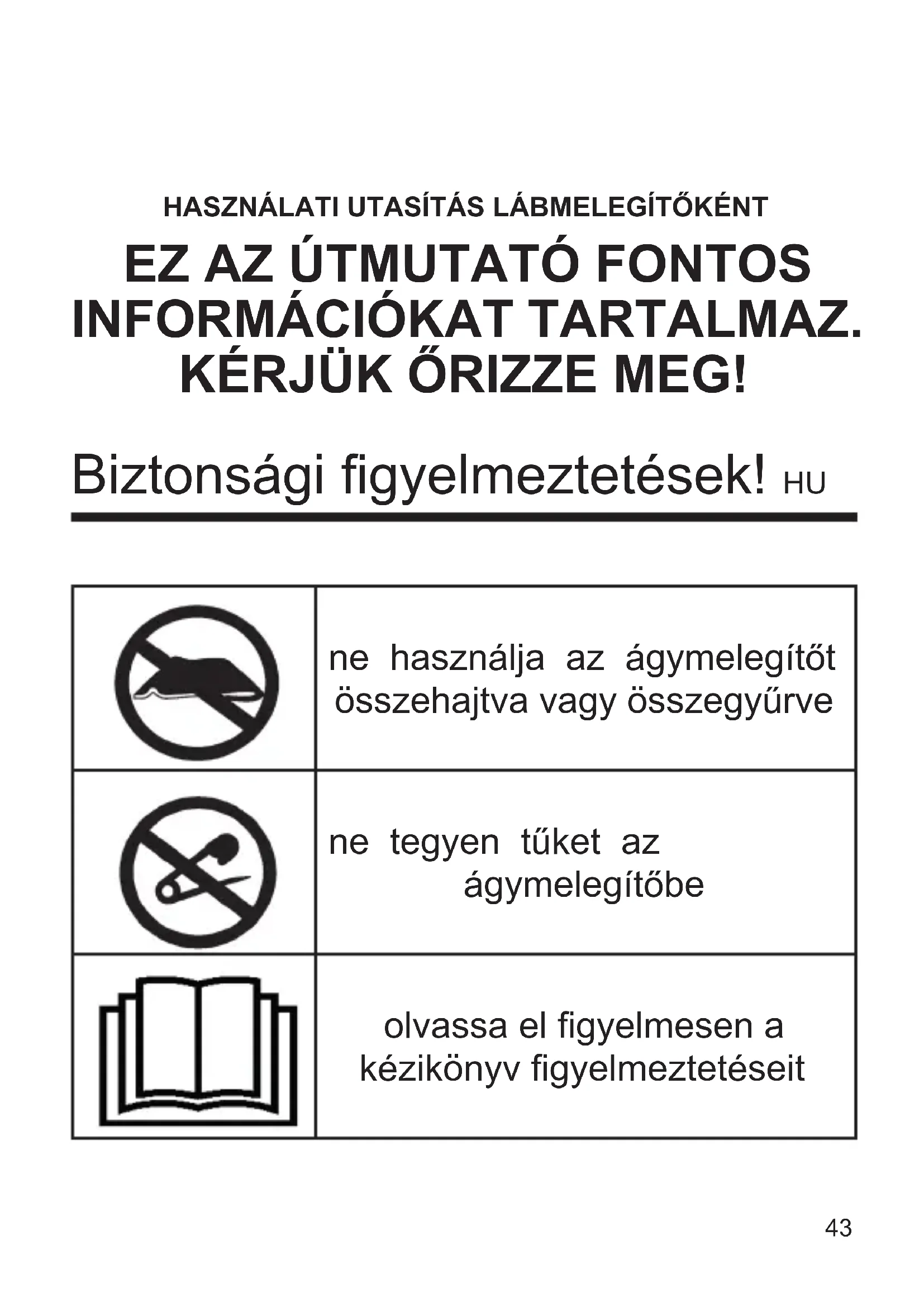 INFORMÁCIÓKAT TARTALMAZ. KÉRJÜK ŐRIZZE MEG! ne használja az ágymelegítőt összehajtva vagy összegyűrve ne tegyen tűket az ágymelegítőbe olvassa el gyelmesen a kézikönyv gyelmeztetéseit Biztonsági gyelmeztetések! HU44 Beteg személyek, gyermekek, hőre érzékenyek, vagy egyéb módon sérülékeny személyek, illetve mindazok, akik a túlmelegedésre, túlzott melegre képtelen reagálni, ne használják a készüléket. A készüléket 8 évnél idősebb gyermekek és csökkent zikai, érzéki vagy szellemi képességű, vagy tapasztalattal illetve a szükséges ismeretekkel nem rendelkező személyek is használhatják, ha felügyelet alatt állnak vagy oktatásban részesültek a készülék biztonságos használatáról és megértették a használattal járó kockázatokat. Gyermekek ne játsszanak a készülékkel. A felhasználó által elvégzendő tisztítást és karbantartást nem végezhetik gyermekek, hacsak nem állnak felügyelet alatt. Ne használja, ha a készülék nedves vagy vizes. A készülék magas hőfokra beállított, hosszantartó alkalmazása égési sérüléseket okozhat a bőrön. A készülék folyamatos vagy hosszantartó alkalmazása esetén, például olyan felhasználó által, aki időközben elalszik, a vezérlőeszközt az 1. pozícióba állítsa be, hogy elkerülje az égési sérüléseket. Azonban próbáljon meg nem elaludni a készülék használata közben.45 Ha a készüléket nem használja, akkor az eredeti csomagolásban és száraz és tiszta helyen tárolja. Ne tegyen rá súlyt. Tárolás során egyéb tárgyakat ráhelyezve ne ráncolja össze és/vagy ne deformálja a készüléket. A készülék nem igényel különösebb karbantartást. Elegendő a készülék gyakori ellenőrzése, hogy észlelni tudja a csővezeték és a vezérlőegység esetleges kopásának vagy elhasználódásának jeleit. Kopás vagy elhasználódás észlelése vagy helytelen kezelés esetén vigye vissza a készüléket a viszonteladóhoz mielőtt tovább használná. Ha a hálózati kábel sérült, akkor ki kell cserélni. Ehhez kizárólag csak a gyártó által megbízott szervizközpontokhoz forduljon. A készülék karbantartásával és megfelelő tárolásával kapcsolatosan lásd a Karbantartás szakaszt. Várandós anyák, cukorbetegek, pacemakerrel rendelkezők kérjék ki orvosuk tanácsát a készülék használata előtt. A készüléket úgy tervezték és gyártották, hogy otthoni környezetben lábmelegítőként funkcionáljon; ezért minden egyéb46 A vásárláskor kapott számlát, a jótállást és a használati útmutatót őrizze meg esetleges későbbi felhasználásra. A csomagolás eltávolítása után győződjön meg arról, hogy a készüléken nem található sérülés. Látható sérülés esetén, ne használja azt, minden esetben forduljon szakemberhez. A csomagolás egyes részeit ne hagyja kisgyermek számára elérhető helyen. A készülék nem gyerekjáték, elektromos berendezés, ezért fontos a biztonsági előírások betartása. A csatlakoztatás előtt győződjön meg arról, hogy a hálózati feszültség megegyezik-e a készülék adattábláján található adatokkal. Ha a hálózati csatlakozó nem megfelelő, ezt csak hozzáértő, képzett szakember által lehet kicserélni. Ne használjon olyan adaptert vagy hosszabbító kábelt, amely nem felel meg a biztonsági előírásoknak vagy nem rendelkezik a készülék áramellátáshoz szükséges kapacitással. Amikor a készülék nincs használatban, húzza ki a hálózati csatlakozóból. Ne rántsa meg erősen a kábelt vagy magát a készüléket a csatlakozó hálózatból való eltávolításához. Az elektromos készülékekre vonatkozóan vannak bizonyos általános szabályok, melyek betartása minden esetben kötelező: - Soha ne érintse a készüléket vizes vagy nedves kézzel! - Ne tegye ki a készüléket szélsőséges időjárásnak (eső, napsütés)! használat nem rendeltetésszerűnek, és mint ilyen, veszélyesnek minősül. Ne használja a készüléket a bélés nélkül. Ne használja a készüléket állatok melegítésére. A készülék használata előtt vegye le a cipőjét A készülék nem alkalmas kórházban való használatra. Amikor elteszi a készüléket, először hagyja lehűlni.47 Karbantartás Húzza ki a dugót az elektromos hálózatból és hagyja lehűlni mielőtt megkezdi a karbantartást. A tisztításhoz használjon puha vagy enyhén nedves kendt. Ne használjon folyadékot vagy túl nedves rongyot, mert ez károsíthatja a készüléket. Ne tisztítsa szárazon. Ne használjon vegyi oldószereket, mert ezek károsíthatják a készüléket és veszélyeztethetik a biztonságot. SOHA NE MERÍTSE VÍZBE A KÉSZÜLÉKET! Ne tegye el illetve ne használja a készüléket addig, amíg az teljesen meg nem szárad. Használati utmutató Illessze a villásdugót a fali csatlakozóba. Kapcsolja be a készüléket az ON/OFF gombot néhány másodpercig lenyomva tartva. A készülék automatikusan 3-as pozícióban kapcsol be. A fűtési pozíció módosításához egymást követően nyomja meg a TEMP gombot, amíg el nem éri a kívánt szintet 1 és 6 között. Használat előtt melegítse elő a készüléket 6-os pozícióban az első 10 percig, majd ezt követően állítsa a kívánt pozícióba. Hosszú ideig tartó vagy folyamatos használat esetén 1-es pozícióban üzemeltesse a készüléket, a bőr égési sérüléseinek megakadályozása érdekében. 90 perces üzemelés után a készülék automatikusan kikapcsol. Ha a képernyőn megjelenik a P vagy E szimbólum, azt jelenti, hogy a készülék meghibásodott. A készülék kikapcsolásához nyomja meg 3 másodpercre az ON/OFF gombot. - Ne tegye ki a berendezést erős ütésnek. A veszélyes túlmelegedés elkerülése érdekében ajánlatos a hálózati kábelt teljes hosszában kiteríteni. Rendellenesség, biztosíték ki