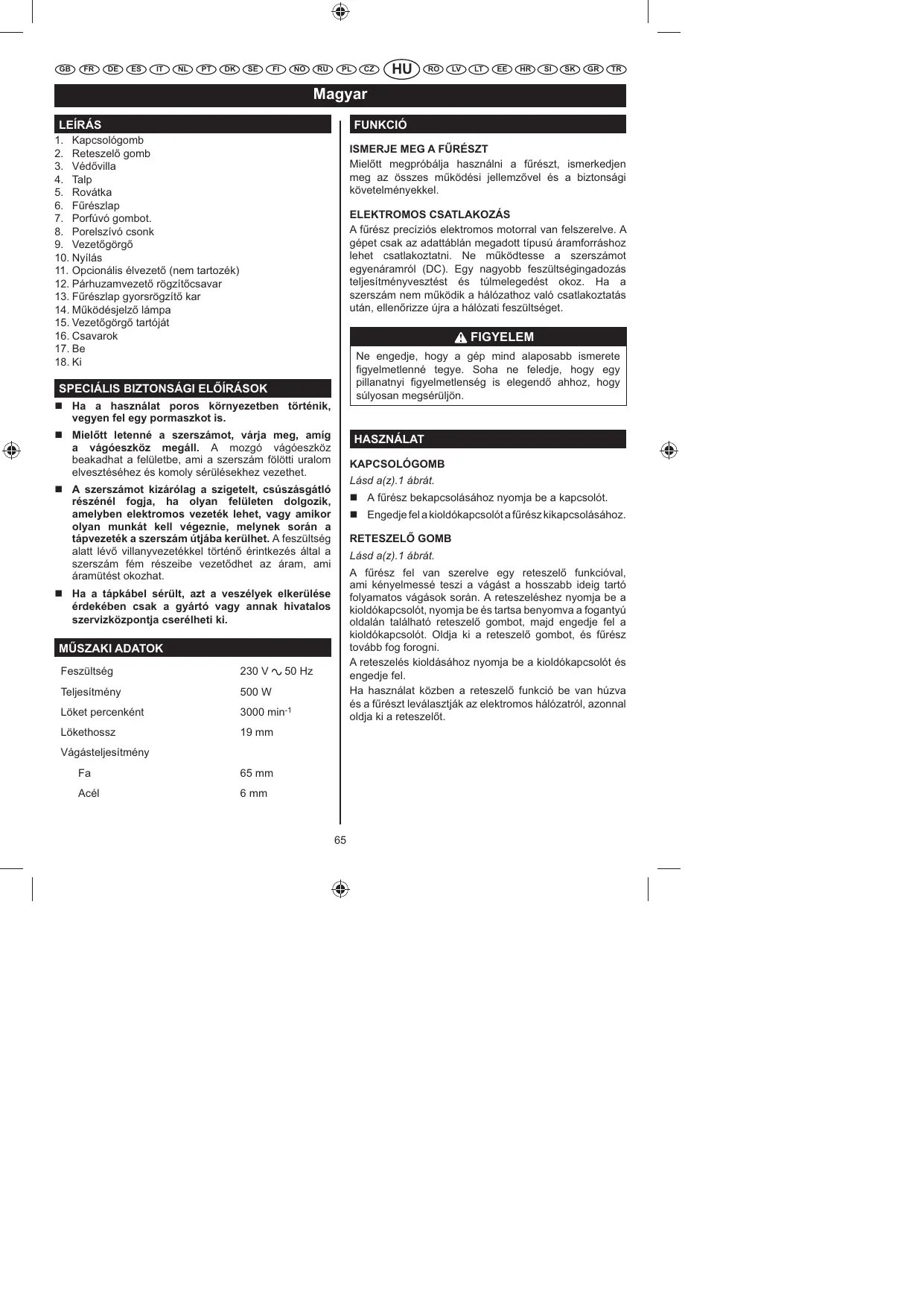 Magyar Vágásteljesítmény fa CE megfelel·ség Kett·s szigetelés Viseljen fülvéd·t Viseljen szemvéd·t A gép bekapcsolása el·tt >gyelmesen olvassa el a használati útmutatót. A kiselejtezett elektromos termékeket nem szabad a háztartási hulladékkal együtt kidobni. Hasznosítsa újra, ha van rá lehet·ség. Az újrahasznosítással kapcsolatban érdekl·djön a helyi önkormányzatnál vagy a termék forgalmazójánál.