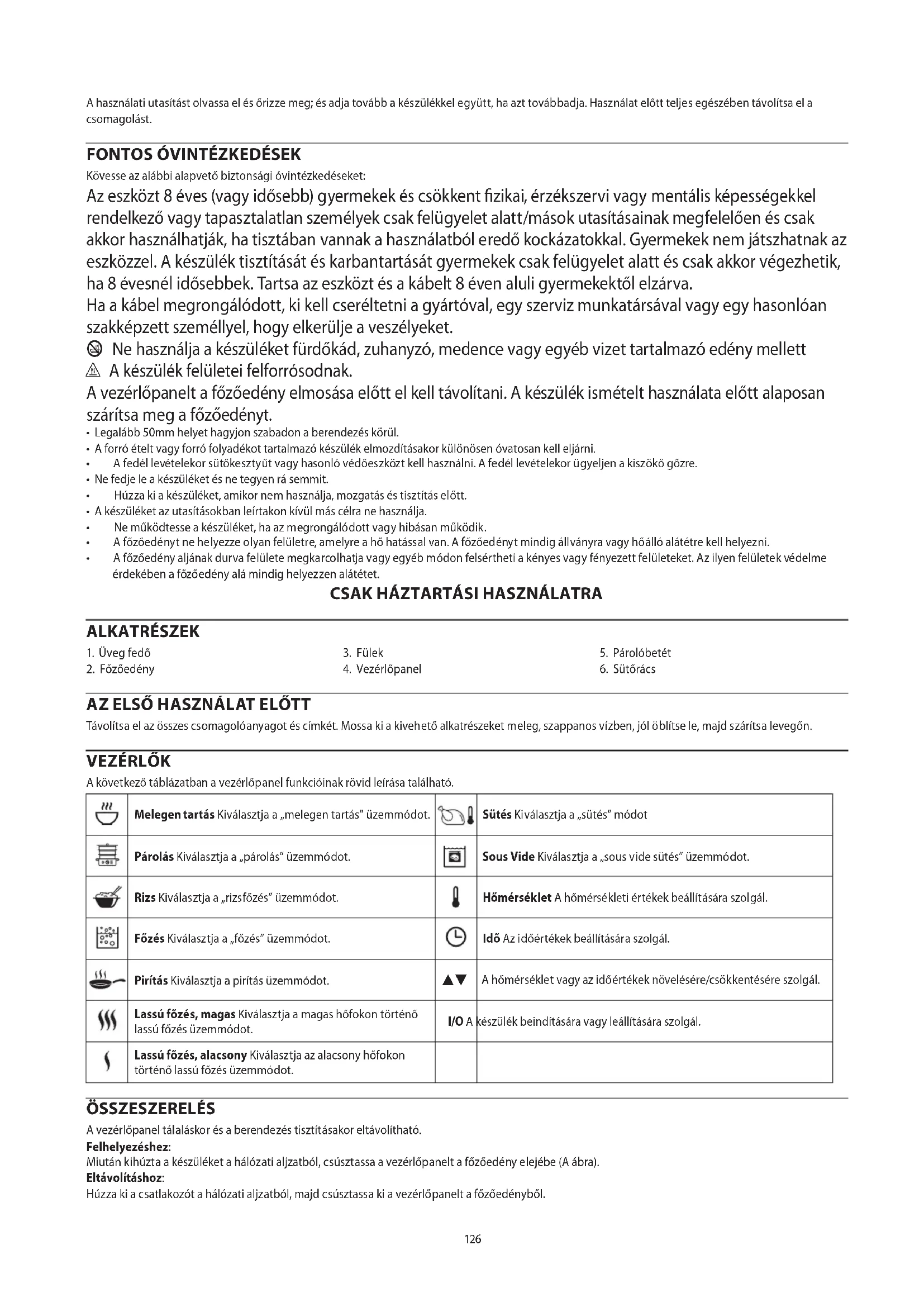 Kövesse az alábbi alapvető biztonsági óvintézkedéseket: Az eszközt 8 éves (vagy idősebb) gyermekek és csökkent zikai, érzékszervi vagy mentális képességekkel rendelkező vagy tapasztalatlan személyek csak felügyelet alatt/mások utasításainak megfelelően és csak akkor használhatják, ha tisztában vannak a használatból eredő kockázatokkal. Gyermekek nem játszhatnak az eszközzel. A készülék tisztítását és karbantartását gyermekek csak felügyelet alatt és csak akkor végezhetik, ha 8 évesnél idősebbek. Tartsa az eszközt és a kábelt 8 éven aluli gyermekektől elzárva. Ha a kábel megrongálódott, ki kell cseréltetni a gyártóval, egy szerviz munkatársával vagy egy hasonlóan szakképzett személlyel, hogy elkerülje a veszélyeket. b Ne használja a készüléket fürdőkád, zuhanyzó, medence vagy egyéb vizet tartalmazó edény mellett ¬ A készülék felületei felforrósodnak. A vezérlőpanelt a főzőedény elmosása előtt el kell távolítani. A készülék ismételt használata előtt alaposan szárítsa meg a főzőedényt.