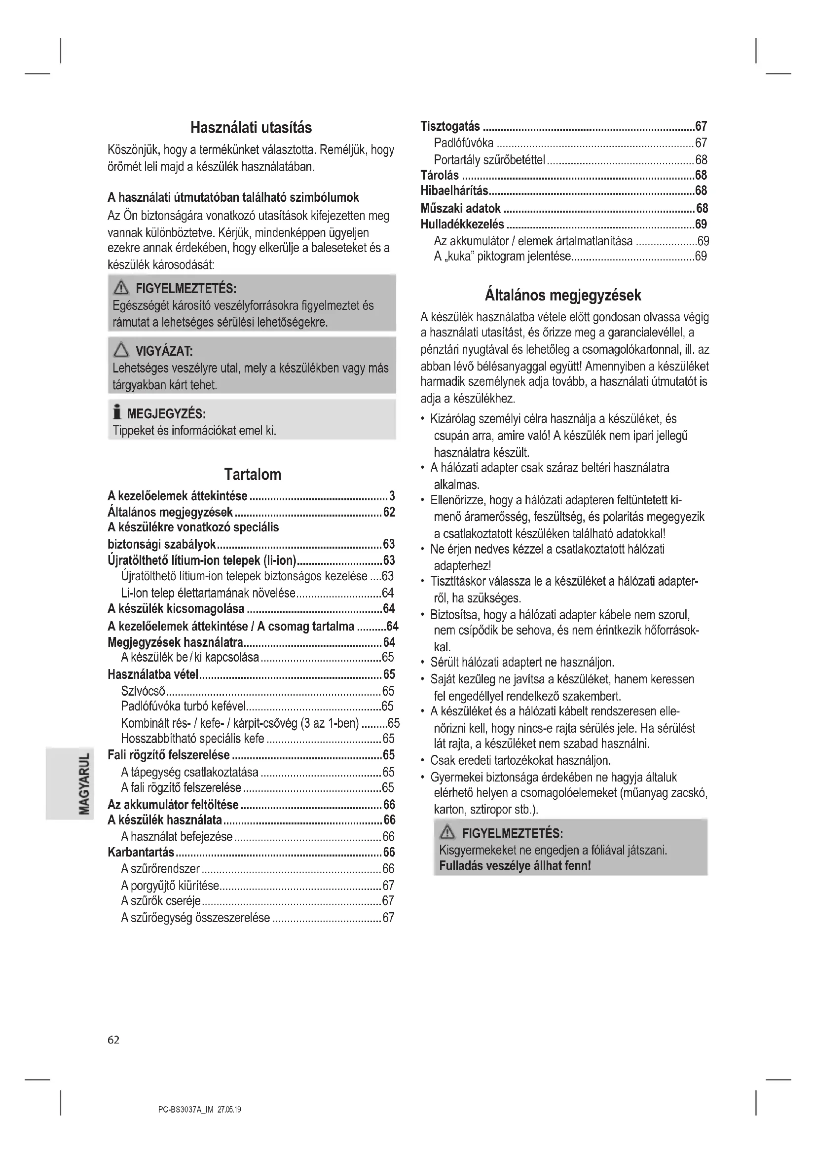 Hulladékkezelés Az akkumulátor / elemek ártalmatlanítása A készülékben akkumulátor található. A hasz- nált elemek / akkumulátorok nem tartoznak a háztartási hulladékhoz. Az akkumulátort a termék újrahasznosítása után el kell távolítani. Nyomja meg a kioldóre- teszt (6), és vegye ki az újratölthető telepcsomagot a kézi készülékből. Az akkumulátorok ártalmatlanítására szolgáló helyekkel kapcsolatos információ a helyi önkormányzattól szerezhető be. A „kuka” piktogram jelentése Kímélje környezetünket, az elektromos készü- lékek nem a háztartási szemétbe valók! Használja az elektromos készülékek ártalmat- lanítására kijelölt gyűjtőhelyeket, ott adja le azokat az elektromos készülékeit, amelyeket többé már nem kíván használni! Ezzel segítséget nyújt ahhoz, hogy elkerülhetők legyenek azok a hatások, amelyeket a helytelen „szemétre dobás” gyakorolhat a környezetre és az emberi egészségre. Ezzel hozzájárul az újrahasznosításhoz, a recyclinghoz és a kiöregedett elektromos és elektronikus készülékek értéke- sítésének egyéb formáihoz. Az önkormányzatoknál vagy a polgármesteri hivatalokban tájékoztatást kaphat arról, hogy hova viheti a kiselejtezett készülékeket.PC-BS3037A_IM 27.05.19