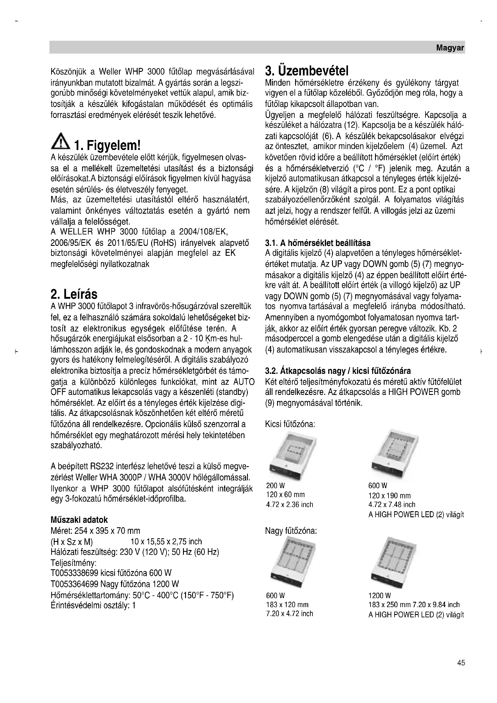 A készülék üzembevétele elŒtt kérjük, figyelmesen olvas- sa el a mellékelt üzemeltetési utasítást és a biztonsági elŒírásokat.A biztonsági elŒírások figyelmen kívül hagyása esetén sérülés- és életveszély fenyeget. Más, az üzemeltetési utasítástól eltérŒ használatért, valamint önkényes változtatás esetén a gyártó nem vállalja a felelŒsséget. A WELLER WHP 3000 fıtŒlap a 2004/108/EK, 2006/95/EK és 2011/65/EU (RoHS) irányelvek alapvetŒ biztonsági követelményei alapján megfelel az EK megfelelŒségi nyilatkozatnak