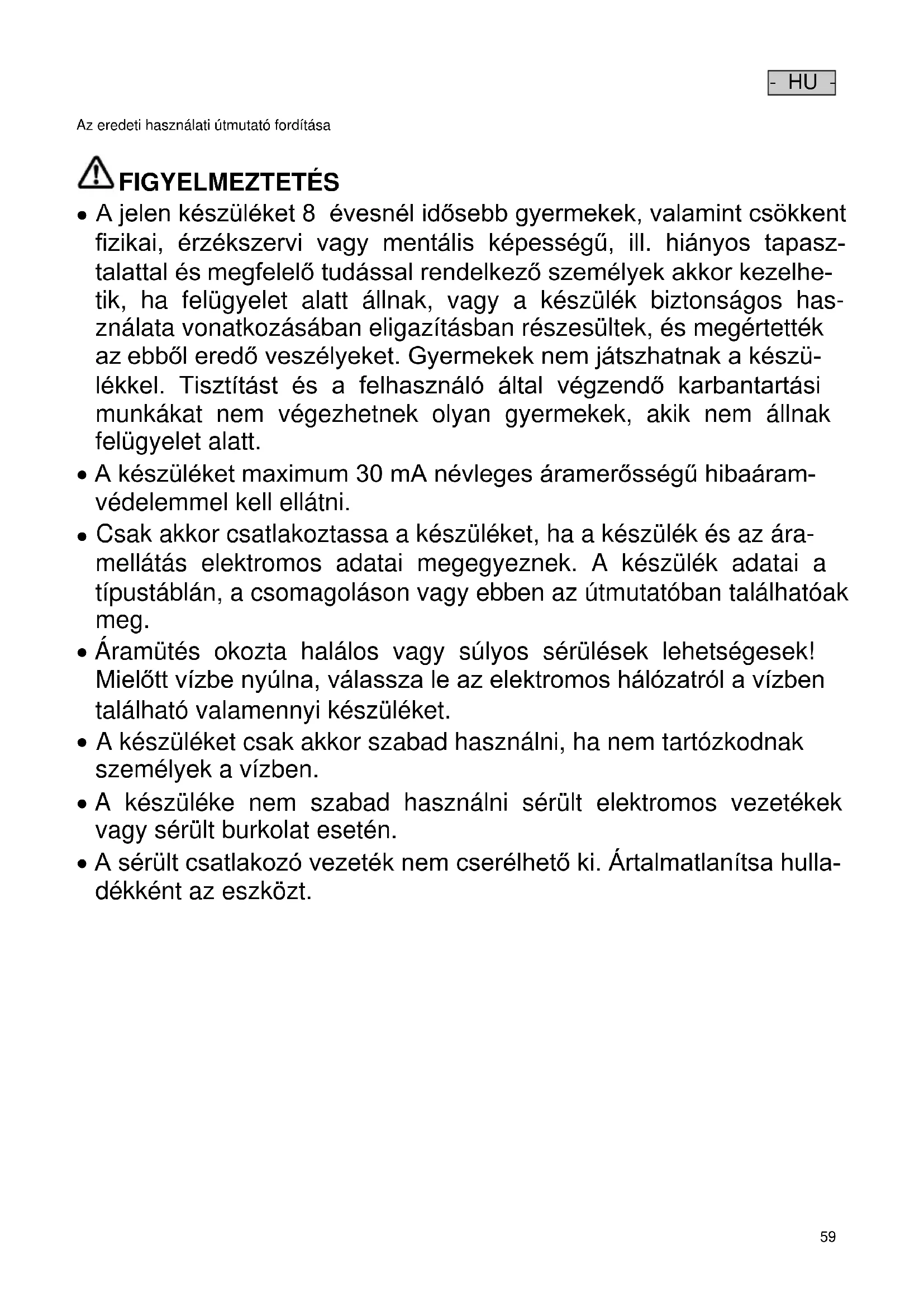 A készüléket csak akkor szabad használni, ha nem tartózkodnak személyek a vízben. A készüléke nem szabad használni sérült elektromos vezetékek vagy sérült burkolat esetén. A sérült csatlakozó vezeték nem cserélhető ki. Ártalmatlanítsa hulla- dékként az eszközt.- HU -