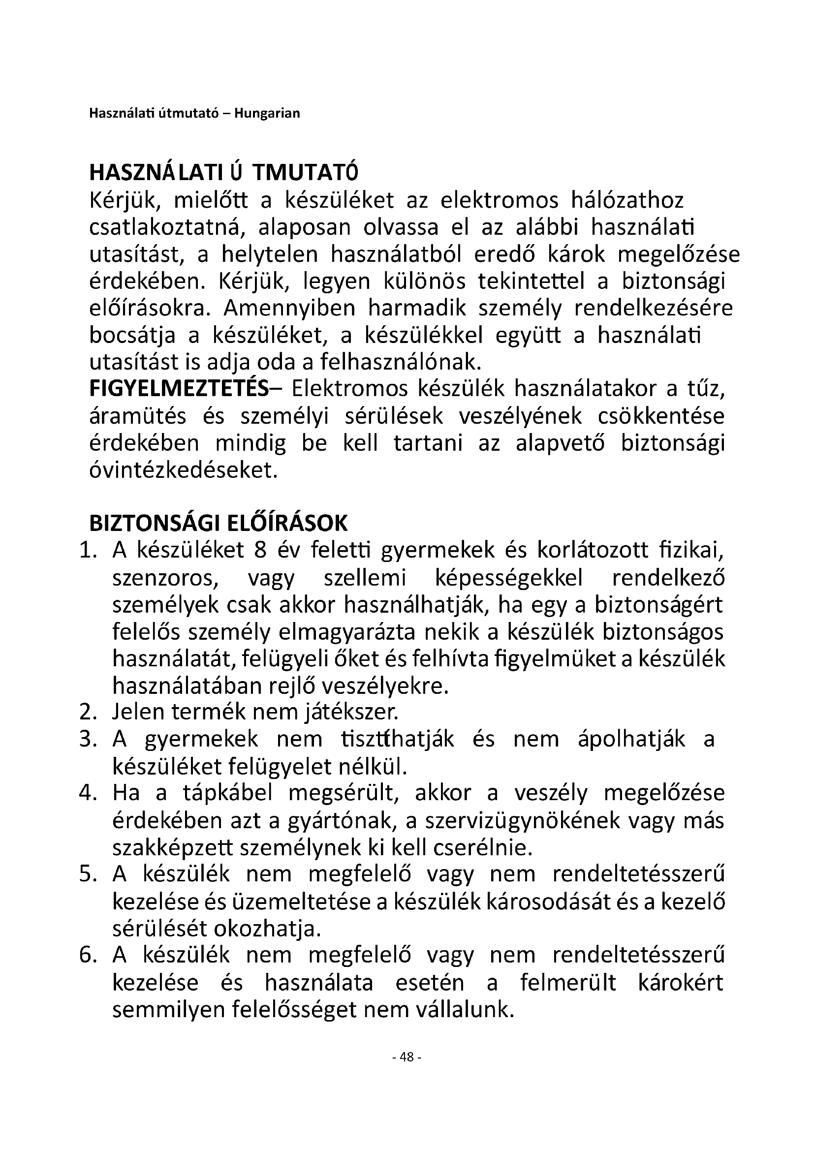 Kérjük, mielőtt a készüléket az elektromos hálózathoz csatlakoztatná, alaposan olvassa el az alábbi használati utasítást, a helytelen használatból eredő károk megelőzése érdekében. Kérjük, legyen különös tekintettel a biztonsági előírásokra. Amennyiben harmadik személy rendelkezésére bocsátja a készüléket, a készülékkel együtt a használati utasítást is adja oda a felhasználónak. FIGYELMEZTETÉS– Elektromos készülék használatakor a tűz, áramütés és személyi sérülések veszélyének csökkentése érdekében mindig be kell tartani az alapvető biztonsági óvintézkedéseket.